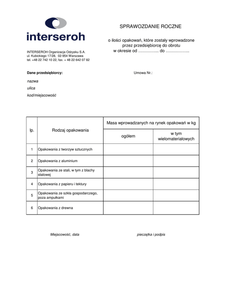 SPRAWOZDANIE ROCZNE INTERSEROH Organizacja Odzysku S.A. ul. Kubickiego 17/28, 02-954 Warszawa tel. +48 22 742 10 22, fax. + 48 22 642 07 82 Dane przedsiębiorcy: o ilości opakowań, które zostały wprowadzone przez przedsiębiorcę do obrotu w okresie od …………... do …………….. Umowa Nr.: nazwa ulica kod/miejscowość Masa wprowadzanych na rynek opakowań w kg lp. Rodzaj opakowania ogółem 1 Opakowania z tworzyw sztucznych 2 Opakowania z aluminium 3 Opakowania ze stali, w tym z blachy stalowej 4 Opakowania z papieru i tektury 5 Opakowania ze szkła gospodarczego, poza ampułkami 6 Opakowania z drewna Miejscowość, data w tym wielomateriałowych pieczątka i podpis