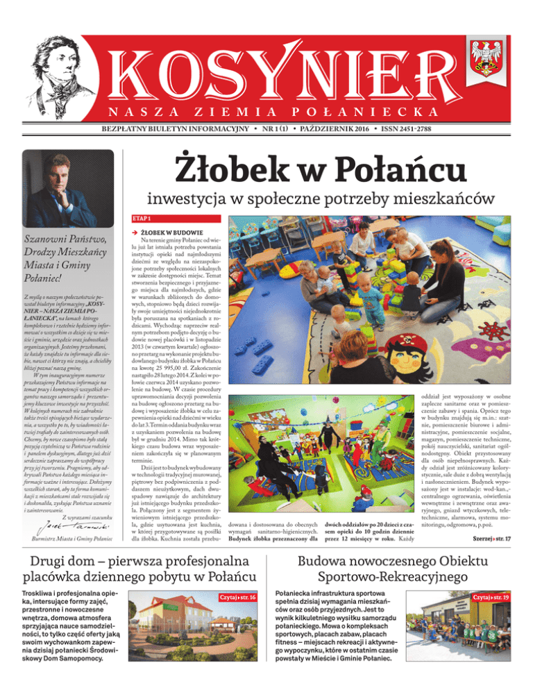 N A S Z A Z I E M I A P O Ł A N I E C K A BEZPŁATNY BIULETYN INFORMACYJNY • NR 1 (1) • PAŹDZIERNIK 2016 • ISSN 2451-2788 Żłobek w Połańcu inwestycja w społeczne potrzeby mieszkańców ETAP 1 Szanowni Państwo, Drodzy Mieszkańcy Miasta i Gminy Połaniec! Z myślą o naszym społeczeństwie powstał biuletyn informacyjny „KOSYNIER – NASZA ZIEMIA POŁANIECKA”, na łamach którego kompleksowo i rzetelnie będziemy informować o wszystkim co dzieje się w mieście i gminie, urzędzie oraz jednostkach organizacyjnych. Jesteśmy przekonani, że każdy znajdzie tu informacje dla siebie, nawet ci którzy nie znają, a chcieliby bliżej poznać naszą gminę. W tym inauguracyjnym numerze przekazujemy Państwu informacje na temat pracy i kompetencji wszystkich organów naszego samorządu i prezentujemy kluczowe inwestycje na przyszłość. W kolejnych numerach nie zabraknie także treści opisujących bieżące wydarzenia, a wszystko po to, by wiadomości łatwiej trafiały do zainteresowanych osób. Chcemy, by nowe czasopismo było stałą pozycją czytelniczą w Państwa rodzinie i panelem dyskusyjnym, dlatego już dziś serdecznie zapraszamy do współpracy przy jej tworzeniu. Pragniemy, aby odkrywali Państwo każdego miesiąca informacje ważne i interesujące. Dołożymy wszelkich starań, aby ta forma komunikacji z mieszkańcami stale rozwijała się i doskonaliła, zyskując Państwa uznanie i zainteresowanie. Z wyrazami szacunku Burmistrz Miasta i Gminy Połaniec ÎÎ ŻŁOBEK W BUDOWIE Na terenie gminy Połaniec od wielu już lat istniała potrzeba powstania instytucji opieki nad najmłodszymi dziećmi ze względu na niezaspokojone potrzeby społeczności lokalnych w zakresie dostępności miejsc. Temat stworzenia bezpiecznego i przyjaznego miejsca dla najmłodszych, gdzie w warunkach zbliżonych do domowych, stopniowo będą dzieci rozwijały swoje umiejętności niejednokrotnie była poruszana na spotkaniach z rodzicami. Wychodząc naprzeciw realnym potrzebom podjęto decyzję o budowie nowej placówki i w listopadzie 2013 (w czwartym kwartale) ogłoszono przetarg na wykonanie projektu budowlanego budynku żłobka w Połańcu na kwotę 25 995,00 zł. Zakończenie nastąpiło 28 lutego 2014. Z kolei w połowie czerwca 2014 uzyskano pozwolenie na budowę. W czasie procedury uprawomocniania decyzji pozwolenia na budowę ogłoszono przetarg na budowę i wyposażenie żłobka w celu zapewnienia opieki nad dziećmi w wieku do lat 3.Termin oddania budynku wraz z uzyskaniem pozwolenia na budowę był w grudniu 2014. Mimo tak krótkiego czasu budowa wraz wyposażeniem zakończyła się w planowanym terminie. Dziś jest to budynek wybudowany w technologii tradycyjnej murowanej, piętrowy bez podpiwniczenia z poddaszem nieużytkowym, dach dwuspadowy nawiązuje do architektury już istniejącego budynku przedszkola. Połączony jest z segmentem żywieniowym istniejącego przedszkola, gdzie usytuowana jest kuchnia, w której przygotowywane są posiłki dla żłobka. Kuchnia została przebu- dowana i dostosowana do obecnych wymagań sanitarno-higienicznych. Budynek żłobka przeznaczony dla Drugi dom – pierwsza profesjonalna placówka dziennego pobytu w Połańcu Troskliwa i profesjonalna opieka, intersujące formy zajęć, przestronne i nowoczesne wnętrza, domowa atmosfera sprzyjająca nauce samodzielności, to tylko część oferty jaką swoim wychowankom zapewnia dzisiaj połaniecki Środowiskowy Dom Samopomocy. Czytaj str. 16 dwóch oddziałów po 20 dzieci z czasem opieki do 10 godzin dziennie przez 12 miesięcy w roku. Każdy oddział jest wyposażony w osobne zaplecze sanitarne oraz w pomieszczenie zabawy i spania. Oprócz tego w budynku znajdują się m.in.: szatnie, pomieszczenie biurowe i administracyjne, pomieszczenie socjalne, magazyn, pomieszczenie techniczne, pokój nauczycielski, sanitariat ogólnodostępny. Obiekt przystosowany dla osób niepełnosprawnych. Każdy odział jest zróżnicowany kolorystycznie, sale duże z dobrą wentylacją i nasłonecznieniem. Budynek wyposażony jest w instalacje: wod-kan.,centralnego ogrzewania, oświetlenia wewnętrzne i zewnętrzne oraz awaryjnego, gniazd wtyczkowych, teletechniczne, alarmowa, systemu monitoringu, odgromowa, p.poż. Szerzej str. 17 Budowa nowoczesnego Obiektu Sportowo-Rekreacyjnego Połaniecka infrastruktura sportowa spełnia dzisiaj wymagania mieszkańców oraz osób przyjezdnych. Jest to wynik kilkuletniego wysiłku samorządu połanieckiego. Mowa o kompleksach sportowych, placach zabaw, placach fitness – miejscach rekreacji i aktywnego wypoczynku, które w ostatnim czasie powstały w Mieście i Gminie Połaniec. Czytaj str. 19 2 BEZPŁATNY BIULETYN INFORMACYJNY • NR 1 (1) • PAŹDZIERNIK 2016 Gmina jako podstawowa jednostka samorządu terytorialnego odpowiada za wszystkie sprawy, które zgodnie z założeniami ustawy o samorządzie gminnym mogą się przysłużyć „zaspokojeniu zbiorowych potrzeb wspólnoty”, m.in.: • budowę i utrzymanie infrastruktury drogowej, parków, skwerów i obiektów rekreacyjnych, • usługi komunalne: dostarczenie wody, ciepła, organizowanie transportu publicznego, odbioru odpadów komunalnych. Gmina zarządza przedsiębiorstwami zajmującymi się zapewnieniem usług komunalnych, Każda jednostka samorządu terytorialnego posiada organ stanowiący i wykonawczy: ORGAN STANOWIĄCY I KONTROLNY WSPÓLNOTY SAMORZĄDOWEJ Miasto i Gmina Połaniec – wspólnota samorządowa, obejmująca wszystkich mieszkańców Mieszkańcy Miasta i Gminy Połaniec są społecznością liczącą 11998 osób, w tym 5967 mężczyzn i 6031 kobiet (stan na dzień 30.09.2016 r.) posiada również udziały w spółkach komunalnych, organizuje przetargi, w których wyłania prywatne firmy zajmujące się m.in.; odbieraniem odpadów od mieszkańców czy remontami lokalnych dróg, Radni Rady Miejskiej Józef Cichoń, Małgorzata Magdalena DalmataKonwicka, Tomasz Benedykt Kiciński, Adam Łańka, Je