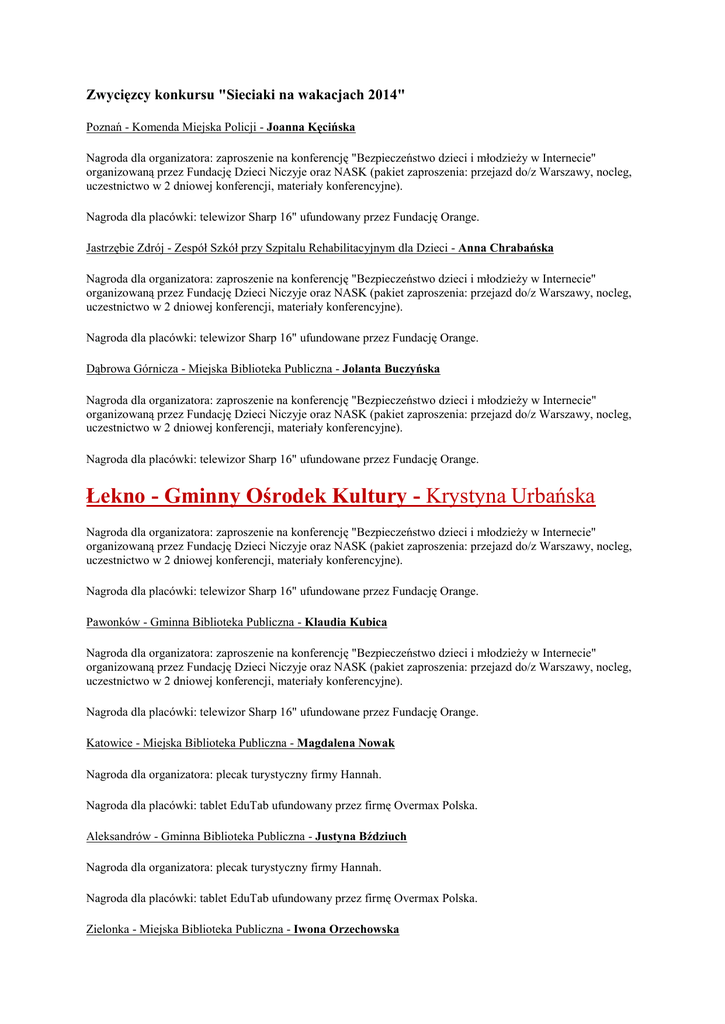 Zwycięzcy konkursu "Sieciaki na wakacjach 2014" Poznań - Komenda Miejska Policji - Joanna Kęcińska Nagroda dla organizatora: zaproszenie na konferencję "Bezpieczeństwo dzieci i młodzieży w Internecie" organizowaną przez Fundację Dzieci Niczyje oraz NASK (pakiet zaproszenia: przejazd do/z Warszawy, nocleg, uczestnictwo w 2 dniowej konferencji, materiały konferencyjne). Nagroda dla placówki: telewizor Sharp 16" ufundowany przez Fundację Orange. Jastrzębie Zdrój - Zespół Szkół przy Szpitalu Rehabilitacyjnym dla Dzieci - Anna Chrabańska Nagroda dla organizatora: zaproszenie na konferencję "Bezpieczeństwo dzieci i młodzieży w Internecie" organizowaną przez Fundację Dzieci Niczyje oraz NASK (pakiet zaproszenia: przejazd do/z Warszawy, nocleg, uczestnictwo w 2 dniowej konferencji, materiały konferencyjne). Nagroda dla placówki: telewizor Sharp 16" ufundowane przez Fundację Orange. Dąbrowa Górnicza - Miejska Biblioteka Publiczna - Jolanta Buczyńska Nagroda dla organizatora: zaproszenie na konferencję "Bezpieczeństwo dzieci i młodzieży w Internecie" organizowaną przez Fundację Dzieci Niczyje oraz NASK (pakiet zaproszenia: przejazd do/z Warszawy, nocleg, uczestnictwo w 2 dniowej konferencji, materiały konferencyjne). Nagroda dla placówki: telewizor Sharp 16" ufundowane przez Fundację Orange. Łekno - Gminny Ośrodek Kultury - Krystyna Urbańska Nagroda dla organizatora: zaproszenie na konferencję "Bezpieczeństwo dzieci i młodzieży w Internecie" organizowaną przez Fundację Dzieci Niczyje oraz NASK (pakiet zaproszenia: przejazd do/z Warszawy, nocleg, uczestnictwo w 2 dniowej konferencji, materiały konferencyjne). Nagroda dla placówki: telewizor Sharp 16" ufundowane przez Fundację Orange. Pawonków - Gminna Biblioteka Publiczna - Klaudia Kubica Nagroda dla organizatora: zaproszenie na konferencję "Bezpieczeństwo dzieci i młodzieży w Internecie" organizowaną przez Fundację Dzieci Niczyje oraz NASK (pakiet zaproszenia: przejazd do/z Warszawy, nocleg, uczestnictwo w 2 dniowej konferencji, materiały konferencyjne). Nagroda dla placówki: telewizor Sharp 16" ufundowane przez Fundację Orange. Katowice - Miejska Biblioteka Publiczna - Magdalena Nowak Nagroda dla organizatora: plecak turystyczny firmy Hannah. Nagroda dla placówki: tablet EduTab ufundowany przez firmę Overmax Polska. Aleksandrów - Gminna Biblioteka Publiczna - Justyna Bździuch Nagroda dla organizatora: plecak turystyczny firmy Hannah. Nagroda dla placówki: tablet EduTab ufundowany przez firmę Overmax Polska. Zielonka - Miejska Biblioteka Publiczna - Iwona Orzechowska Nagroda dla organizatora: kijki do Nordic Walking. Nagroda dla placówki: tablet EduTab ufundowany przez firmę Overmax Polska. Leszno - Terenowy Komitet Ochrony Praw Dziecka - Karolina Dobrzycka Nagroda dla organizatora: kijki do Nordic Walking. Nagroda dla placówki: tablet EduTab ufundowany przez firmę Overmax Polska. Mrozy - Gminna Biblioteka Publiczna - Joanna Ługowska Nagroda dla organizatora: kijki do Nordic Walking. Nagroda dla placówki: zestaw 85 pozycji książek i materiałów edukacyjnych z serii Czuczu ufundowany przez Wyd. Junior HanBright. Korsze - Miejsko-Gminna Biblioteka Publiczna - Elżbieta Kozłowska Nagroda dla organizatora: kijki do Nordic Walking. Nagroda dla placówki: zestaw 85 pozycji książek i materiałów edukacyjnych z serii Czuczu ufundowany przez Wyd. Junior HanBright. Katowice - Komenda Miejska Policji - Małgorzata Biernacka Nagroda dla organizatora: album "Janusz Korczak. Fotobiografia". Nagroda dla placówki: zestaw 13 gier komputerowych ufundowany przez Wydawnictwo Techland. Prusice - Gminna Biblioteka Publiczna - Dorota Olszańska Nagroda dla organizatora: album "Janusz Korczak. Fotobiografia". Nagroda dla placówki: zestaw 85 pozycji książek i materiałów edukacyjnych z serii Czuczu ufundowany przez Wyd. Junior HanBright. Opoczno - Poradnia Psychologiczno-Pedagogiczna - Iwona Chróstowska Nagroda dla organizatora: album "Janusz Korczak. Fotobiografia". Nagroda dla placówki: zestaw 85 pozycji książek i materiałów edukacyjnych z serii Czuczu ufundowany przez Wyd. Junior HanBright. Rypin - Miejsko-Powiatowa Biblioteka Publiczna - Elżbieta Kowalczyk Nagroda dla organizatora: album "Janusz Korczak. Fotobiografia". Nagroda dla placówki: zestaw 85 pozycji książek i materiałów edukacyjnych z serii Czuczu ufundowany przez Wyd. Junior HanBright. Złotoryja - Miejska Biblioteka Publiczna - Anna Gorgolewska Nagroda dla organizatora: album "Janusz Korczak. Fotobiografia". Nagroda dla placówki: zestaw 15 książek ufundowany przez Wydawnictwo Nasza Księgarnia. Czerniczyn - Biblioteka Publiczna - Malwina Filańska-Marcych Nagroda dla organizatora: odtwarzacz mp3. Nagroda dla placówki: zestaw 15 książek ufundowany przez Wydawnictwo Nasza Księgarnia. Naramice - Biblioteka Publiczna - Justyna Halusiak i Bożena Leszczyńska Nagroda dla organizatora: odtwarzacz mp3. Nagroda dla placówki: zestaw 13 gier komputerowych ufundowany przez Wydawnictwo Techland. Oświęcim - Miejska Biblioteka Publiczna - Katarzyna Heród Nagroda dla organizatora: odtwarzacz mp3. Nagroda dla placówki: zestaw 13 gier komputerowych ufundowany przez Wydawnictwo Techland. Krasocin - Gminna Biblioteka Publiczna - Anna Goszczyńska Nagroda dla organizatora: odtwarzacz mp3. Nagroda dla placówki: zestaw 15 książek ufundowany przez Wydawnictwo Nasza Księgarnia.