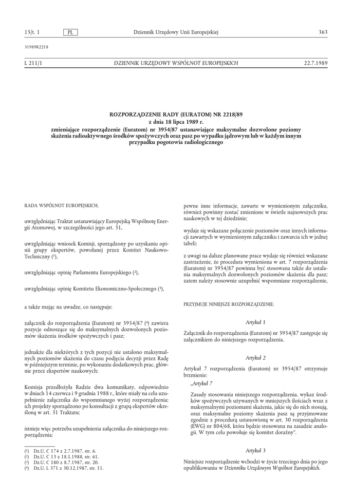 (EURATOM) NR 2218/89 z dnia 18 lipca 1989 r. zm