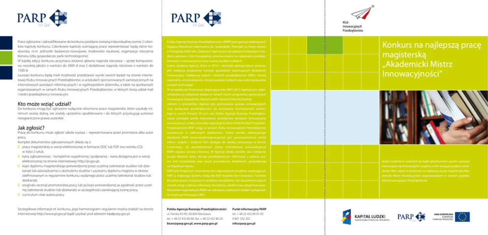 Prace zgłoszone i zakwalifikowane do konkursu poddane zostaną indywidualnej ocenie 2 członków kapituły konkursu. Członkowie kapituły oceniającej prace reprezentować będą różne środowiska, m.in. jednostki badawczo-rozwojowe, środowisko naukowe, organizacje otoczenia biznesu (izby gospodarcze, parki technologiczne). W każdej edycji konkursu przyznana zostanie główna nagroda rzeczowa – sprzęt komputerowy wysokiej jakości o wartości do 3000 zł oraz 2 dodatkowe nagrody rzeczowe o wartości do 1500 zł. Laureaci konkursu będą mieli możliwość przedstawić wyniki swoich badań na stronie internetowej Klubu Innowacyjnych Przedsiębiorstw, w artykułach sponsorowanych zamieszczonych na internetowych portalach informacyjnych i w ogólnopolskim dzienniku, a także na spotkaniach organizowanych w ramach Klubu Innowacyjnych Przedsiębiorstw, w których biorą udział mali i średni przedsiębiorcy innowacyjni. Kto może wziąć udział? Do konkursu mogą być zgłoszone wyłącznie obronione prace magisterskie, które uzyskały minimum ocenę dobrą, nie zostały uprzednio opublikowane i do których przysługują autorowi nieograniczone prawa autorskie. Jak zgłosić? Polska Agencja Rozwoju Przedsiębiorczości (PARP) jest agencją rządową podlegającą Ministrowi właściwemu ds. gospodarki. Powstała na mocy ustawy z 9 listopada 2000 roku. Zadaniem Agencji jest zarządzanie funduszami z budżetu państwa i Unii Europejskiej, przeznaczonymi na wspieranie przedsiębiorczości i innowacyjności oraz rozwój zasobów ludzkich. Celem działania Agencji, która w 2010 r. obchodzi dziesięciolecie istnienia, jest realizacja programów rozwoju gospodarki wspierających działalność innowacyjną i badawczą małych i średnich przedsiębiorstw (MSP), rozwój regionalny, wzrost eksportu, rozwój zasobów ludzkich oraz wykorzystywanie Konkurs na najlepszą pracę magisterską „Akademicki Mistrz Innowacyjności” nowych technologii. W perspektywie finansowej obejmującej lata 2007-2013 Agencja jest odpowiedzialna za wdrażanie działań w ramach trzech programów operacyjnych Innowacyjna Gospodarka, Kapitał Ludzki i Rozwój Polski Wschodniej. Jednym z priorytetów Agencji jest promowanie postaw innowacyjnych oraz zachęcanie przedsiębiorców do stosowania nowoczesnych technologii w swoich firmach. W tym celu Polska Agencja Rozwoju Przedsiębiorczości prowadzi portal internetowy poświęcony tematyce innowacyjnej www.pi.gov.pl, a także corocznie organizuje konkurs Polski Produkt Przyszłości. Przedstawiciele MSP mogą w ramach Klubu Innowacyjnych Przedsiębiorstw Pracę do konkursu może zgłosić szkoła wyższa – reprezentowana przez promotora albo autor pracy. Komplet dokumentów zgłoszeniowych składa się z: ■■ pracy magisterskiej w wersji elektronicznej w formacie DOC lub PDF (na nośniku CD) w ilości 2 sztuk, ■■ karty zgłoszeniowej – kompletnie wypełnionej i podpisanej – karta dostępna jest w wersji elektronicznej na stronie internetowej: http://pi.gov.pl, ■■ kopii dyplomu magisterskiego potwierdzonej przez uczelnię (sekretariat studiów lub dziekanat) lub zaświadczenia o ukończeniu studiów i uzyskaniu dyplomu magistra w okresie zdefiniowanym w regulaminie konkursu wydanego przez uczelnię (sekretariat studiów lub dziekanat), ■■ oryginału recenzji promotorskiej pracy lub jej kopii potwierdzonej za zgodność przez uczelnię (sekretariat studiów lub dziekanat), w szczególności zawierającej ocenę pracy, ■■ curriculum vitae autora pracy. uczestniczyć w cyklicznych spotkaniach. Celem portalu edukacyjnego Szczegółowe informacje nt. konkursu, jego harmonogram i regulamin można znaleźć na stronie internetowej http://www.pi.gov.pl bądź uzyskać pod adresem [email protected]. Polska Agencja Rozwoju Przedsiębiorczości ul. Pańska 81/83, 00-834 Warszawa tel. + 48 22 432 80 80, fax: + 48 22 432 86 20 [email protected], www.parp.gov.pl Akademia PARP (www.akademiaparp.gov.pl) jest upowszechnienie wśród mikro-, małych i średnich firm dostępu do wiedzy biznesowej w formie e-learningu. Za pośrednictwem strony internetowej www.web.gov.pl PARP wspiera rozwój e-biznesu. W Agencji działa ośrodek sieci Enterprise Europe Network, który oferuje przedsiębiorcom informacje z zakresu prawa Unii Europejskiej oraz zasad prowadzenia działalności gospodarczej Jesteś studentem ostatnich lat bądź absolwentem uczelni wyższej? na Wspólnym Rynku. Interesujesz się innowacjami i wiążesz z nimi swoją przyszłość zawo- PARP jest inicjatorem utworzenia sieci regionalnych ośrodków wspierających dową? Weź udział w konkursie na najlepszą pracę magisterską Aka- MŚP tj. Krajowego Systemu Usług dla MSP, Krajowej Sieci Innowacji i Punktów demicki Mistrz Innowacyjności organizowanym w ramach projektu Konsultacyjnych. Instytucje te świadczą nieodpłatnie lub wg preferencyjnych Klub Innowacyjnych Przedsiębiorstw. stawek usługi z zakresu informacji, doradztwa, szkoleń oraz usługi finansowe. Partnerami regionalnymi PARP we wdrażaniu wybranych działań są Regionalne Instytucje Finansujące (RIF). Punkt informacyjny PARP tel. + 48 22 432 89 91-93 0 801 332 202 [email protected] UNIA EUROPEJSKA EUROPEJSKI FUNDUSZ SPOŁECZNY Innowacje w Przedsiębiorstwach – Klub Innowacyjnych Przedsiębiorstw KLUB INNOWACYJNYCHPRZEDSIĘBIORSTW AKADEMICKI MISTRZ INNOWACYJNOŚCI – INNOWACJE W SEKTORZE USŁUG Projekt Klub Innowacyjnych Przedsiębiorstw ma za zadanie wspierać małych i średnich przedsiębiorców zainteresowanych rozwiązaniami innowacyjnymi w zakresie: ■■ ekoinnowacji, ■■ innowacji w sektorze usług, ■■ nowego podejścia do zamówień publicznych, ■■ popytowego podejścia do tworzenia innowacji. KONKURS NA NAJLEPSZĄ PRACĘ MAGISTERSKĄ Przedsiębiorstwa usługowe są bardzo zróżnicowane zarówno pod względem skali ich innowacyjności, jak i potencjału i możliwości do angażowania się w działalnoś