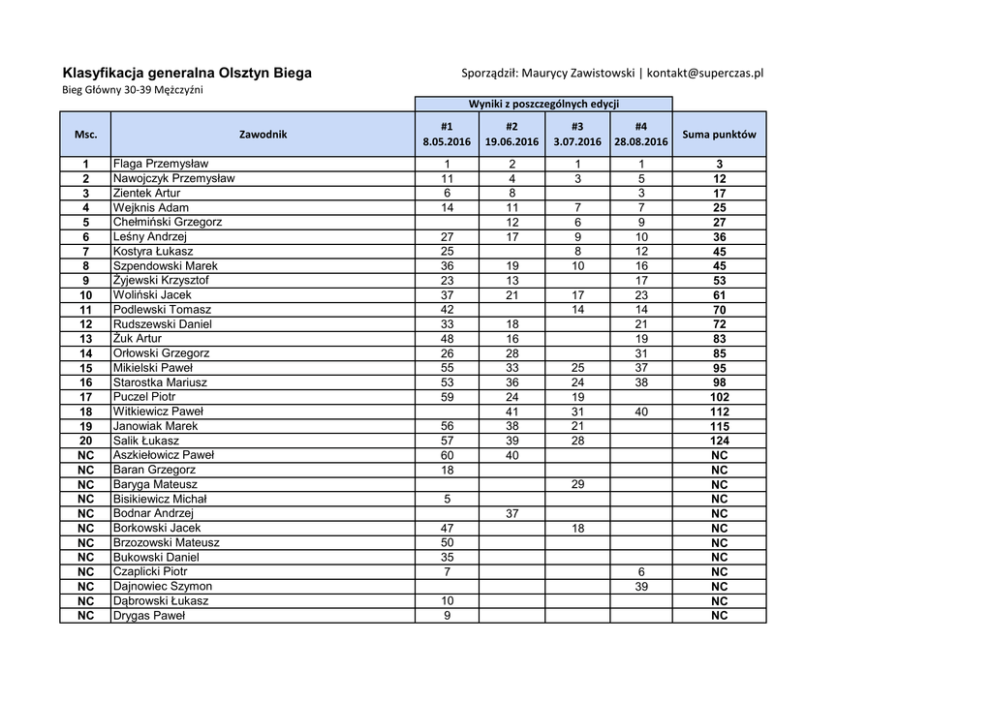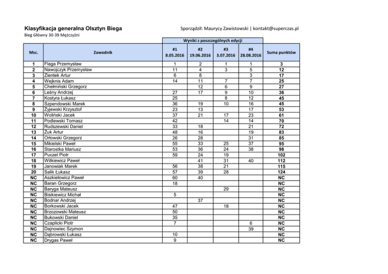 Sporządził: Maurycy Zawistowski | [email protected] Klasyfikacja generalna Olsztyn Biega Bieg Główny 30-39 Mężczyźni Wyniki z poszczególnych edycji Msc. 1 2 3 4 5 6 7 8 9 10 11 12 13 14 15 16 17 18 19 20 NC NC NC NC NC NC NC NC NC NC NC NC Zawodnik Flaga Przemysław Nawojczyk Przemysław Zientek Artur Wejknis Adam Chełmiński Grzegorz Leśny Andrzej Kostyra Łukasz Szpendowski Marek Żyjewski Krzysztof Woliński Jacek Podlewski Tomasz Rudszewski Daniel Żuk Artur Orłowski Grzegorz Mikielski Paweł Starostka Mariusz Puczel Piotr Witkiewicz Paweł Janowiak Marek Salik Łukasz Aszkiełowicz Paweł Baran Grzegorz Baryga Mateusz Bisikiewicz Michał Bodnar Andrzej Borkowski Jacek Brzozowski Mateusz Bukowski Daniel Czaplicki Piotr Dajnowiec Szymon Dąbrowski Łukasz Drygas Paweł #1 8.05.2016 #2 19.06.2016 #3 3.07.2016 #4 28.08.2016 1 11 6 14 2 4 8 11 12 17 1 3 1 5 3 7 9 10 12 16 17 23 14 21 19 31 37 38 27 25 36 23 37 42 33 48 26 55 53 59 56 57 60 18 19 13 21 18 16 28 33 36 24 41 38 39 40 7 6 9 8 10 17 14 25 24 19 31 21 28 40 29 5 37 47 50 35 7 10 9 18 6 39 Suma punktów 3 12 17 25 27 36 45 45 53 61 70 72 83 85 95 98 102 112 115 124 NC NC NC NC NC NC NC NC NC NC NC NC NC NC NC NC NC NC NC NC NC NC NC NC NC NC NC NC NC NC NC NC NC NC NC NC NC NC NC NC NC NC NC NC NC NC NC NC NC NC NC Dubowski Szymon Ferszt Piotr Fetliński Grzegorz Filipczuk Adam Gąsiorowski Przemysław Gierach Marcin Gliński Tomasz Gontarz Wiktor Gryszko Marcin Hermann Tomasz Idzior Tomasz Janiewicz Bartosz Jankowski Piotr Juchniewicz Andrzej Kacperski Wojciech Kacprzak Tomasz Kaczorowski Piotr Kalinowski Tomasz Kamil Piłat Karolewski Krzysztof Kielak Marcin Kiewisz Adam Klach Andrzej Klemt Marcin Klimczuk Mariusz Kłos Grzegorz Korybut-Daszkiewicz Robert Kotowski Marek Kozłowski Piotr Krzyzanowski Łukasz Kucz Mateusz Kujawa Paweł Kulesza Mikołaj Leński Michał Lipiński Seweryn Łajkowski Marek Makulec Aleksander Marciak Karol Milewicz Grzegorz 15 3 26 51 40 13 19 25 22 34 15 33 22 8 28 7 5 3 4 23 32 15 30 15 9 27 20 35 12 27 17 1 32 11 20 38 29 22 24 10 4 45 18 49 52 39 8 NC NC NC NC NC NC NC NC NC NC NC NC NC NC NC NC NC NC NC NC NC NC NC NC NC NC NC NC NC NC NC NC NC NC NC NC NC NC NC NC NC NC NC NC NC NC NC NC NC NC NC NC NC NC NC NC NC NC NC NC NC NC NC NC NC NC NC NC NC NC NC NC NC NC NC NC Mrozowski Janusz Mrożek Mateusz Musiałek Paweł Neumann Artur Nitkiewicz Bartosz Orzał Tomasz Pielgrzymowski Wojciech Pietrusik Łukasz Piłat Kamil Plewiński Rafał Płodzicki Tomasz Podgórski Piotr Powarunas Maciej Prokopczuk Dariusz Radzki Daniel Roman Marcin Rudziński Marcin Sięda Tomasz Smółka Jacek Sosnowski Krystian Staśkiewicz Marcin Stradomski Marcin Sujka Karol Szewczek Piotr Szot Andrzej Szuksztul Robert Szwaj Łukasz Tartanus Andrzej Walinowicz Paweł Wiśniewski Łukasz Woś Kamil Wróbel Marek Wypych Kamil Wysocki Marcin Zakrzewski Łukasz Zapolski Marcin Zmysłowski Piotr 29 35 29 27 26 20 36 31 11 14 30 30 5 16 58 31 12 32 23 24 34 30 2 21 22 44 43 6 2 28 2 25 54 13 4 20 41 34 13 16 46 26 NC NC NC NC NC NC NC NC NC NC NC NC NC NC NC NC NC NC NC NC NC NC NC NC NC NC NC NC NC NC NC NC NC NC NC NC NC