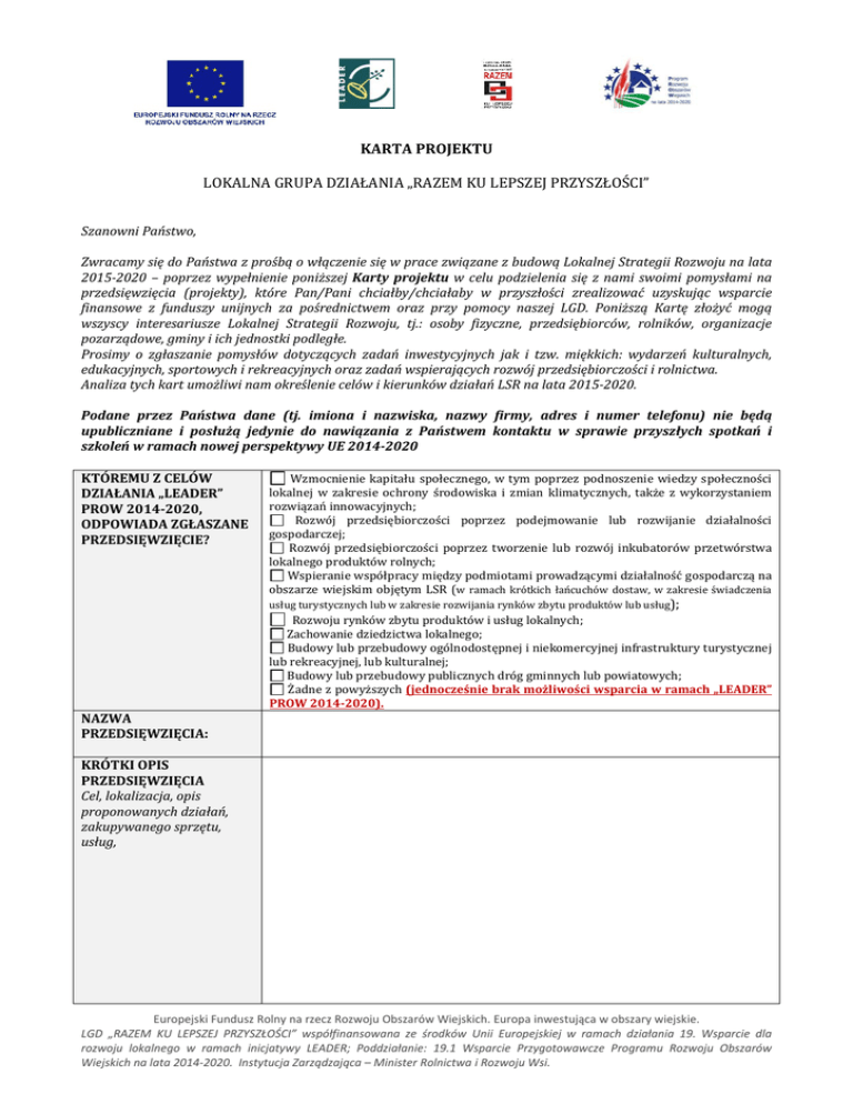 KARTAPROJEKTU LOKALNAGRUPADZIAŁANIA„RAZEMKULEPSZEJPRZYSZŁOŚCI” SzanowniPaństwo, ZwracamysiędoPaństwazprośbąowłączeniesięwpracezwiązanezbudowąLokalnejStrategiiRozwojunalata 2015‐2020 – poprzez wypełnienie poniższej Karty projektu w celu podzielenia się z nami swoimi pomysłami na przedsięwzięcia (projekty), które Pan/Pani chciałby/chciałaby w przyszłości zrealizować uzyskując wsparcie finansowe z funduszy unijnych za pośrednictwem oraz przy pomocy naszej LGD. Poniższą Kartę złożyć mogą wszyscy interesariusze Lokalnej Strategii Rozwoju, tj.: osoby fizyczne, przedsiębiorców, rolników, organizacje pozarządowe,gminyiichjednostkipodległe. Prosimy o zgłaszanie pomysłów dotyczących zadań inwestycyjnych jak i tzw. miękkich: wydarzeń kulturalnych, edukacyjnych,sportowychirekreacyjnychorazzadańwspierającychrozwójprzedsiębiorczościirolnictwa. AnalizatychkartumożliwinamokreśleniecelówikierunkówdziałańLSRnalata2015‐2020. Podane przez Państwa dane (tj. imiona i nazwiska, nazwy firmy, adres i numer telefonu) nie będą upubliczniane i posłużą jedynie do nawiązania z Państwem kontaktu w sprawie przyszłych spotkań i szkoleńwramachnowejperspektywyUE2014‐2020 KTÓREMUZCELÓW Wzmocnieniekapitału społecznego, w tym poprzez podnoszenie wiedzy społeczności lokalnej w zakresie ochrony środowiska i zmian klimatycznych, także z wykorzystaniem DZIAŁANIA„LEADER” rozwiązańinnowacyjnych; PROW2014‐2020, Rozwój przedsiębiorczości poprzez podejmowanie lub rozwijanie działalności ODPOWIADAZGŁASZANE gospodarczej; PRZEDSIĘWZIĘCIE? Rozwój przedsiębiorczości poprzez tworzenie lub rozwój inkubatorów przetwórstwa lokalnegoproduktówrolnych; Wspieraniewspółpracymiędzypodmiotamiprowadzącymidziałalnośćgospodarcząna obszarze wiejskim objętymLSR (w ramach krótkich łańcuchów dostaw, w zakresie świadczenia usługturystycznychlubwzakresierozwijaniarynkówzbytuproduktówlubusług); Rozwojurynkówzbytuproduktówiusługlokalnych; Zachowaniedziedzictwalokalnego; Budowylubprzebudowyogólnodostępnejiniekomercyjnejinfrastrukturyturystycznej lubrekreacyjnej,lubkulturalnej; Budowylubprzebudowypublicznychdróggminnychlubpowiatowych; Żadnezpowyższych(jednocześniebrakmożliwościwsparciawramach„LEADER” PROW2014‐2020). NAZWA PRZEDSIĘWZIĘCIA: KRÓTKIOPIS PRZEDSIĘWZIĘCIA Cel,lokalizacja,opis proponowanychdziałań, zakupywanegosprzętu, usług, Europejski Fundusz Rolny na rzecz Rozwoju Obszarów Wiejskich. Europa inwestująca w obszary wiejskie. LGD „RAZEM KU LEPSZEJ PRZYSZŁOŚCI” współfinansowana ze środków Unii Europejskiej w ramach działania 19. Wsparcie dla rozwoju lokalnego w ramach inicjatywy LEADER; Poddziałanie: 19.1 Wsparcie Przygotowawcze Programu Rozwoju Obszarów Wiejskich na lata 2014‐2020. Instytucja Zarządzająca – Minister Rolnictwa i Rozwoju Wsi. JAKICHEFEKTÓW IKORZYŚCIDLA MIESZKAŃCÓWOBSZARU LGDMOŻEMYSIĘ SPODZIEWAĆWWYNIKU REALIZACJI PRZEDSIĘWZIĘCIA? np.zwiększenieliczbymiejsc pracy,zwiększeniedostępu dousług… LATAREALIZACJI PRZEDSIĘWZIĘCIA: Proszęwpisaćroklublata WNIOSKODAWCA PRZEDSIĘWZIĘCIA: Nazwawnioskodawcy:imię inazwisko,nazwafirmy, danekontaktowe:numer telefonu,adrese‐mail SZACUNKOWYKOSZT PRZEDSIĘWZIĘCIA(zł): CZYJAKO WNIOSKODAWCA POSIADAM DOŚWIADCZENIEW POZYSKANIUFUNDUSZY UNIJNYCHLUB KRAJOWYCH? Jeślitakprosimyo wskazanietytułuprojektu iźródłafinansowania Czytelny podpis osoby zgłaszającej pomysł na projekt: …………………………………………………………………………………. Oświadczenie: Wyrażam zgodę na przetwarzanie moich danych osobowych w celach marketingowych przez Stowarzyszenie Lokalna Grupa działania „RAZEM KU LEPSZEJ PRZYSZŁOŚCI” , ul. Świderska 12, Łuków w celu prowadzenia Konsultacji Społecznych w ramach opracowania LSR na lata 2015‐2020 zgodnie z ustawą o ochronie danych osobowych (tekst jedn. Dz. U z 2002 r. nr 101, poz. 926 ze zm.). Wypełnioną „Kartę projektu” prosimy złożyć w Biurze LGD „RAZEM KU LEPSZEJ PRZYSZŁOŚCI”, ul. Świderska 12 w Łukowie lub UG: Adamów, Krzywda, Łuków, Stanin, Serokomla, Stoczek Łukowski (Gmina i Miasto), Trzebieszów, Wojcieszków, Wola Mysłowska lub przesłać skan karty za pośrednictwem poczty elektronicznej na adres [email protected] lub faxem na numer 25 798 24 39. Dziękujemy za wypełnienie karty projektu! Więcej informacji na stronie www.lgdrazem.pl/prow2014_2020 Europejski Fundusz Rolny na rzecz Rozwoju Obszarów Wiejskich. Europa inwestująca w obszary wiejskie. LGD „RAZEM KU LEPSZEJ PRZYSZŁOŚCI” współfinansowana ze środków Unii Europejskiej w ramach działania 19. Wsparcie dla rozwoju lokalnego w ramach inicjatywy LEADER; Poddziałanie: 19.1 Wsparcie Przygotowawcze Programu Rozwoju Obszarów Wiejskich na lata 2014‐2020. Instytucja Zarządzająca – Minister Rolnictwa i Rozwoju Wsi.