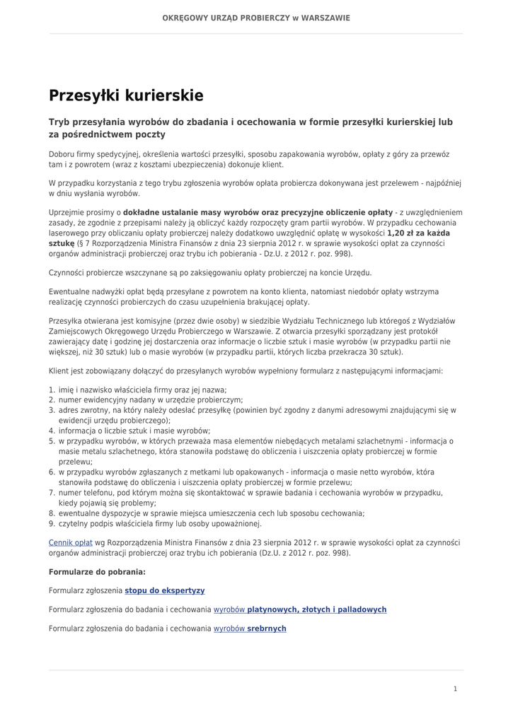 OKRĘGOWY URZĄD PROBIERCZY w WARSZAWIE Przesyłki kurierskie Tryb przesyłania wyrobów do zbadania i ocechowania w formie przesyłki kurierskiej lub za pośrednictwem poczty Doboru firmy spedycyjnej, określenia wartości przesyłki, sposobu zapakowania wyrobów, opłaty z góry za przewóz tam i z powrotem (wraz z kosztami ubezpieczenia) dokonuje klient. W przypadku korzystania z tego trybu zgłoszenia wyrobów opłata probiercza dokonywana jest przelewem - najpóźniej w dniu wysłania wyrobów. Uprzejmie prosimy o dokładne ustalanie masy wyrobów oraz precyzyjne obliczenie opłaty - z uwzględnieniem zasady, że zgodnie z przepisami należy ją obliczyć każdy rozpoczęty gram partii wyrobów. W przypadku cechowania laserowego przy obliczaniu opłaty probierczej należy dodatkowo uwzględnić opłatę w wysokości 1,20 zł za każda sztukę (§ 7 Rozporządzenia Ministra Finansów z dnia 23 sierpnia 2012 r. w sprawie wysokości opłat za czynności organów administracji probierczej oraz trybu ich pobierania - Dz.U. z 2012 r. poz. 998). Czynności probiercze wszczynane są po zaksięgowaniu opłaty probierczej na koncie Urzędu. Ewentualne nadwyżki opłat będą przesyłane z powrotem na konto klienta, natomiast niedobór opłaty wstrzyma realizację czynności probierczych do czasu uzupełnienia brakującej opłaty. Przesyłka otwierana jest komisyjne (przez dwie osoby) w siedzibie Wydziału Technicznego lub któregoś z Wydziałów Zamiejscowych Okręgowego Urzędu Probierczego w Warszawie. Z otwarcia przesyłki sporządzany jest protokół zawierający datę i godzinę jej dostarczenia oraz informacje o liczbie sztuk i masie wyrobów (w przypadku partii nie większej, niż 30 sztuk) lub o masie wyrobów (w przypadku partii, których liczba przekracza 30 sztuk). Klient jest zobowiązany dołączyć do przesyłanych wyrobów wypełniony formularz z następującymi informacjami: 1. imię i nazwisko właściciela firmy oraz jej nazwa; 2. numer ewidencyjny nadany w urzędzie probierczym; 3. adres zwrotny, na który należy odesłać przesyłkę (powinien być zgodny z danymi adresowymi znajdującymi się w ewidencji urzędu probierczego); 4. informacja o liczbie sztuk i masie wyrobów; 5. w przypadku wyrobów, w których przeważa masa elementów niebędących metalami szlachetnymi - informacja o masie metalu szlachetnego, która stanowiła podstawę do obliczenia i uiszczenia opłaty probierczej w formie przelewu; 6. w przypadku wyrobów zgłaszanych z metkami lub opakowanych - informacja o masie netto wyrobów, która stanowiła podstawę do obliczenia i uiszczenia opłaty probierczej w formie przelewu; 7. numer telefonu, pod którym można się skontaktować w sprawie badania i cechowania wyrobów w przypadku, kiedy pojawią się problemy; 8. ewentualne dyspozycje w sprawie miejsca umieszczenia cech lub sposobu cechowania; 9. czytelny podpis właściciela firmy lub osoby upoważnionej. Cennik opłat wg Rozporządzenia Ministra Finansów z dnia 23 sierpnia 2012 r. w sprawie wysokości opłat za czynności organów administracji probierczej oraz trybu ich pobierania (Dz.U. z 2012 r. poz. 998). Formularze do pobrania: Formularz zgłoszenia stopu do ekspertyzy Formularz zgłoszenia do badania i cechowania wyrobów platynowych, złotych i palladowych Formularz zgłoszenia do badania i cechowania wyrobów srebrnych 1 OKRĘGOWY URZĄD PROBIERCZY w WARSZAWIE Formularz zgłoszenia do badania i cechowania wyrobów srebrnych powyżej 50 g i wyrobów korpusowych 2