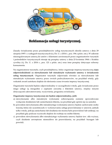 Reklamacja usługi turystycznej. Zasady świadczenia przez przedsiębiorców usług turystycznych określa ustawa z dnia 29 sierpnia 1997 r. o usługach turystycznych (t.j. Dz. U. z 2014 r., poz. 196 z późn. zm.). W zakresie nieuregulowanym ustawą do umów z klientami zawieranych przez organizatorów turystyki i pośredników turystycznych stosuje się przepisy ustawy z dnia 23 kwietnia 1964 r. Kodeks cywilny (t.j. Dz. U. z 2014 r., poz. 121 z późn. zm.) oraz inne przepisy dotyczące ochrony konsumenta. Na organizatorze turystyki, czyli przedsiębiorcy, który organizuje imprezę turystyczną ciąży odpowiedzialność za niewykonanie lub nienależyte wykonanie umowy o świadczenie usług turystycznych. Organizator turystyki odpowiada również za niewykonanie lub nienależyte wykonanie umowy przez swoich podwykonawców, na przykład wtedy, gdy wskutek awarii autokaru dojdzie do skrócenia czasu trwania imprezy turystycznej. Organizator turystyki będzie odpowiedzialny w szczególności wtedy, gdy świadczone przez niego usługi są niezgodne z zapisami zawartej z klientem umowy, między innymi dotyczącymi zakwaterowania, wyżywienia, programu zwiedzania. Organizator imprezy turystycznej nie będzie odpowiedzialny, jeśli: a) niewykonanie albo nienależyte wykonanie zobowiązania zostanie spowodowane wyłącznie działaniem lub zaniechaniem klienta, na przykład gdy spóźni się na samolot, b) powodem niewykonania albo nienależytego wykonania umowy będzie zachowanie osoby trzeciej, która nie uczestniczyła w wykonywaniu usługi przewidzianej w umowie, jednak tylko wtedy, jeśli jej zaniechania lub działania nie można było przewidzieć lub uniknąć, na przykład gdy podczas wycieczki dojdzie do rozboju na osobie klienta. c) powodem niewykonania albo nienależytego wykonania umowy będzie tzw. siła wyższa, czyli działanie zewnętrzne niemożliwe do przewidzenia, na przykład: huragan lub powódź. 1 Wyłączenie odpowiedzialności w związku z zaistnieniem wyżej wskazanych sytuacji nie zwolni organizatora turystyki z obowiązku udzielenia w czasie trwania imprezy pomocy poszkodowanemu klientowi. W przypadku złożenia przez klienta reklamacji, to organizator imprezy turystycznej powinien wykazać, że zaszła okoliczność, która wyłącza jego odpowiedzialność. Organizator turystyki będzie odpowiedzialny, gdy w czasie trwania imprezy turystycznej nie wykona przewidzianych w umowie usług stanowiących istotną część programu, a w zamian zaproponuje tzw. świadczenie zastępcze. W szczególności gdy jakość świadczenia zastępczego będzie niższa od jakości usługi określonej w programie imprezy turystycznej, na przykład gdy zamiast w hotelu czterogwiazdkowym klient zostanie zakwaterowany w hotelu trzygwiazdkowym, będzie miał prawo do żądania obniżenia ceny. Jeśli wykonanie świadczeń zastępczych będzie niemożliwe lub klient nie wyrazi na nie zgody i odstąpi od umowy, organizator będzie zobowiązany do zapewnienia mu powrotu do miejsca rozpoczęcia imprezy lub do innego uzgodnionego miejsca w warunkach nie gorszych niż określone w umowie. W razie odstąpienia od umowy organizator nie będzie mógł żądać od klienta żadnych dodatkowych świadczeń z tego tytułu, w szczególności zapłaty kary umownej, natomiast klient będzie mógł żądać naprawienia szkody wynikłej z niewykonania umowy. W przypadku niemożności wykonania świadczenia zastępczego klient może żądać naprawienia szkody wynikłej z niewykonania umowy, chyba że jest to spowodowane zachowaniem osób trzecich, nieuczestniczących w wykonywaniu świadczenia zastępczego, jeśli zachowania tego nie można było przewidzieć lub uniknąć, albo siłą wyższą. Wyłączenie lub ograniczenie odpowiedzialności przez organizatora turystyki w drodze umowy jest co do zasady niemożliwe. Odpowiedzialność za szkodę wyrządzoną klientowi wskutek niewykonania lub nienależytego wykonania umowy może być ograniczona tylko wtedy, gdy określa to umowa międzynarodowa, której stroną jest Polska. Za niewykonanie lub nienależyte wykonanie zobowiązania organizator imprezy turystycznej będzie odpowiadał do dwukrotności jej ceny względem każdego klienta, o ile klauzulę o tej treści zamieści w umowie. Jeśli w umowie nie znajdzie się taka klauzula, to maksymalny limit nie będzie obowiązywał. Ograniczenie w wysokości odszkodowania nie może jednak dotyczyć szkód na osobie. Klient, który w trakcie imprezy turystycznej stwierdza wadliwe wykonywanie umowy, powinien o tym niezwłocznie zawiadomić wykonawcę usługi oraz organizatora turystyki, w sposób odpowiedni dla rodzaju usługi. Umowa o świadczenie usług turystycznych winna zawierać jednoznaczny zapis przypominający klientowi o tym obowiązku. Niezależnie od zawiadomienia, klient w terminie nie dłuższym niż 30 dni od zakończenia imprezy turystycznej może złożyć do organizatora turystyki reklamację. 2 Jeżeli w umowie o świadczenie usług turystycznych zostaną zawarte zapisy nakładające na klienta składającego reklamację szczególnie niekorzystne obowiązki, będzie je można uznać za niedozwolone postanowienia umowne. Przepisy prawa nie przewidują formy szczególnej dla złożenia reklamacji. Reklamacja może być złożona ustnie, jednakże w celach dowodowych wskazana jest forma pisemna. Ponadto składając reklamację klient powinien uzyskać potwierdzenie złożenia i daty reklamacji na kopii pisma reklamacyjnego kierowanego do organizatora turystyki. W przypadku, gdy organizator odmówi przyjęcia reklamacji, należy wysłać na jego adres list polecony za zwrotnym potwierdzeniem odbioru. W reklamacji należy w szczególności określić: miejsce i datę sporządzenia pisma reklamacyjnego, dane klienta, dane organizatora imprezy turystycznej, numer i przedmiot umowy o świadczenie usług turystycznych, datę i miejsce jej zawarcia, wady imprezy (na przykład: niższy niż w umowie sta