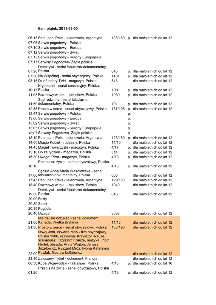 itvn, piątek, 2011-09-30 06:15 Pan i pani Pells - telenowela, Argentyna 07:05 Serwis pogodowy - Polska 07:10 Serwis pogodowy - Europa 07:12 Serwis pogodowy - Świat 07:15 Serwis pogodowy - Kurorty Europejskie 07:17 Serwisy Pogodowe- Żagle polskie Detektywi - serial fabularno-dokumentalny, 07:20 Polska 07:50 Na Wspólnej - serial obyczajowy, Polska 08:15 Dzień dobry TVN - magazyn, Polska Kryminalni - serial sensacyjny, Polska, 10:15 Polska 11:05 Rozmowy w toku - talk show, Polska Sąd rodzinny - serial fabularno11:50 dokumentalny, Polska 12:35 Prosto w serce - serial obyczajowy, Polska 12:57 Serwis pogodowy - Polska 13:00 Serwis pogodowy - Europa 13:02 Serwis pogodowy - Świat 13:05 Serwis pogodowy - Kurorty Europejskie 13:07 Serwisy Pogodowe- Żagle polskie 13:10 Pan i pani Pells - telenowela, Argentyna 14:00 Miasto Kobiet - rodzinny, Polska 14:45 Magiel Towarzyski - magazyn, Polska 15:10 Co za tydzień - magazyn, Polska 15:30 Uwaga! Pirat - magazyn, Polska Przepis na życie - serial obyczajowy, Polska 16:10 Sędzia Anna Maria Wesołowska - serial 17:00 fabularno-dokumentalny, Polska 17:45 Pan i pani Pells - telenowela, Argentyna 18:40 Rozmowy w toku - talk show, Polska Detektywi - serial fabularno-dokumentalny, 19:30 Polska 20:00 Fakty 20:30 Sport 20:35 Pogoda 20:40 Uwaga! Nie daj się oczukać - serial dokument, 21:00 Kanada, Wielka Brytania 21:30 Prosto w serce - serial obyczajowy, Polska Nowy Jork, czwarta rano - film obyczajowy, Polska 1988, reżyseria: Krzysztof Krauze, scenariusz: Krzysztof Krauze, muzyka: Piotr Hertel, obsada: Anna Wojton, Janusz Józefowicz, Ryszard Mróz, Iwona Katarzyna 22:00 Pawlak, Gustaw Lutkiewicz 23:30 Zakazany Tybet - dokument, Francja 00:30 Kuba Wojewódzki - talk show, Polska Przepis na życie - serial obyczajowy, Polska 01:20 128/160 p. dla małoletnich od lat 12 845 1481 843 p. dla małoletnich od lat 12 p. dla małoletnich od lat 12 dla małoletnich od lat 12 1/14 1939 p. dla małoletnich od lat 12 p. dla małoletnich od lat 12 191 p. dla małoletnich od lat 12 137/196 p. dla małoletnich od lat 12 p. p. p. p. p. 128/160 p. dla małoletnich od lat 12 11/16 dla małoletnich od lat 12 4/17 p. dla małoletnich od lat 12 514 p. dla małoletnich od lat 12 4/13 p. dla małoletnich od lat 12 4/13 p. dla małoletnich od lat 12 600 129/160 1940 dla małoletnich od lat 12 dla małoletnich od lat 12 dla małoletnich od lat 12 846 dla małoletnich od lat 12 3088 dla małoletnich od lat 12 11/13 138/196 dla małoletnich od lat 12 dla małoletnich od lat 12 4/15 dla małoletnich od lat 12 dla małoletnich od lat 12 p. dla małoletnich od lat 16 4/13 p. dla małoletnich od lat 12 Detektywi - serial fabularno-dokumentalny, 02:10 Polska 02:35 Co za tydzień - magazyn, Polska 03:00 Kuba Wojewódzki - talk show, Polska 03:50 Fakty 04:35 Rozmowy w toku - talk show, Polska 05:20 Fakty 05:50 Sport 05:55 Pogoda 06:00 Uwaga! 846 514 4/15 600 1940 3088 p. p. p. p. p. p. p. p. p. dla małoletnich od lat 12 dla małoletnich od lat 12 dla małoletnich od lat 16 dla małoletnich od lat 12 dla małoletnich od lat 12 5/19 p. dla małoletnich od lat 7 dla małoletnich od lat 12 itvn, sobota, 2011-10-01 06:15 Wrzesień '39 Wara - dokument Wyśpiewana miłość - film komedia romantyczna, Włochy 2010, reżyseria: Roberto Malenotti , muzyka: Gianluca Misiti, obsada: Lola Ponce, Roberto Farnesi, Fabio Testi, Cinzia Leone, Tomas Arana 06:40 Nie daj się oczukać - serial dokument, 08:35 Kanada, Wielka Brytania 09:00 Dzień dobry TVN - magazyn, Polska 11:00 Co za tydzień - magazyn, Polska 11:25 Maja w ogrodzie - magazyn, Polska 66 niezapomnianych chwil showbiznesu, 11:45 Polska Przepis na życie - serial obyczajowy, Polska 12:10 Top Model. Zostań modelką - reality show, 12:55 Polska 13:40 Skradzione życia - telenowela, Argentyna 14:35 Skradzione życia - telenowela, Argentyna Z archiwum czołówki seria 2 Zdarza się i tak 15:25 Z archiwum czołówki seria 2 Zeznanie 15:50 szpiega Nowy Jork, czwarta rano - film obyczajowy, Polska 1988, reżyseria: Krzysztof Krauze, scenariusz: Krzysztof Krauze, muzyka: Piotr Hertel, obsada: Anna Wojton, Janusz Józefowicz, Ryszard Mróz, Iwona Katarzyna 16:15 Pawlak, Gustaw Lutkiewicz 17:40 Uwaga! Pirat - magazyn, Polska Kryminalni - serial sensacyjny, Polska, 18:20 Polska Miłość na kredyt - dokument, Wielka 19:10 Brytania 20:00 Fakty 20:25 Sport 20:35 Pogoda 20:40 Uwaga! 21:00 Mam talent - program rozrywkowy, Polska p. dla małoletnich od lat 12 11/13 514 515 38/50 4/8 p. dla małoletnich od lat 12 dla małoletnich od lat 12 dla małoletnich od lat 12 bez ograniczeń wiekowych dla małoletnich od lat 12 4/13 p. dla małoletnich od lat 12 4/13 43/135 44/135 p. dla małoletnich od lat 12 dla małoletnich od lat 12 dla małoletnich od lat 12 3/36 dla małoletnich od lat 12 4/36 dla małoletnich od lat 12 4/13 p. dla małoletnich od lat 12 p. dla małoletnich od lat 12 1/14 p. dla małoletnich od lat 12 2 dla małoletnich od lat 12 3089 5/13 dla małoletnich od lat 12 dla małoletnich od lat 12 Zbrodnie niedoskonałe - Rzym - serial 22:20 kryminalny, Włochy 7/20 23:15 Wrzesień '39 Wara - dokument 5/19 23:40 Wrzesień '39 Sparta - dokument 6/19 00:05 Magiel Towarzyski - magazyn, Polska 4/17 Układ Warszawski - serial kryminalny, 00:30 Polska 4/13 Z archiwum czołówki seria 2 Zdarza się i tak 01:15 3/36 Z archiwum czołówki seria 2 Zeznanie 01:35 szpiega 4/36 01:55 Skradzione życia - telenowela, Argentyna 43/135 02:50 Skradzione życia - telenowela, Argentyna 44/135 Oczami mordercy - film thriller, Włochy 2009, reżyseria: Edoardo Margheriti, muzyka: Alessandro Molinari , obsada: Marco Bonetti, Antonio Cupo, Giada D'Auria, Fabio Ferri, 03:35 Sara Filizzola 05:20 Fakty 05:45 Sport 05:50 Pogoda 06:00 Uwaga! dla małoletnich od lat 16 p. dla małoletnich od lat 7 p. dla małoletnich od lat 7 p. dla małoletnich od lat 12 p. dla małoletnich od lat 12 p. dla małoletnich od lat 12 p. dla małoletnich od lat 12 p. dla małoletnich od lat 12 p. d