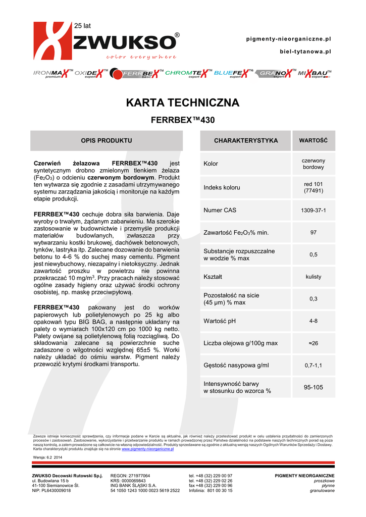 25 lat ZWUKSO p i gm e n t y- n i e o r g a n i c z n e . p l b i e l - t yt a n o w a . p l color every w h ere ™ ™ ™ ™ ™ ™ ™ KARTA TECHNICZNA FERRBEX™430 OPIS PRODUKTU CHARAKTERYSTYKA Czerwień żelazowa FERRBEX™430 jest syntetycznym drobno zmielonym tlenkiem żelaza (Fe2O3) o odcieniu czerwonym bordowym. Produkt ten wytwarza się zgodnie z zasadami utrzymywanego systemu zarządzania jakością i monitoruje na każdym etapie produkcji. Kolor FERRBEX™430 cechuje dobra siła barwienia. Daje wyroby o trwałym, żądanym zabarwieniu. Ma szerokie zastosowanie w budownictwie i przemyśle produkcji materiałów budowlanych, zwłaszcza przy wytwarzaniu kostki brukowej, dachówek betonowych, tynków, lastryka itp. Zalecane dozowanie do barwienia betonu to 4-6 % do suchej masy cementu. Pigment jest niewybuchowy, niezapalny i nietoksyczny. Jednak zawartość proszku w powietrzu nie powinna przekraczać 10 mg/m 3. Przy pracach należy stosować ogólne zasady higieny oraz używać środki ochrony osobistej, np. maskę przeciwpyłową. Numer CAS FERRBEX™430 pakowany jest do worków papierowych lub polietylenowych po 25 kg albo opakowań typu BIG BAG, a następnie układany na palety o wymiarach 100x120 cm po 1000 kg netto. Palety owijane są polietylenową folią rozciągliwą. Do składowania zalecane są powierzchnie suche zadaszone o wilgotności względnej 65±5 %. Worki należy układać do ośmiu warstw. Pigment należy przewozić krytymi środkami transportu. WARTOŚĆ czerwony bordowy red 101 (77491) Indeks koloru 1309-37-1 Zawartość Fe2O3% min. 97 Substancje rozpuszczalne w wodzie % max 0,5 Kształt kulisty Pozostałość na sicie (45 µm) % max 0,3 Wartość pH 4-8 Liczba olejowa g/100g max ≈26 Gęstość nasypowa g/ml 0,7-1,1 Intensywność barwy w stosunku do wzorca % 95-105 Zawsze istnieje konieczność sprawdzenia, czy informacje podane w Karcie są aktualne, jak również należy przetestować produkt w celu ustalenia przydatności do zamierzonych procesów i zastosowań. Zastosowanie, wykorzystanie i przetwarzanie produktu w ramach prowadzonej przez Państwa działalności na podstawie naszych technicznych porad są poza naszą kontrolą, a zatem prowadzone są całkowicie na własną odpowiedzialność. Produkty sprzedawane są zgodnie z aktualną wersją naszych Ogólnych Warunków Sprzedaży i Dostawy. Karta charakterystyki produktu znajduje się na stronie www.pigmenty-nieorganiczne.pl Wersja: 6.2 2014 ZWUKSO Decowski Rutowski Sp.j. ul. Budowlana 15 b 41-100 Siemianowice Śl. NIP: PL6430009018 REGON: 271977064 KRS: 0000069843 ING BANK ŚLĄSKI S.A. 54 1050 1243 1000 0023 5619 2522 tel. +48 (32) 229 00 97 tel. +48 (32) 229 02 26 fax +48 (32) 229 00 96 Infolinia: 801 00 30 15 PIGMENTY NIEORGANICZNE proszkowe płynne granulowane