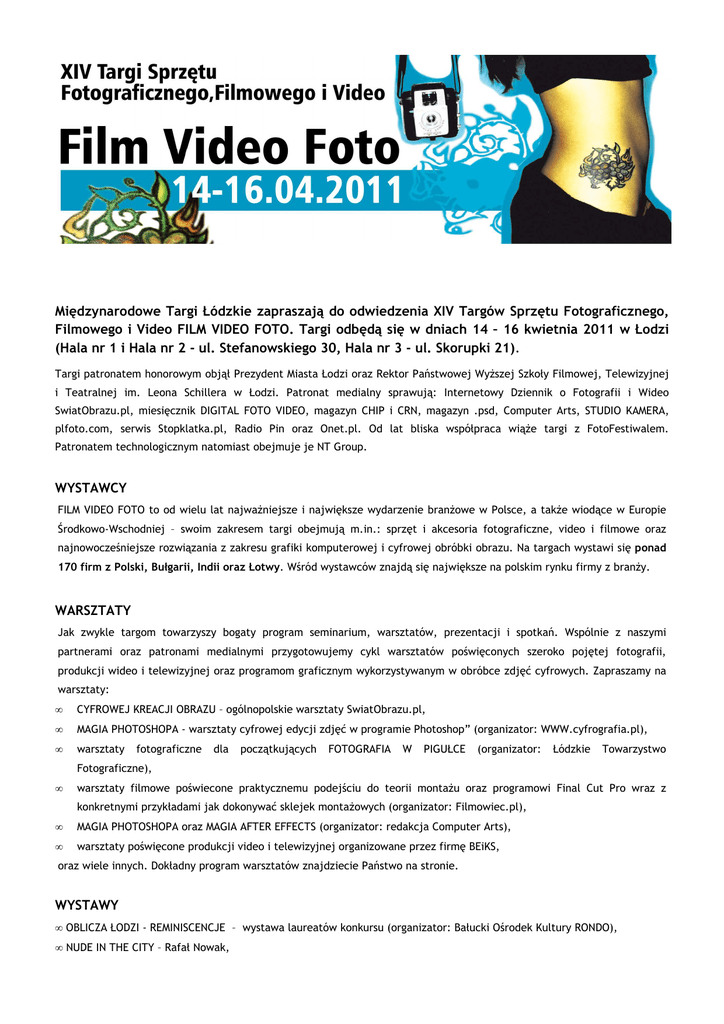 Międzynarodowe Targi Łódzkie zapraszają do odwiedzenia XIV Targów Sprzętu Fotograficznego, Filmowego i Video FILM VIDEO FOTO. Targi odbędą się w dniach 14 – 16 kwietnia 2011 w Łodzi (Hala nr 1 i Hala nr 2 - ul. Stefanowskiego 30, Hala nr 3 - ul. Skorupki 21). Targi patronatem honorowym objął Prezydent Miasta Łodzi oraz Rektor Państwowej WyŜszej Szkoły Filmowej, Telewizyjnej i Teatralnej im. Leona Schillera w Łodzi. Patronat medialny sprawują: Internetowy Dziennik o Fotografii i Wideo SwiatObrazu.pl, miesięcznik DIGITAL FOTO VIDEO, magazyn CHIP i CRN, magazyn .psd, Computer Arts, STUDIO KAMERA, plfoto.com, serwis Stopklatka.pl, Radio Pin oraz Onet.pl. Od lat bliska współpraca wiąŜe targi z FotoFestiwalem. Patronatem technologicznym natomiast obejmuje je NT Group. WYSTAWCY FILM VIDEO FOTO to od wielu lat najwaŜniejsze i największe wydarzenie branŜowe w Polsce, a takŜe wiodące w Europie Środkowo-Wschodniej – swoim zakresem targi obejmują m.in.: sprzęt i akcesoria fotograficzne, video i filmowe oraz najnowocześniejsze rozwiązania z zakresu grafiki komputerowej i cyfrowej obróbki obrazu. Na targach wystawi się ponad 170 firm z Polski, Bułgarii, Indii oraz Łotwy. Wśród wystawców znajdą się największe na polskim rynku firmy z branŜy. WARSZTATY Jak zwykle targom towarzyszy bogaty program seminarium, warsztatów, prezentacji i spotkań. Wspólnie z naszymi partnerami oraz patronami medialnymi przygotowujemy cykl warsztatów poświęconych szeroko pojętej fotografii, produkcji wideo i telewizyjnej oraz programom graficznym wykorzystywanym w obróbce zdjęć cyfrowych. Zapraszamy na warsztaty: • CYFROWEJ KREACJI OBRAZU – ogólnopolskie warsztaty SwiatObrazu.pl, • MAGIA PHOTOSHOPA - warsztaty cyfrowej edycji zdjęć w programie Photoshop” (organizator: WWW.cyfrografia.pl), • warsztaty fotograficzne dla początkujących FOTOGRAFIA W PIGUŁCE (organizator: Łódzkie Towarzystwo Fotograficzne), • warsztaty filmowe poświecone praktycznemu podejściu do teorii montaŜu oraz programowi Final Cut Pro wraz z konkretnymi przykładami jak dokonywać sklejek montaŜowych (organizator: Filmowiec.pl), • MAGIA PHOTOSHOPA oraz MAGIA AFTER EFFECTS (organizator: redakcja Computer Arts), • warsztaty poświęcone produkcji video i telewizyjnej organizowane przez firmę BEiKS, oraz wiele innych. Dokładny program warsztatów znajdziecie Państwo na stronie. WYSTAWY • OBLICZA ŁODZI - REMINISCENCJE – wystawa laureatów konkursu (organizator: Bałucki Ośrodek Kultury RONDO), • NUDE IN THE CITY – Rafał Nowak, • REPORTERZY ZE SZKOŁY FILMOWEJ W ŁODZI, • zdjęcia czytelników magazynu DIGITAL FOTO VIDEO, SPOTKANIA I INNE ATRAKCJE • Wykład „Czy te zdjęcia mogą kłamać. O wiarygodności fotografii” – spotkanie z Andrzejem Zygmuntowiczem, • „Cyfrowe Monidło – czyli cyfrowy obraz na styku fotografii i malarstwa” poświęcone genezie powstania stylu i technice przygotowania fotografii do stworzenia monidła. • „Digitalizacja i rekonstrukcja materiałów filmowych w procesie Digital Inermediate 4K na podstawie materiałów i doświadczenia Filmoteki Narodowej”, przygotowane przez Pawła Śmietankę z Filmoteki Narodowej • „Z Lowepro przez świat – Biegun Południowy” - ekstremalna ochrona sprzętu na Stacji im. H. Arctowskiego – spotkanie z dr Tomaszem Janeckim z Zakładu Biologii Antarktyki PAN, • „Szkolenie fotograficzne w plenerze: zadania i realizacje – na przykładzie plenerów „Syria i Jordania”, „Laos i KambodŜa”, HDR-y w Karkonoszach”, przygotowane przez kursfoto.pl, • Pokazy fotografii podróŜniczej – Tomasza Raczyńskiego i Marcina MAO Osmana – zorganizowane przez redakcję FOTO. • sesje fotograficzne i liczne konkursy na stoiskach wystawców. 122. URODZINY CHARLIEGO CHAPLINA Kino Charlie, uhonorowane przez Państwowy Instytut Sztuki Filmowej tytułem najlepszego kina w Polsce, kultowe miejsce na filmowej mapie Łodzi, członek prestiŜowej Sieci Kin Europejskich „Europa Cinemas” i polskiej Sieci Kin Studyjnych, ogłasza obchody urodzin swego patrona – Charliego Chaplina. Urodzinowe wydarzenia włączone zostaną równieŜ w ramy targów. Będzie to unikatowa podróŜ w magiczny świat sztuki filmowej, okazja do spotkania wybitnych ludzi kultury i oddania hołdu jednej z największych osobistości światowej kinematografii. Wszystkie wydarzenia będą działy się na stoisku Kina Charlie (Hala nr 3, stoisko nr 129). W programie urodzin m.in.: • Poszukiwanie sobowtóra Charliego Chaplina – konkurs na wizerunek najbliŜszy wizerunkowi mistrza (wśród ucharakteryzowanych sobowtórów m.in. Marcel Szytenchelm – aktor, animator kultury łódzkiej). Konkurs poprowadzi Barbara Tatara, miss Polonia 2007. Wśród nagród m.in. filmowy weekend dla dwojga w Hotelu Kacperski. • Przy kawie u Charliego – spotkania z ludźmi filmu, kultury i sztuki, wśród zaproszonych gości m.in. Olaf Lubaszenko, Grupa Łódź Kaliska, Jacek Bławut, Piotr Trzaskalski, Leszek Dawid, Franco de Pena, Piotr Szczepański. KONKURS O MEDAL TARGÓW FILM VIDEO FOTO Tradycyjnie targom towarzyszy konkurs o Medal FILM VIDEO FOTO za najlepsze produkty prezentowane na targach. Na konkurs napłynęło 45 zgłoszeń – 32 w kategorii FOTO i 13 w kategorii VIDEO. Zwycięzców poznamy podczas bankietu 14 kwietnia w klubie ELEKTROWNIA. KONKURS DLA PUBLICZNOŚCI Zachęcamy wszystkich do wzięcia udziału w konkursie i wypełniania kuponów dostępnych w kasach targów. Do wygrania cenne nagrody ufundowane przez sklep internetowy Cyfrowe.pl, firmę ROSA, Filmotekę Narodową, Muzeum Kinematografii oraz Wydawnictwo ResPolona. A wygrać moŜna: bony na zakupy w Cyfrowe.pl, lornetki, portfele skórzane, papier fotograficzny, latarki ledowe oraz gadŜety firmowe (fundator: Cyfrowe.pl); pasy reporterskie V3, pasek pro s, sakwy na lampę błyskową f1 oraz pasek standard (fundator: ROSA) oraz 10 szt. ekskluzywnych 