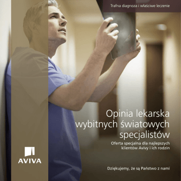 Trafna diagnoza i właściwe leczenie Opinia lekarska wybitnych światowych specjalistów Oferta specjalna dla najlepszych klientów Avivy i ich rodzin Dziękujemy, że są Państwo z nami Upewnij się, kiedy chodzi o zdrowie Twoje i Twojej rodziny. Zapytaj światowego eksperta! Trudnym sytuacjom takim jak rozpoznanie choroby towarzyszy niepewność i stres. Nasuwa się wiele dręczących pytań: Czy mogę zaufać lekarzowi? Czy trafnie zdiagnozował moją chorobę? Czy zaproponował właściwe leczenie? Dlaczego objawy nie ustępują mimo leczenia? GRATIS na 3 lata Zagraniczna konsultacja lekarska – aktywuj już dziś! 801 888 444 22 557 44 44 (dla tel. komórkowych) 2 Czy operacja jest konieczna? Z myślą o takich sytuacjach Aviva przygotowała dla najlepszych klientów i ich rodzin wyjątkową usługę, dzięki której będą mogli Państwo poczuć się bezpieczniej i pewniej w podejmowaniu ważnych decyzji dotyczących leczenia. Oferujemy Państwu dostęp do zagranicznych konsultacji lekarskich najlepszych światowych specjalistów (Best Doctors®) – szybko, sprawnie, bez wyjazdów zagranicznych. W podziękowaniu za bycie z Avivą, proponujemy tę usługę właśnie Państwu gratis na najbliższe 3 lata, dołączając ją do Państwa polisy na życie w ramach regularnie opłacanych składek (dostęp do usługi nie wpływa na wysokość składki z tytułu umowy głównej oraz umów dodatkowych). Korzystanie z usługi wymaga uprzedniej aktywacji. Ważne! Czas aktywacji ograniczony do 28.02.2015 r. 3 Zagraniczna opinia lekarska – pewność w leczeniu Opinia Lekarska Wybitnych Światowych Specjalistów to usługa oferowana we współpracy z międzynarodową organizacją Best Doctors®. Dzięki niej zyskują Państwo dostęp do konsultacji najlepszych lekarzy światowej sławy (Best Doctors), bez konieczności wyjazdu za granicę. Zakres konsultacji z zagranicznym ekspertem zależy od Państwa potrzeb. Konsultacja szczegółowa To kompleksowa weryfikacja diagnozy i planu terapii, wydanych przez lekarza prowadzącego leczenie w Polsce, wykonana na podstawie przekazanej dokumentacji medycznej*. Konsultacja uproszczona To uzyskanie specjalistycznej informacji dotyczącej choroby, na podstawie telefonicznego wywiadu przeprowadzonego przez Best Doctors w Polsce, bez przekazywania i analizy dokumentacji medycznej. * 4 Zakres schorzeń, jaki można konsultować z lekarzami Best Doctors jest bardzo szeroki, począwszy od bólu kręgosłupa czy urazów sportowych, aż po choroby przewlekłe i stanowiące zagrożenie dla życia. Dokumentacja medyczna niezbędna do wydania drugiej opinii lekarskiej to diagnoza lekarza prowadzącego leczenie w Polsce, plan leczenia, wyniki badań obrazowych, próbki, wycinki, itp. Best Doctors w Polsce pomaga pacjentom w zgromadzeniu odpowiednich dokumentów i materiałów z badań. 5 Światowej sławy lekarze Best Doctors Best Doctors skupia wybitnych światowych lekarzy specjalistów w dziedzinie medycyny, w ponad 450 specjalizacjach i podspecjalizacjach, cieszących się najlepszą opinią i największym uznaniem w swoich specjalnościach w środowisku lekarskim. Wybór lekarza eksperta zajmującego się sprawą danego pacjenta dokonywany jest przez zespół kliniczny Best Doctors, po uprzedniej szczegółowej analizie przypadku pacjenta. Zalety procesu: Wygoda. Pacjenci nie muszą wyjeżdżać za granicę ani martwić się sprawami organizacyjnymi (np. tłumaczeniem dokumentacji medycznej i jej transportem za granicę). Wystarczy telefon do Best Doctors w Polsce, którzy zajmą się organizacją całości procesu. Sprawność. Konsultacja uproszczona trwa zaledwie 7 dni. Szczegółową weryfikację diagnozy i planu leczenia otrzymają Państwo maksymalnie do 30 dni od przekazania dokumentacji medycznej. Elastyczność. Na życzenie i w imieniu pacjenta, Best Doctors może zebrać dokumentację medyczną i wyniki badań, niezbędne do wydania drugiej opinii lekarskiej. Best Doctors to organizacja założona w 1989 r. w USA przez wybitnych lekarzy Harvard Medical School. Jej misją jest zapewnienie pacjentom dostępu do światowej wiedzy medycznej i najlepszych praktyk. 6 Transparentna komunikacja. Pacjenci są na bieżąco informowani o przebiegu konsultacji. Otrzymują również informację, jaki lekarz zajmuje się jego sprawą. Poufność. Best Doctors nie ujawnia informacji dotyczących stanu zdrowia pacjentów. Na życzenie i za zgodą pacjenta może przekazać drugą opinię medyczną lekarzowi prowadzącemu w kraju. 7 Proces zagranicznej konsultacji lekarskiej Telefon do Best Doctors w Polsce: 800 365 867 Pacjent przekazuje Best Doctors formularz zgłoszeniowy i dokumentację medyczną Best Doctors dokonuje tłumaczenia dokumentacji medycznej Zespół kliniczny Best Doctors przeprowadza analizę przypadku i dokonuje wyboru eksperta Ekspert zagraniczny analizuje przypadek pacjenta i sporządza raport z opinią i zaleceniami Raport wysłany jest do Best Doctors w Polsce, gdzie jest tłumaczony na język polski Best Doctors przekazuje raport Pacjentowi 8 W jakich sytuacjach ludzie najczęściej korzystają z opinii lekarzy zagranicznych Best Doctors? 35%– gdy nie ustępują objawy 24%– gdy potrzebna jest pomoc przy wyborze leczenia 20%– w przypadku wątpliwości co do zasadności zabiegu chirurgicznego 9 Same korzyści i brak opłat Konsultacja zagraniczna Best Doctors to oferta specjalna, dla najlepszych klientów Avivy. Daje wyłącznie korzyści. Same korzyści: pewność co do diagnozy i sposobu leczenia, dostęp do światowej wiedzy medycznej, możliwość konsultacji szerokiego zakresu schorzeń, szybki i sprawny proces. I brak opłat: NIE CZEKAJ! Zadzwoń i aktywuj dostęp do Best Doctors już dziś, aby móc korzystać z konsultacji lekarzy zagranicznych. 801 888 444 22 557 44 44 (dla tel. komórkowych) Czas aktywacji dostępu do Best Doctors ograniczony do 28.02.2015 r. 10 0 zł za aktywowanie usługi, 0 zł za korzystanie z usługi przez