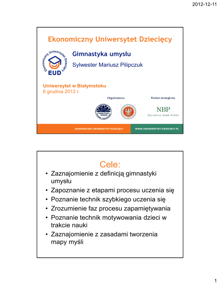 2012-12-11 Ekonomiczny Uniwersytet Dziecięcy Gimnastyka umysłu Sylwester Mariusz Pilipczuk Uniwersytet w Białymstoku 6 grudnia 2012 r. EKONOMICZNY UNIWERSYTET DZIECIĘCY WWW.UNIWERSYTET-DZIECIECY.PL Cele: • Zaznajomienie z definicją gimnastyki umysłu • Zapoznanie z etapami procesu uczenia się • Poznanie technik szybkiego uczenia się • Zrozumienie faz procesu zapamiętywania • Poznanie technik motywowania dzieci w trakcie nauki • Zaznajomienie z zasadami tworzenia mapy myśli 1 2012-12-11 Obraz + Akcja + Emocje = Pamięć Jest tylko jedna prawidłowa definicja Talentu – Twoja własna! 2 2012-12-11 Jakie są różnice między nauczaniem dzieci i dorosłych ? - Osoba ucząca czyli kto? Jaka jest rola doświadczenia? Praktycznie czy systemowo? Dlaczego dzieci się uczą? Gimnastyka umysłu • Gimnastyka umysłu – ćwiczenie aktywności ogólnej sprawności mózgu, stwarzające idealne podstawy do rozwoju wszystkich jego wartości, takich jak pamięć, umiejętność uczenia się, koncentracja i kreatywność. 3 2012-12-11 Co to jest uczenie się? Uczenie się jest procesem, prowadzącym do trwałych zmian w zachowaniu jednostki poprzez nabywanie wiedzy, doświadczeń i umiejętności. Preferencje sensoryczne Preferencje sensoryczne - indywidualna zdolność, skłonność do odbierania oraz przetwarzania bodźców określonego rodzaju. Wyróżniamy: • wzrokowców • słuchowców • kinestetyków 4 2012-12-11 Co to jest pamięć ? Pamięć jest to zdolność do rejestrowania i ponownego przywoływania wrażeń zmysłowych, skojarzeń bądź informacji. Rodzaje pamięci • Ikoniczna • Krótkoterminowa • Długoterminowa 5 2012-12-11 Fazy procesu zapamiętania • Kodowanie • Przechowywanie informacji • Odtwarzanie (wydobywanie informacji pamięciowych) Przyczyny zapominania • Brak niezbędnego skupienia uwagi na przyswajanej informacji • Osłabienie zapisu pamięciowego wynikające z braku powtarzania przyswojonej informacji • Zakłócenie zapisu przez inne zapisy pamięciowe 6 2012-12-11 Aby usunąć przyczyny zapominania należy: • Zadbać o odpowiednie skupienie uwagi w trakcie w przyswajania informacji • Stosować powtarzanie • Unikać zakłóceń Zapamiętaj! Zapamiętywanie jest efektywne, gdy je realizujesz przez umiejętnie odwołanie się do wcześniej przyswojonego materiału. 7 2012-12-11 Stożek Dale`a Przyswajanie zapamiętywanego materiału w funkcji czasu Źródło: http://pl.wikibooks.org/wiki/Organiczna_technika_studiowania/Rytmy 8 2012-12-11 Optymalny rozkład powtórek materiału Źródło: http://pl.wikibooks.org/wiki/Organiczna_technika_studiowania/Rytmy Funkcje półkul mózgowych 9 2012-12-11 Prawa półkula kontroluje funkcje: • wizualne • przestrzenne • postrzegane całościowo • emocjonalne • abstrakcyjne • kształty i schematy Lewa półkula mózgu kontroluje funkcje: • • • • • • werbalne językowe postrzeganie szczegółów praktyczne konkretne porządek linearny 10 2012-12-11 Jak zwiększyć potencjał umysłu? • Badania naukowe wykazały, że półkule mózgu spełniają odmienne funkcje. Zwykle półkulą dominującą jest lewa, natomiast prawa półkula wykazuje mniejszą aktywność. • Współpraca obydwu półkul mózgowych stanowi klucz do metod szybkiego uczenia się i doskonalenia naszej pamięci. Udowodniono, że pobudzając do współpracy „słabszą” półkulę z półkulą dominującą, sprawność intelektualna wzrasta w sposób lawinowy. Co to są mnemotechniki ? • Mnemotechniki, to sposoby ułatwiające zapamiętanie, przechowywanie i przypominanie informacji z pamięci. Dzięki technikom pamięciowym, można w niezwykle szybki i łatwy sposób zwiększyć zakres oraz trwałość pamięci. • Wyraz „mnemotechnika” pochodzi od greckiego słowa: mneme – pamięć, oraz greckiej bogini pamięci – Mnemozyny. Twórcą technik pamięciowych jest Simonides z greckiej wyspy Keos. 11 2012-12-11 Mnemotechniki • • • • Łańcuchowa metoda skojarzeń Zakładki obrazkowe Rymowanki Rzymski pokój czyli zakładki mieszkaniowe Jeden obraz jest więcej wart, niż tysiąc słów… 12 2012-12-11 Efektywne uczenie się • Wyobraźnia to najwyższa forma energii umysłowej, jaką mamy do naszej dyspozycji. • To siła skutecznego uczenia się i warunek naszego rozwoju. Rozum analizuje i organizuje, wyobraźnia zaś tworzy. Co to jest mapa myśli? • Mapy myśli to narzędzie zwiększające kreatywność i produktywność, które może podnieść również efektywność uczenia się. Mózg pracuje w sposób integrujący i koncepcyjny, mapy myśli uwzględniają ten mechanizm dzięki czemu możemy bardzo skutecznie notować zgodnie z naturą mózgu. 13 2012-12-11 Główne zasady tworzenia mapy myśli 1. Notuj na czystej kartce papieru, ułożonej poziomo, format (co najmniej A4) 2. Temat mapy w centrum kartki, oznacz symbolem 3. Od środka mapy prowadź linie jak gałęzie drzewa 4. Używaj słów-kluczy Główne zasady tworzenia mapy myśli 5. Zostawiaj wolne linie 6. Stosuj numerację głównych linii 7. Stosuj własne oznaczenia i symbole 14 2012-12-11 Przykładowa mapa myśli (źródło: www.edu.bialystok.pl): Doświadczam więc jestem! • Uczniowie powinni choć raz doświadczyć porażki, aby zrozumieć, że jest to integralna część procesu edukacyjnego. • Uczniowie muszą się nauczyć, jak zdobywać wiedzę i wciąż poznawać nowe strategie pokonywania przeszkód na drodze do sukcesu, zamiast przyzwyczajać się do osiągania sukcesu bez wysiłku. 15 2012-12-11 Bibliografia: Brophy J., Motywowanie uczniów do nauki, Warszawa 2002 Brześkiewicz W.Z, Superumysł, Katowice 1997 Buzan T., Mapy myśli dla biznesu, Łódź 2011 Buzan T., Rusza głową, Łódź 2000 Dzierzgowska I., Jak uczyć metodami aktywnymi, Warszawa 2005 Lipnicka B., Kształtowanie zdolności i talentu dziecka, Kraków 2000 Locke E.A., Jak uczyć się efektywnie, Poznań 2004 Placha K., O lepsz