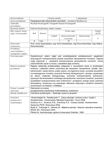 Kod przedmiotu nazwa przedmiotu Jednostka prowadząca Kierunek studiów Rok, semestr, formy zajęć i liczba godzin Rodzaj studiów stacjonarne Funkcjonowanie ekosystemów morskich – przedmiot fakultatywny Wydział Oceanografii i Geografii Instytut Oceanografii Ochrona Środowiska, studia I stopnia Formy zajęć Rok Semestr Punkty ECTS wykład Kierownik i realizatorzy Przedmioty wprowadzające i wymagania wstępne Cele nauczania Ramowy program przedmiotu Forma i warunki zaliczenia Metody dydaktyczne Literatura podstawowa i uzupełniająca konwersatorium/ laboratorium 2 ćwiczenia II letni 30 Prof. Anna Szaniawska, mgr Anna Dziubińska, mgr Ilona Kamińska, mgr Halina Rzemykowska Zasadniczym celem zajęć jest przedstawienie podstawowych zagadnień dotyczących funkcjonowania przede wszystkim ekosystemów morskich. Zajęcia mają zapoznać z zasadami funkcjonowania ekosystemów morskich, oceną różnorodności życia w morzu i zasadami jego ochrony. Zajęcia obejmują problematykę związaną z: warunkami życia w środowisku wodnym i wpływem takich czynników jak zasolenie, temperatura, światło, tlen, siarkowodór, osady denne, prądy i pływy, na organizmy żywe, a przede wszystkim na bezkręgowce morskie; poznanie formacji ekologicznych i sprzętu używanego do zbioru materiału biologicznego; poznanie funkcjonowania wybranych, typowych dla środowiska morskiego ekosystemów i biocenoz morskich; poznanie przykładów funkcjonowania sieci troficznych i przepływu energii przez wybrane ekosystemy, biocenozy czy populacje; elementy dotyczące morskich obszarów chronionych na świecie i w Bałtyku. Zaliczenie na ocenę przygotowanie prezentacji multimedialnej, kolokwium ćwiczenia audytoryjne – dyskusja, praca w grupach Wolnomiejski N., Pawlikowski T.. Zarys ekologii i ochrony mórz. Część I. Wydawnictwo Uniwersytetu Mikołoja Kopernika. Toruń 2006 Duxbury A.C., Duxbury A.B., Sverdrup K.A.. Oceany świata. Wydawnictwo Naukowe PWN. Warszawa 2002 Byatt A., Fothergill A., Holmes M.. Błękitna planeta. Historia naturalna oceanów. MUZA SA. Warszawa 2002 Pliński M. Hydrobiologia ogólna.Uniwersytet Gdański, 1992
