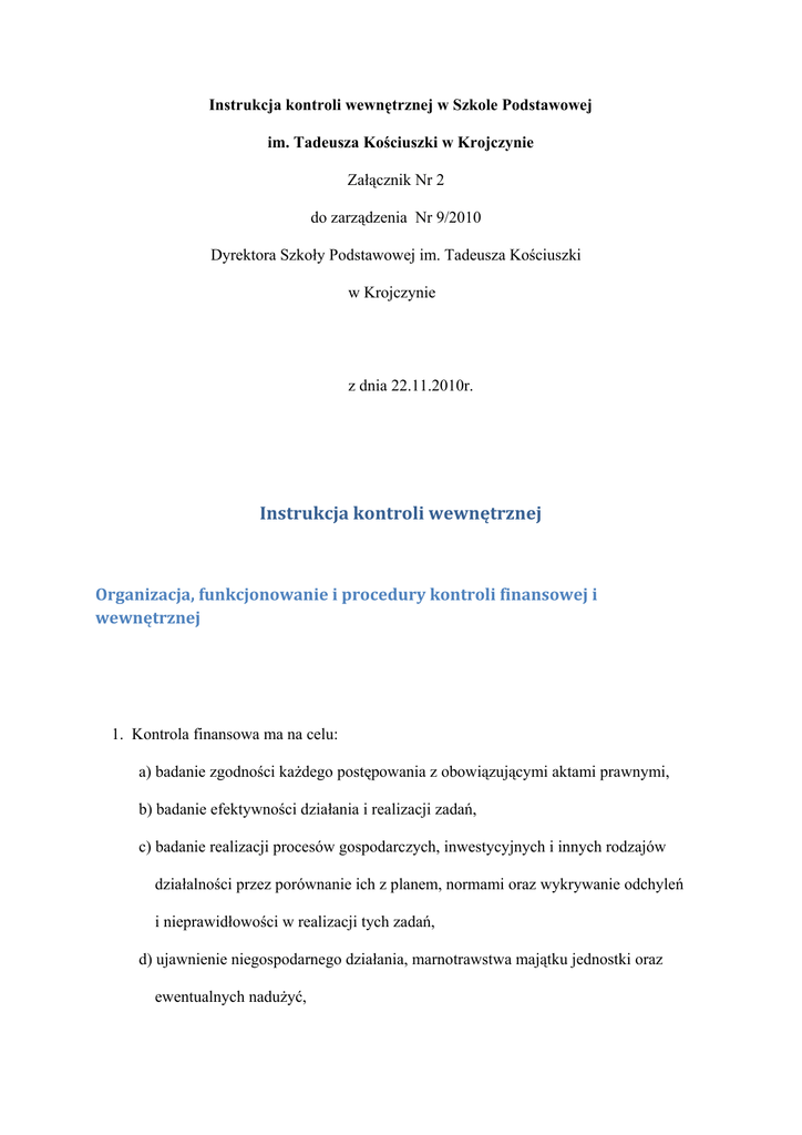 Instrukcja kontroli wewnętrznej w Szkole Podstawowej im. Tadeusza Kościuszki w Krojczynie Załącznik Nr 2 do zarządzenia Nr 9/2010 Dyrektora Szkoły Podstawowej im. Tadeusza Kościuszki w Krojczynie z dnia 22.11.2010r. Instrukcja kontroli wewnętrznej Organizacja, funkcjonowanie i procedury kontroli finansowej i wewnętrznej 1. Kontrola finansowa ma na celu: a) badanie zgodności każdego postępowania z obowiązującymi aktami prawnymi, b) badanie efektywności działania i realizacji zadań, c) badanie realizacji procesów gospodarczych, inwestycyjnych i innych rodzajów działalności przez porównanie ich z planem, normami oraz wykrywanie odchyleń i nieprawidłowości w realizacji tych zadań, d) ujawnienie niegospodarnego działania, marnotrawstwa majątku jednostki oraz ewentualnych nadużyć, e) ustalenie przyczyn i skutków stwierdzonych nieprawidłowości oraz ustalenie osób odpowiedzialnych za ich powstanie, f) wskazanie sposobów i środków umożliwiających likwidację tych nieprawidłowości. 2. Badania i oceny należy dokonywać w zakresie celowości, gospodarności, rzetelności i legalności działania oraz sprawności organizacji pracy. 3. Za zorganizowanie i prawidłowe funkcjonowanie systemu kontroli finansowej odpowiedzialny jest kierownik jednostki. Sprawuje on osobiście ogólny nadzór nad skutecznością działania systemu, jak również prawidłowością wykorzystania sygnałów kontroli wewnętrznej i zewnętrznej. Odpowiedzialny jest również za należyte wykorzystanie wyników kontroli. 4. Kontrola funkcjonalna– sprawowana z urzędu w ramach powinności kierowniczych, bądź z racji zobowiązania pracowników na stanowiskach nie kierowniczych do wykonania określonych funkcji kontrolnych. a) Kontrola merytoryczna– sprawdzenie dowodów księgowych od strony ich: - rzetelności – zgodności z rzeczywistością, gospodarności – czy nie można było przeprowadzić tej operacji taniej lub lepiej, - celowości – czy operacja w tym momencie była niezbędna. b) Kontrola formalno-rachunkowapolega na sprawdzeniu, czy operacja nie jest sprzeczna z przepisami prawa, czy zdarzenie gospodarcze zostało potwierdzone poprawnym dokumentem, określonym przepisami ustawy o rachunkowości, czy dokument ten zawiera ślady dokonanej kontroli merytorycznej, czy dane liczbowe tego dokumentu nie zawierają błędów arytmetycznych, a także obejmuje zakwalifikowanie operacji do ujęcia w księgach rachunkowych, przez wskazanie miesiąca i sposobu księgowania. 5. Czynności kontrolne w zakresie swych uprawnień wykonują także z urzędu: Nazwisko i imię Lp. Upoważniony do: Podpis stanowisko Elżbieta Zalewska 1. Dyrektor szkoły Kinga Szczypińska 2. Główny Księgowy ZOS w Dobrzyniu n.Wisłą Sprawdzania dowodów dotyczących działalności SP w Krojczynie pod względem merytorycznym, zatwierdzania do zapłaty faktur i rachunków. Sprawdzania dowodów księgowych dotyczących działalności SP w Krojczynie pod względem formalno-rachunkowym, zatwierdzania do zapłaty faktur i rachunków, podpisywania poleceń przelewów i czeków oraz faktur za świadczone usługi. Agata Milewska Prowadzenie kadr pracowników. 3. Sekretarka szkoły 6. Kontrola finansowa dotyczy procesów związanych z gromadzeniem i rozdysponowaniem środków publicznych oraz gospodarowaniem mieniem. 7. Kontrola finansowa obejmuje: a) zapewnienie przestrzegania procedur kontroli oraz przeprowadzania wstępnej oceny zaciągania zobowiązań finansowych i dokonywania wydatków, b) badanie i porównanie stanu faktycznego ze stanem wymaganym, pobierania i gromadzenia środków publicznych, zaciągania zobowiązań finansowych, dokonywania wydatków ze środków publicznych, udzielania zamówień publicznych oraz zwrotu środków publicznych, c) prowadzenie gospodarki finansowej oraz stosowanie procedur, o których mowa w punkcie a). 8. Kontrola finansowa dokonywana jest w formie: a) kontroli wstępnej, mającej na celu zapobieganie niepożądanym lub nielegalnym działaniom; kontrola wstępna obejmuje w szczególności badanie projektów umów, porozumień i innych dokumentów powodujących powstanie zobowiązań. Przedmiotem tej kontroli jest również działanie mające na celu sprawdzenie, czy realizowane wydatki mają swoje odbicie w planie finansowym jednostki i są z nim zgodne, a także czy są one celowe i związane z realizacją zadań jednostki. Szczególnej ocenie należy poddać celowość dokonywanych wydatków związanych z funkcjonowaniem jednostki.; W trakcie tej kontroli szczególną uwagę należy zwrócić na: - czy planowane wydatki są dokonywane w sposób celowy i oszczędny, - sposób dokonywania wydatków umożliwi terminową realizację zadań. b) kontroli bieżącej, polegającej na badaniu czynności i operacji w toku ich wykonywania w celu stwierdzenia, czy przebiegają one prawidłowo; bada się również rzeczywisty stan rzeczowych i pieniężnych składników majątkowych oraz prawidłowość ich zabezpieczenia przed kradzieżą, zniszczeniem, uszkodzeniem itp.; c) kontroli następnej, obejmującej badanie stanu faktycznego i dokumentów odzwierciedlających czynności już dokonane. 9. Dowodem dokonania kontroli przez kierownika jednostki jest podpis złożony na dokumentach dotyczących danej operacji Złożenie podpisu kierownika administracyjno-gospodarczego na dowodach księgowych, oznacza, że: a) nie zgłasza on zastrzeżeń do oceny prawidłowości merytorycznej tej operacji i jej zgodności z prawem, b) zobowiązania wynikające z operacji mieszczą się w planie finansowym i harmonogramie wydatków, a jednostka posiada środki finansowe na ich pokrycie. 10. Dowodem dokonania kontroli przez głównego księgowego jest podpis złożony na dokumentach dotyczących danej operacji. Złożenie podpisu głównego księgowego, oznacza, że: a) nie zgłasza zastrzeżeń do przedstawionej przez właściwych rzeczowo pracowników oceny prawidłowości merytorycznej te