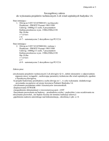 Załącznik nr 3 Szczegółowy zakres do wykonania projektów technicznych 2-ch wind szpitalnych budynku 1A Stan istniejący : 1. Dźwig nr UDT N3107000183 ( na kluczyk) Producent - PROFIT Poznań 1985/1998 Udźwig -1000kg/13 osób, 6 przystanków Kabina przelotowa wym. 1500x2500x2150 Hp-18,6m v=1,0 m/s i=6 d=7 – automatyczne 2 skrzydłowe typ PC/C2A Stan istniejący: 2. Dźwig nr UDT N3107000184 ( zielona ) Producent - PROFIT Poznań 1985/1998 Udźwig -1000kg/13 osób, 7 przystanków Kabina przelotowa wym. 1500x2500x2150 Hp-19,8m v=1,0 m/s i=7 d=9 – automatyczne 2 skrzydłowe typ PC/C2A Zakres prac: a)wykonanie projektów technicznych 2-ch dźwigów Q-1t , dobór elementów z odpowiednim zapasem mocy wciągarki , zachowując parametry techniczne dla wind szpitalnych, zgodnie z Dyrektywą dźwigową b) projekt budowlany przebudowy szybu dźwigu nr 1 , w celu wykonania dodatkowego przystanku na parterze od strony korytarza Pediatrii Budynku 1A c)wykonanie przedmiaru robót i kosztorysów inwestorskich. d)opracowanie STWiOR e)uzgodnienie dokumentacji z rzeczoznawcą p.poŜ. ,UDT f)uzyskanie pozwolenia na budowę – przebudowa szybu i podszybia ( czas oczekiwania na otrzymanie pozwoleń , nie będzie liczony do terminu realizacji umowy) g)pełnienia nadzoru autorskiego nad dokumentacją , określoną w pkt. a i b