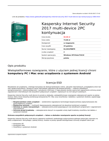Dane aktualne na dzień: 03-03-2017 17:42 Link do produktu: https://www.galeosoft.pl/kaspersky-internet-security-2017-multi-device-2pc-kontynuacja-p-1964.html Kaspersky Internet Security 2017 multi-device 2PC kontynuacja Cena brutto 92.00 zł Cena netto 74.80 zł Dostępność w magazynie Czas wysyłki 24 godziny Numer katalogowy KL1941PBBFR Liczba urządzeń 2 System operacyjny Windows XP/Vista/7/8/10 Wersja językowa polska Opis produktu Wieloplatformowe rozwiązanie, które z użyciem jednej licencji chroni komputery PC i Mac oraz urządzenia z systemem Android licencja ESD Niezależnie od urządzenia, z którego korzystasz do obsługi bankowości online, zakupów internetowych, przeglądania stron lub sieci społecznościowych, istnieją te same internetowe zagrożenia dla bezpieczeństwa — infekcje szkodliwym oprogramowaniem, cyberprzestępczość i wyłudzanie informacji. Z tego powodu bardzo ważne jest zapewnienie ochrony przed zagrożeniami internetowymi dla wszystkich połączonych urządzeń i zapisanych na nich danych osobistych. Kaspersky Internet Security multi-device to proste w obsłudze, wieloplatformowe rozwiązanie zabezpieczeń oparte na jednej licencji, które chroni dowolną kombinację komputerów PC i Mac oraz smartfonów i tabletów z systemem Android, zapewniając następujące funkcje: Bezpieczeństwo wielu urządzeń — wielokrotnie nagradzane technologie bezpieczeństwa zoptymalizowane dla poszczególnych urządzeń Elastyczna ochrona — możliwość dopasowywania zabezpieczeń do dowolnej kombinacji urządzeń Ochrona w czasie rzeczywistym — zabezpieczenie przed pojawiającymi się szkodliwymi programami i zagrożeniami internetowymi Ochrona przed kradzieżą — zabezpieczenie danych na wypadek utraty bądź kradzieży smartfonu lub tabletu z systemem Android Ochrona wszystkich połączonych urządzeń — łatwe w obsłudze rozwiązanie oparte na jednej licencji Kaspersky Internet Security multi-device zapewnia możliwość swobodnego wykorzystania pełnego potencjału internetu na wielu urządzeniach. Korzystając z jednej licencji, możesz w prosty sposób skonfigurować ochronę urządzeń takich jak: Komputery PC Komputery Mac Smartfony z systemem Android wygenerowano w programie shopGold Tablety z systemem Android Zapewnienie zabezpieczeń, które można dopasowywać do używanych urządzeń Kaspersky Internet Security multi-device stanowi wygodny sposób zabezpieczenia praktycznie dowolnej kombinacji urządzeń: Przykładowo licencja na pięć urządzeń pozwala objąć ochroną: 1 komputer stacjonarny, 2 laptopy i 2 smartfony z systemem Android lub 2 smartfony z systemem Android, 2 tablety z systemem Android i 1 komputer Mac Niezależnie od kombinacji używanych urządzeń, każde z nich będzie chronione przez nagradzane technologie zabezpieczeń firmy Kaspersky Lab. W okresie obowiązywania licencji możesz zmieniać chronione urządzenia, przenosząc zabezpieczenia między nimi. Optymalizacja ochrony, wydajności i użyteczności dla wszystkich urządzeń Komputery PC i Mac, tablety i smartfony posiadają odmienne wymagania w zakresie zabezpieczeń. Kaspersky Internet Security multi-device to jedno proste i elastyczne rozwiązanie zabezpieczeń, zapewniające: Funkcje ochrony zoptymalizowane dla każdego typu urządzenia Technologie zabezpieczeń, które pozwalają zachować wysoką wydajność wszystkich urządzeńTechnologie zabezpieczeń, które pozwalają zachować wysoką wydajność wszystkich urządzeń Proste w obsłudze interfejsy, które są dopasowane do poszczególnych urządzeń Ochronę w czasie rzeczywistym przed pojawiającymi się szkodliwymi programami i zagrożeniami internetowymi Niezależnie od tego, czy używasz komputera PC lub Mac czy smartfonu i tabletu z systemem Android, rozwiązanie Kaspersky Internet Security multi-device zapewnia następujące funkcje: Wszystkie aplikacje, które są otwierane, zapisywane lub pobierane z internetu, są natychmiast skanowane. Rozwiązanie na bieżąco monitoruje i analizuje potencjalne zagrożenia, a niebezpieczne działania są blokowane, zanim zdążą spowodować jakąkolwiek szkodę. Zabezpieczanie danych na zgubionym urządzeniu z systemem Android dzięki doskonałej ochronie przed kradzieżą Jeśli smartfon lub tablet z systemem Android zostanie utracony albo skradziony, rozwiązanie Kaspersky Internet Security multidevice zapewnia zdalnie sterowane funkcje, które pomagają: Chronić informacje osobiste na urządzeniu przez zablokowanie go, wymazanie danych, wyemitowanie alarmu i zrobienie zdjęć nieautoryzowanych użytkowników Określić lokalizację zgubionego smartfonu lub tabletu z systemem Android Najważniejsze funkcje Zespoły badań i rozwoju firmy Kaspersky Lab, cieszące się uznaniem za swoje światowej klasy doświadczenie w zakresie bezpieczeństwa internetowego i eliminacji szkodliwego oprogramowania, stworzyły szeroką gamę innowacyjnych funkcji w celu zabezpieczenia wszystkich urządzeń chronionych przez rozwiązanie Kaspersky Internet Security multi-device: Komputerów z systemem Windows Komputerów Mac Smartfonów i tabletów z systemem Android Ochrona komputerów z systemem Windows Zaawansowane wirusy komputerowe i złożone zagrożenia internetowe mogą naruszyć bezpieczeństwo komputera i cennych wygenerowano w programie shopGold informacji osobistych. Nagradzane technologie zabezpieczeń firmy Kaspersky Lab chronią komputer przed wszystkimi typami szkodliwego oprogramowania i zagrożeniami internetowymi — łącznie z cyberprzestępcami, którzy próbują ukraść pieniądze lub tożsamość użytkowników. Główne funkcje Ochrona komputerów przed szkodliwym oprogramowaniem, w tym przed wirusami, robakami, trojanami, programami szpiegującymi, rootkitami, botami i wiele więcej Ochrona w czasie rzeczywistym (z wykorzystaniem chmury) przed nowo pojawiającymi się szkodliwymi programami i zagrożeniami internetowymi Bezpieczne pieniądze 