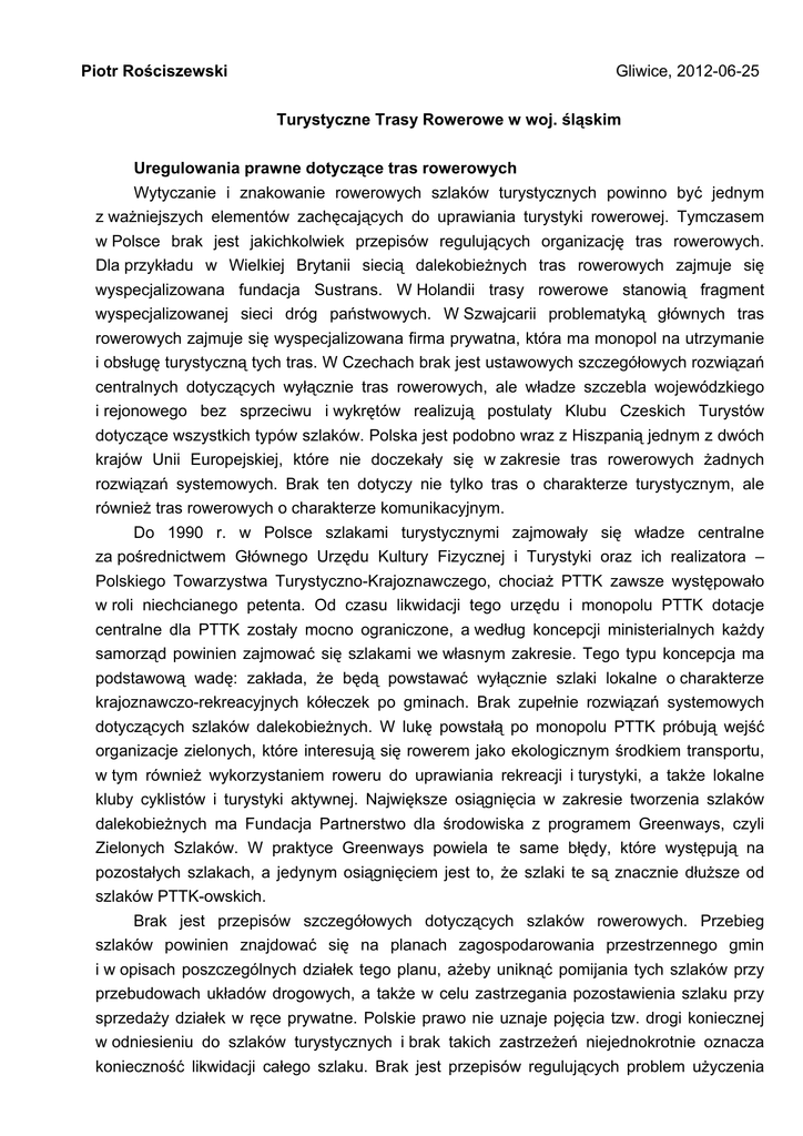 Piotr Rościszewski Gliwice, 2012-06-25 Turystyczne Trasy Rowerowe w woj. śląskim Uregulowania prawne dotyczące tras rowerowych Wytyczanie i znakowanie rowerowych szlaków turystycznych powinno być jednym z ważniejszych elementów zachęcających do uprawiania turystyki rowerowej. Tymczasem w Polsce brak jest jakichkolwiek przepisów regulujących organizację tras rowerowych. Dla przykładu w Wielkiej Brytanii siecią dalekobieżnych tras rowerowych zajmuje się wyspecjalizowana fundacja Sustrans. W Holandii trasy rowerowe stanowią fragment wyspecjalizowanej sieci dróg państwowych. W Szwajcarii problematyką głównych tras rowerowych zajmuje się wyspecjalizowana firma prywatna, która ma monopol na utrzymanie i obsługę turystyczną tych tras. W Czechach brak jest ustawowych szczegółowych rozwiązań centralnych dotyczących wyłącznie tras rowerowych, ale władze szczebla wojewódzkiego i rejonowego bez sprzeciwu i wykrętów realizują postulaty Klubu Czeskich Turystów dotyczące wszystkich typów szlaków. Polska jest podobno wraz z Hiszpanią jednym z dwóch krajów Unii Europejskiej, które nie doczekały się w zakresie tras rowerowych żadnych rozwiązań systemowych. Brak ten dotyczy nie tylko tras o charakterze turystycznym, ale również tras rowerowych o charakterze komunikacyjnym. Do 1990 r. w Polsce szlakami turystycznymi zajmowały się władze centralne za pośrednictwem Głównego Urzędu Kultury Fizycznej i Turystyki oraz ich realizatora – Polskiego Towarzystwa Turystyczno-Krajoznawczego, chociaż PTTK zawsze występowało w roli niechcianego petenta. Od czasu likwidacji tego urzędu i monopolu PTTK dotacje centralne dla PTTK zostały mocno ograniczone, a według koncepcji ministerialnych każdy samorząd powinien zajmować się szlakami we własnym zakresie. Tego typu koncepcja ma podstawową wadę: zakłada, że będą powstawać wyłącznie szlaki lokalne o charakterze krajoznawczo-rekreacyjnych kółeczek po gminach. Brak zupełnie rozwiązań systemowych dotyczących szlaków dalekobieżnych. W lukę powstałą po monopolu PTTK próbują wejść organizacje zielonych, które interesują się rowerem jako ekologicznym środkiem transportu, w tym również wykorzystaniem roweru do uprawiania rekreacji i turystyki, a także lokalne kluby cyklistów i turystyki aktywnej. Największe osiągnięcia w zakresie tworzenia szlaków dalekobieżnych ma Fundacja Partnerstwo dla środowiska z programem Greenways, czyli Zielonych Szlaków. W praktyce Greenways powiela te same błędy, które występują na pozostałych szlakach, a jedynym osiągnięciem jest to, że szlaki te są znacznie dłuższe od szlaków PTTK-owskich. Brak jest przepisów szczegółowych dotyczących szlaków rowerowych. Przebieg szlaków powinien znajdować się na planach zagospodarowania przestrzennego gmin i w opisach poszczególnych działek tego planu, ażeby uniknąć pomijania tych szlaków przy przebudowach układów drogowych, a także w celu zastrzegania pozostawienia szlaku przy sprzedaży działek w ręce prywatne. Polskie prawo nie uznaje pojęcia tzw. drogi koniecznej w odniesieniu do szlaków turystycznych i brak takich zastrzeżeń niejednokrotnie oznacza konieczność likwidacji całego szlaku. Brak jest przepisów regulujących problem użyczenia 2 dróg prywatnych na cele publiczne, a odpowiedzialność za szkody powstałe w wyniku takiego użyczenia nie jest ściśle określona. PTTK jako jedyne w Polsce opracowało kadłubową instrukcję oznakowania szlaków rowerowych, ale brak jest szczegółowych uregulowań prawnych z zasadami ich stosowania. Obecnie teoretycznie np. trzech niezależnych organizatorów tras rowerowych może w tym samym miejscu skrzyżować swoje szlaki w tym samym kolorze, nikt tego nie koordynuje i nikt za to nie odpowiada. Na wspólnych odcinkach kilku tras znaki powinny być umieszczane wspólnie, ale w przypadku dwóch administratorów tras nie wiadomo kto ma komu ustąpić. Kilka lat temu Ministerstwo Infrastruktury, nie pytając PTTK o zdanie, dwukrotnie zmieniło obowiązujące wzory znaków szlaków rowerowych. Zmieniono np. kształt kierownicy i siodełka piktogramu roweru oraz zróżnicowano kierunki usytuowania roweru, dodano do znaków czarną ramkę. Zabroniono stosowania znaków nieodblaskowych. Oczywiście kosztami zmian wynikających z tego tytułu obarczono administratorów szlaków, a z uwagi na małą wagę problemu na wielu szlakach znajdują się na przemian znaki ze starymi i nowymi piktogramami rowerów, pasków i strzałek. Brak jest jakichkolwiek uregulowań prawnych dotyczących klasyfikacji szlaków rowerowych ze standardami różnych typów w zależności od rodzaju i wielkości ruchu rowerowego, a także w zależności od parametrów technicznych trasy. Dla powstającej sieci tras rowerowych Ściany Wschodniej eksperci GDDKiA zaproponowali adaptowanie tymczasowo wzorów duńskich, najczęściej stosowanych w Europie. Współpraca pomiędzy samorządami a PTTK Chociaż PTTK jako jedyna organizacja w Polsce szkoli i zrzesza znakarzy, tj. osoby znające problematykę znakowania szlaków turystycznych, to samorządy rzadko korzystają ze współpracy z tym Towarzystwem. Przyczyna braku tej współpracy wynika ze złych nawyków obu stron. Wielu urzędników nie lubi, jak ktoś im psuje szyki i nie pozwala zlecać wykonywania prac osobom, które się na tym kompletnie nie znają, ale robią to taniej niż PTTK lub pod dyktando wydumanych życzeń urzędników. W ten sposób powstają kolejne kilometry statystycznych szlaków, które nikomu do niczego nie służą oprócz wypełniania kolejnych pozycji w sprawozdaniach, a na dodatek nigdy właściwie nie są promowane, nie są konserwowane i poprawiane, zwłaszcza w przypadku zmian personalnych w urzędach, które te szlaki popełniły. PTTK z kolei nie umie opanować organizacyjnie problematyki znakowania szlaków, a zwłaszcza nowej dziedziny, jaką są szlaki rowerowe. Za