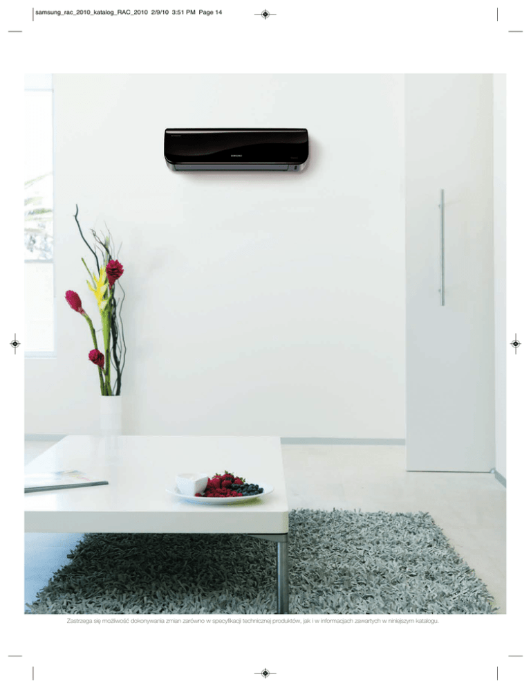 samsung_rac_2010_katalog_RAC_2010 2/9/10 3:51 PM Page 14 Zastrzega się możliwość dokonywania zmian zarówno w specyfikacji technicznej produktów, jak i w informacjach zawartych w niniejszym katalogu. samsung_rac_2010_katalog_RAC_2010 2/9/10 3:51 PM Page 16 MB Czarna perła w Twoim domu Wyjątkowe wzornictwo czarnej perłowej obudowy oraz dyskretna niebieska poświata wprowadzą niepowtarzalny styl w Twoim domu. Automatycznie zamykany panel przedni klimatyzatora zabezpiecza jego wnętrze przed osiadaniem kurzu, gdy urządzenie pozostaje wyłączone. Czarny perłowy Deodorizing Filter Automatyczny panel przedni Innowacyjne rozwiązanie, jakim jest automatycznie zamykany panel przedni klimatyzatora MB, chroni jego wnętrze przed zanieczyszczeniami, gdy urządzenie jest wyłączone. Dzięki temu zawsze, gdy włączysz swój klimatyzator, możesz cieszyć się czystym powietrzem. Po zamknięciu panela przedniego elementy wewnątrz klimatyzatora stają się niewidoczne, co sprawia, iż klimatyzator staje się dyskretnym i stylowym uzupełnieniem pomieszczenia. Zamknięty Otwarty Gdy klimatyzator jest wyłączony, zamknięty panel przedni uszczelnia obudowę, chroniąc filtry przed kurzem. Po włączeniu klimatyzatora panel przedni podnosi się, umożliwiając swobodny i niemalże bezgłośny nawiew czystego powietrza do pomieszczenia (20 dBA dla modelu 2,5 kW!) Cechy szczególne Lampa funkcji MPI Czarna perła Ukryty wyświetlacz Gdy funkcja oczyszczania powietrza MPI jest aktywna pod panelem przednim, widoczne jest niebieskie światło. Kolor wyjątkowej elegancji, który uzupełni wystrój wyrafinowanego wnętrza. Wyświetlacz temperatury i funkcji urządzenia staje się niewidoczny po opuszczeniu panelu przedniego. 16 samsung_rac_2010_katalog_RAC_2010 2/9/10 3:51 PM Page 17 MB S-Inverter Czynnik chłodniczy Model S-Inverter R410a R410a AQV09ABBN AQV12ABBN Parametry Chłodzenie Wydajność kW min.-max. Grzanie kW 2,5 3,5 0,92~3,2 0,92~4,0 3,4 4,0 min.-max. 0,92~5,0 0,92~5,5 Chłodzenie EER (W/W) 4,4 3,6 Grzanie COP (W/W) 4,2 3,7 Osuszanie l/h 1,0 1,4 Wydajność wentylatora (max.) m3/min 8,0 9,0 Efektywność energetyczna Poziom ciśnienia akustycznego Wewnętrzna wysoki/ niski dB 31/ 20 35/ 21 Zewnętrzna wysoki dB 45 45 220~240/50/1 220~240/50/1 Dane elektryczne Zasilanie V/Hz/Φ Chłodzenie W 570 970 Grzanie W 810 1080 Chłodzenie A 3,0 4,5 Grzanie A 4,0 5,2 Wewnętrzna mm 900 x 304 x 185 900 x 304 x 185 Zewnętrzna mm 790 x 548 x 285 790 x 548 x 285 Wewnętrzna kg 10,2 10,2 Zewnętrzna kg 35 35 Wewnętrzna kg 12,6 12,6 Zewnętrzna kg 38 38 Średnica przyłączy Ciecz/ Gaz mm Φ 6,35/ 9,52 Φ 6,35/ 9,52 Długość instalacji Max. m 15 15 Różnica poziomów Max. m 8 8 MPI ● ● Good Sleep II ● ● Filtr Silver Nano ● ● Parownik Silver Nano ● ● ● ● ● - ● - Moc elektryczna Pobór prądu Wymiary i waga Wymiary netto (szer. x wys. x głęb.) Waga netto Waga brutto Instalacja chłodnicza Filtr DNA Oczyszczanie powietrza Filtr czyszczący (HAF) Filtr katechinowy - - Digital i Plus ● - ● - Osuszanie ● ● Tryb Turbo ● ● Timer ● ● Tryb oszczędzania energii ● ● Automatyczny restart ● ● Automatyczna zmiana trybu pracy ● ● Automatyczna regulacja nawiewu ● 4/ 3 ● 4/ 3 Filtr dezodoryzujący Tryby pracy/ sterowania Liczba stopni nawiewu (chłodzenie/ wentylacja) Sterowanie kierunkiem nawiewu (góra/ dół) Wygodne funkcje Auto Auto Manualne Manualne Automatycznie otwierany panel przedni ● ● Pilot zdalnego sterowania ● ● ● Rotacyjna ● Rotacyjna Sterowanie kierunkiem nawiewu (lewo/ prawo) Automatyczne osuszanie wymiennika Inne Typ sprężarki Zakres temperatur pracy dla jednostki zewnętrznej Chłodzenie ℃ -10~46 -10~46 Grzanie ℃ -15~24 -15~24 Crystal Filtr antywirusowy Forte Silver Nano Health System MB Funkcje Max Pilot zdalnego sterowania i jednostka zewnętrzna Inverter Pilot zdalnego sterowania 2,5 kW 3,5 kW 17