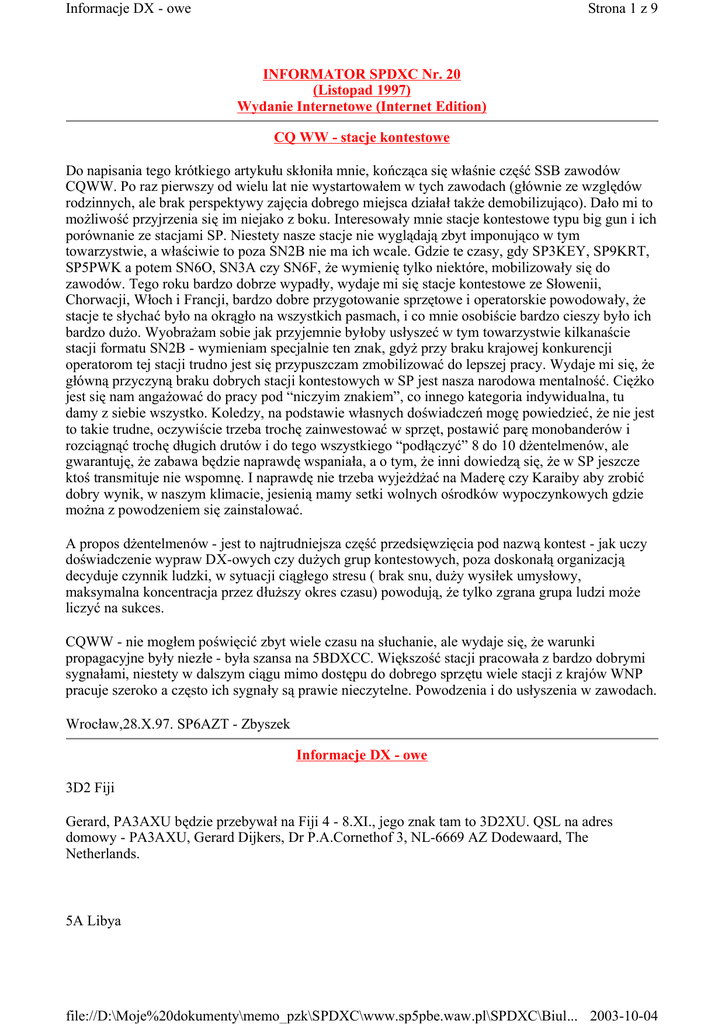Informacje DX - owe Strona 1 z 9 INFORMATOR SPDXC Nr. 20 (Listopad 1997) Wydanie Internetowe (Internet Edition) CQ WW - stacje kontestowe Do napisania tego krótkiego artyku u sk oni a mnie, ko cz ca si w nie cz SSB zawodów CQWW. Po raz pierwszy od wielu lat nie wystartowa em w tych zawodach (g ównie ze wzgl dów rodzinnych, ale brak perspektywy zaj cia dobrego miejsca dzia tak e demobilizuj co). Da o mi to mo liwo przyjrzenia si im niejako z boku. Interesowa y mnie stacje kontestowe typu big gun i ich porównanie ze stacjami SP. Niestety nasze stacje nie wygl daj zbyt imponuj co w tym towarzystwie, a w ciwie to poza SN2B nie ma ich wcale. Gdzie te czasy, gdy SP3KEY, SP9KRT, SP5PWK a potem SN6O, SN3A czy SN6F, e wymieni tylko niektóre, mobilizowa y si do zawodów. Tego roku bardzo dobrze wypad y, wydaje mi si stacje kontestowe ze S owenii, Chorwacji, W och i Francji, bardzo dobre przygotowanie sprz towe i operatorskie powodowa y, e stacje te s ycha by o na okr o na wszystkich pasmach, i co mnie osobi cie bardzo cieszy by o ich bardzo du o. Wyobra am sobie jak przyjemnie by oby us ysze w tym towarzystwie kilkana cie stacji formatu SN2B - wymieniam specjalnie ten znak, gdy przy braku krajowej konkurencji operatorom tej stacji trudno jest si przypuszczam zmobilizowa do lepszej pracy. Wydaje mi si , e ówn przyczyn braku dobrych stacji kontestowych w SP jest nasza narodowa mentalno . Ci ko jest si nam anga owa do pracy pod “niczyim znakiem”, co innego kategoria indywidualna, tu damy z siebie wszystko. Koledzy, na podstawie w asnych do wiadcze mog powiedzie , e nie jest to takie trudne, oczywi cie trzeba troch zainwestowa w sprz t, postawi par monobanderów i rozci gn troch d ugich drutów i do tego wszystkiego “pod czy ” 8 do 10 d entelmenów, ale gwarantuj , e zabawa b dzie naprawd wspania a, a o tym, e inni dowiedz si , e w SP jeszcze kto transmituje nie wspomn . I naprawd nie trzeba wyje na Mader czy Karaiby aby zrobi dobry wynik, w naszym klimacie, jesieni mamy setki wolnych o rodków wypoczynkowych gdzie mo na z powodzeniem si zainstalowa . A propos d entelmenów - jest to najtrudniejsza cz przedsi wzi cia pod nazw kontest - jak uczy do wiadczenie wypraw DX-owych czy du ych grup kontestowych, poza doskona organizacj decyduje czynnik ludzki, w sytuacji ci ego stresu ( brak snu, du y wysi ek umys owy, maksymalna koncentracja przez d szy okres czasu) powoduj , e tylko zgrana grupa ludzi mo e liczy na sukces. CQWW - nie mog em po wi ci zbyt wiele czasu na s uchanie, ale wydaje si , e warunki propagacyjne by y niez e - by a szansa na 5BDXCC. Wi kszo stacji pracowa a z bardzo dobrymi sygna ami, niestety w dalszym ci gu mimo dost pu do dobrego sprz tu wiele stacji z krajów WNP pracuje szeroko a cz sto ich sygna y s prawie nieczytelne. Powodzenia i do us yszenia w zawodach. Wroc aw,28.X.97. SP6AZT - Zbyszek Informacje DX - owe 3D2 Fiji Gerard, PA3AXU b dzie przebywa na Fiji 4 - 8.XI., jego znak tam to 3D2XU. QSL na adres domowy - PA3AXU, Gerard Dijkers, Dr P.A.Cornethof 3, NL-6669 AZ Dodewaard, The Netherlands. 5A Libya file://D:\Moje%20dokumenty\memo_pzk\SPDXC\www.sp5pbe.waw.pl\SPDXC\Biul... 2003-10-04 Informacje DX - owe Strona 2 z 9 Grupa niemieckich operatorów w sk adzie Andy/DJ7IK, Dieter/DL3KDV, Felix/DL8OBC, Michael/DL2EBX i Thomas/DL1GGT b dzie czynna z Libii ze stacji klubowej 5A1A w dniach 23.XI. - 3.XII. Wezm udzia w CQ WW DX Contest CW, zabieraj dwie kompletne stacje ze wzmacniaczami, praca all bands cznie z 160 m i WARC oraz wy ej : 50 + 144 MHz, CW/SSB/RTTY. Na kontest wyst pili o znak 5A7A - czy go dostan wkrótce us yszymy. Podczas ich pobytu ma funkcjonowa dost p do ich logów na stronie w Internecie pod adresem : http://www.afthd.th-darmstadt.de/5a1a/ Komentarze, opinie, sugestie b dzie mo na im przes w czasie ich aktywno ci na adres e-mail, w tej chwili nie jest znany, z pewno ci b dzie podany na podanym wy ej adresie strony. Funkcjonowa równie b dzie DX reflector organizowany przez K7ON, wystarczy wys na adres podawane na bie co [email protected] tylko jedno s owo libya w tre ci listu. T drog b informacje o stanie wyprawy jak i przyjmowane sprz enie zwrotne do cz onków wyprawy. QSL manager - tylko za t aktywno - DL3KDV : Dieter Voss, Friedrichsthal 21, D-51688 Wipperfuerth, Germany. Chc c otrzyma kart direct wystarczy wys 1$ na pokrycie kosztów wysy ki. Wszystkie wp ywy ekstra b przeznaczone na wsparcie rozwoju krótkofalarstwa w Libii. Je li kto jest cierpliwy i mo e poczeka to wszystkie czno ci b potwierdzone via biuro. 5T Mauritania Yoshi, JA1UT wraz z kolegami b dzie w dniach 6 - 13.XI. pracowa z Mauretanii jako 5T5U ównie na ni szych pasmach. QSL via JA1UT. 6Y Jamaica Na CQ WW CW Contest z Jamajki (NA-097) szykuj si AG9A, JE3MAS, JI3ERV, K2KW, KE7X, N6BT, N6TV, W4SO i W9QA. Znak 6Y4A, kategoria oczywi cie - to co tygrysy lubia najbardziej Multi-Multi. Przed i po zawodach - 21.XI. do 2.XII. - b pracowa ze swoimi znakami /6Y. QSL za 6Y4A do WA4WTG, poza zawodami na znaki domowe. 8Q Maldives Bruce, KD6WW b dzie pracowa jako 8Q7AJ do 10.XI. g ównie telegrafi na WARC. QSL do KD6WW direct lub via biuro. 9G Ghana Kolejna wycieczka na zawody do Afryki - G4ZVJ, G3VMW, G4RWD i KC8CRA we CQ WW CW Contest jako 9G5VJ. QSL via G4ZVJ. udzia w 9M6 East Malaysia file://D:\Moje%20dokumenty\memo_pzk\SPDXC\www.sp5pbe.waw.pl\SPDXC\Biul... 2003-10-04 Informacje DX - owe Strona 3 z 9 Phil, VR2CT (dawny VS6CT) do 16.XI. b dzie pracowa jako 9M6CT. 9Q Eastern Democratic Republic of Congo ( kiedy Zaire ) Peter, ON6TT/5X1T i Mats, SM7PKK/5X1Z b przebywa w Kisangani do 7 listopada. Jaki sprz t oczywi cie zabieraj i wieczorami maj by QRV cho anteny b s abe. Peter zabiera równie ekwipunek do SSTV i zamierza wymienia obrazki plus g os cho jego do wiadczenia z t emisj z 5X s niezbyt buduj ce. czno ci jakie przeprowadzi dowiod y, e ci co znaj si na ma ych i wolnych telewizorkach nie znaj si na DX-ach, po enie kraju o prefiksie 5X by o im nieznane. A6 United Arab Emirates David, K3LP w