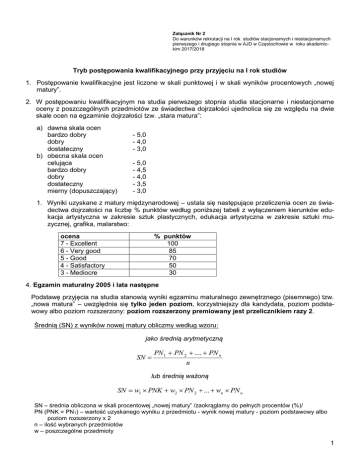Załącznik Nr 2 Do warunków rekrutacji na I rok studiów stacjonarnych i niestacjonarnych pierwszego i drugiego stopnia w AJD w Częstochowie w roku akademickim 2017/2018 Tryb postępowania kwalifikacyjnego przy przyjęciu na I rok studiów 1. Postępowanie kwalifikacyjne jest liczone w skali punktowej i w skali wyników procentowych „nowej matury”. 2. W postępowaniu kwalifikacyjnym na studia pierwszego stopnia studia stacjonarne i niestacjonarne oceny z poszczególnych przedmiotów ze świadectwa dojrzałości ujednolica się ze względu na dwie skale ocen na egzaminie dojrzałości tzw. „stara matura”: a) dawna skala ocen bardzo dobry dobry dostateczny b) obecna skala ocen celująca bardzo dobry dobry dostateczny mierny (dopuszczający) - 5,0 - 4,0 - 3,0 - 5,0 - 4,5 - 4,0 - 3,5 - 3,0 1. Wyniki uzyskane z matury międzynarodowej – ustala się następujące przeliczenia ocen ze świadectwa dojrzałości na liczbę % punktów według poniższej tabeli z wyłączeniem kierunków edukacja artystyczna w zakresie sztuk plastycznych, edukacja artystyczna w zakresie sztuki muzycznej, grafika, malarstwo: ocena 7 - Excellent 6 - Very good 5 - Good 4 - Satisfactory 3 - Mediocre % punktów 100 85 70 50 30 4. Egzamin maturalny 2005 i lata następne Podstawę przyjęcia na studia stanowią wyniki egzaminu maturalnego zewnętrznego (pisemnego) tzw. „nowa matura” – uwzględnia się tylko jeden poziom, korzystniejszy dla kandydata, poziom podstawowy albo poziom rozszerzony: poziom rozszerzony premiowany jest przelicznikiem razy 2. Średnią (SN) z wyników nowej matury obliczmy według wzoru: jako średnią arytmetyczną SN PN 1 PN 2 .... PN n n lub średnią ważoną SN w1 PNK w2 PN 2 ... wn PN n SN – średnia obliczona w skali procentowej „nowej matury” /zaokrąglamy do pełnych procentów (%)/ PN (PNK = PN1) – wartość uzyskanego wyniku z przedmiotu - wynik nowej matury - poziom podstawowy albo poziom rozszerzony x 2 n – ilość wybranych przedmiotów w – poszczególne przedmioty 1 5. Egzamin dojrzałości „stara matura” Średnią (SS) obliczamy z punktów otrzymanych z ujednolicenia skali ocen z wybranych przedmiotów ze świadectwa dojrzałości zgodnie z punktem 2 a i b i według niżej podanego wzoru: jako średnią arytmetyczną SS PS 1 PS 2 ... PS n n lub średnią ważoną SS w1 PSK w2 PS 2 ... wn PS n SS - średnia obliczona w skali punktowej „starej matury” PS - wartość punktowa wybranego przedmiotu (PSK = PS1), n – ilość wybranych przedmiotów w – poszczególne przedmioty 1. Na kierunku: biotechnologia, chemia, fizyka, inżynieria bezpieczeństwa studia drugiego stopnia (studia stacjonarne i niestacjonarne) o przyjęciu decyduje średnia ocen (w zaokrągleniu do 0,5) ze studiów pierwszego stopnia. Średnią ocen przelicza się na punkty według poniższej tabeli Ocena bardzo dobry dobry plus dobry dostateczny plus dostateczny Punkty 5,0 4,5 4,0 3,5 3,0 2. Ocenę końcową z dyplomu ukończenia studiów pierwszego stopnia przelicza się na punkty. 3. Kandydaci, którzy otrzymali z egzaminu praktycznego ocenę niedostateczną bądź negatywną, nie mogą być dopuszczeni do dalszego postępowania kwalifikacyjnego w ramach kierunku. 4. Kandydat, który na egzaminie maturalnym nie zdawał przedmiotu wymaganego w kryteriach kwalifikacji uzyskuje zero punktów za ten przedmiot. 9. Na kierunek filologia, specjalność filologia germańska na studia niestacjonarne w przypadku wyczerpania limitu w pierwszej kolejności będą przyjmowane osoby z oceną z języka niemieckiego na świadectwie dojrzałości. 10. W postępowaniu kwalifikacyjnym na studia pierwszego stopnia na kierunku: filologia specjalność: filologia angielska maksymalną liczbę punktów możliwych do zdobycia w postępowaniu kwalifikacyjnym uzyskują posiadacze dyplomów językowych Certificate in Advanced English (CAE), Certificate of Proficiency in English (CPE). 11. W postępowaniu kwalifikacyjnym na studia pierwszego stopnia na kierunku: filologia specjalność: filologia germańska maksymalną liczbę punktów możliwych do zdobycia w postępowaniu kwalifikacyjnym uzyskują posiadacze dyplomów językowych Zentrale Mittelstufenprüfung (ZMP), Zentrale Oberstufenprüfung (ZOP), Kleines Deutsches, Sprachdiplom (KDS), Großes Deutsches Sprachdiplom (GDS). 12. W przypadku braku oceny z języka na świadectwie ukończenia szkoły średniej lub dojrzałości – dotyczy tzw. „starej matury” na kierunek filologia odbędzie się rozmowa kwalifikacyjna: na specjalność: filologia angielska – z języka angielskiego na specjalność filologia germańska – z język niemieckiego. 2 13. Zgodnie z Kryteriami kwalifikacji określonymi w „Załączniku Nr 1 Do warunków rekrutacji na I rok studiów stacjonarnych i niestacjonarnych pierwszego i drugiego stopnia AJD w Częstochowie w roku akademickim 2017/2018”, kandydaci na studia drugiego stopnia, którzy w wyniku ukończenia studiów I stopnia nie uzyskali efektów kształcenia wymaganych od kandydatów na dany kierunek studiów drugiego stopnia, mogą być przyjęci na studia stacjonarne i niestacjonarne drugiego stopnia, pod warunkiem deklaracji uzupełnienia brakujących efektów z zakresu wiedzy, umiejętności i kompetencji społecznych poprzez zaliczenie w formie programu wyrównawczego płatnych zajęć dydaktycznych. 14. Na kierunku wychowania fizyczne studia drugiego stopnia (studia stacjonarne i niestacjonarne: Kandydaci posiadający tytuł trenera dyscypliny sportowej, aktualną mistrzowską, lub I klasę sportową, poświadczoną przez odpowiedni polski związek sportowy, otrzymują dodatkowo 10 pkt. Kandydaci posiadający uprawnienia instruktora dyscypliny sportu, ratownika WOPR, GOPR lub TOPR, tytuł menedżera sportu, aktualną II klasę sportową, poświadczoną przez odpowiedni polski związek sportowy, otrzymują dodatkowo 5 pkt. W punktacji za posiadane uprawnienia w zakresie kultury fizycznej można uzyskać maks
