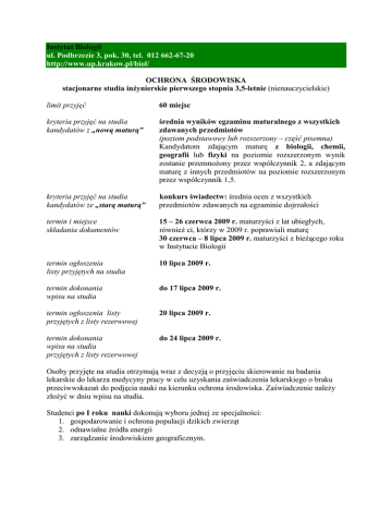 Instytut Biologii ul. Podbrzezie 3, pok. 30, tel. 012 662-67-20 http://www.up.krakow.pl/biol/ OCHRONA ŚRODOWISKA stacjonarne studia inŜynierskie pierwszego stopnia 3,5-letnie (nienauczycielskie) limit przyjęć 60 miejsc kryteria przyjęć na studia kandydatów z „nową maturą” średnia wyników egzaminu maturalnego z wszystkich zdawanych przedmiotów (poziom podstawowy lub rozszerzony – część pisemna) Kandydatom zdającym maturę z biologii, chemii, geografii lub fizyki na poziomie rozszerzonym wynik zostanie przemnoŜony przez współczynnik 2, a zdającym maturę z innych przedmiotów na poziomie rozszerzonym przez współczynnik 1,5. kryteria przyjęć na studia kandydatów ze „starą maturą” konkurs świadectw: średnia ocen z wszystkich przedmiotów zdawanych na egzaminie dojrzałości termin i miejsce składania dokumentów 15 – 26 czerwca 2009 r. maturzyści z lat ubiegłych, równieŜ ci, którzy w 2009 r. poprawiali maturę 30 czerwca – 8 lipca 2009 r. maturzyści z bieŜącego roku w Instytucie Biologii termin ogłoszenia listy przyjętych na studia 10 lipca 2009 r. termin dokonania wpisu na studia do 17 lipca 2009 r. termin ogłoszenia listy przyjętych z listy rezerwowej 20 lipca 2009 r. termin dokonania wpisu na studia przyjętych z listy rezerwowej do 24 lipca 2009 r. Osoby przyjęte na studia otrzymają wraz z decyzją o przyjęciu skierowanie na badania lekarskie do lekarza medycyny pracy w celu uzyskania zaświadczenia lekarskiego o braku przeciwwskazań do podjęcia nauki na kierunku ochrona środowiska. Zaświadczenie naleŜy złoŜyć w dniu wpisu na studia. Studenci po I roku nauki dokonują wyboru jednej ze specjalności: 1. gospodarowanie i ochrona populacji dzikich zwierząt 2. odnawialne źródła energii 3. zarządzanie środowiskiem geograficznym. Instytut Biologii ul. Podbrzezie 3, pok. 30, tel. 012 662-67-20 http://www.up.krakow.pl/biol/ OCHRONA ŚRODOWISKA niestacjonarne studia inŜynierskie pierwszego stopnia 3,5-letnie (nienauczycielskie) limit przyjęć 75 miejsc kryteria przyjęć na studia kandydatów z „nową maturą” średnia wyników egzaminu maturalnego z wszystkich zdawanych przedmiotów (poziom podstawowy lub rozszerzony – część pisemna) Kandydatom zdającym maturę z biologii, chemii, geografii lub fizyki na poziomie rozszerzonym wynik zostanie przemnoŜony przez współczynnik 2, a zdającym maturę z innych przedmiotów na poziomie rozszerzonym przez współczynnik 1,5. kryteria przyjęć na studia kandydatów ze „starą maturą” konkurs świadectw: średnia ocen z wszystkich przedmiotów zdawanych na egzaminie dojrzałości termin i miejsce składania dokumentów I termin: 30 czerwca – 8 lipca 2009 r. w Instytucie Biologii II termin pod warunkiem nie wypełnienia limitu: 1 – 18 września 2009 r. termin ogłoszenia listy przyjętych na studia I termin: 10 lipca 2009 r. II termin: 22 września 2009 r. termin i miejsce dokonania wpisu na studia I termin: do 17 lipca 2009 r. II termin: do 30 września 2009 r. termin ogłoszenia listy przyjętych z listy rezerwowej I termin: 20 lipca 2009 r. II termin: 2 października 2009 r. termin dokonania wpisu na studia przyjętych z listy rezerwowej wg ustaleń Instytutu kwota opłaty z rok nauki 4900 zł Osoby przyjęte na studia otrzymają wraz z decyzją o przyjęciu skierowanie na badania lekarskie do lekarza medycyny pracy w celu uzyskania zaświadczenia lekarskiego o braku przeciwwskazań do podjęcia nauki na kierunku ochrona środowiska. Zaświadczenie naleŜy złoŜyć w dniu wpisu na studia. Studenci po I roku nauki dokonują wyboru jednej ze specjalności: 1. gospodarowanie i ochrona populacji dzikich zwierząt 2. odnawialne źródła energii 3. zarządzanie środowiskiem geograficznym.