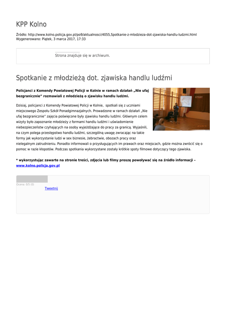 KPP Kolno Źródło: http://www.kolno.policja.gov.pl/po9/aktualnosci/4055,Spotkanie-z-mlodzieza-dot-zjawiska-handlu-ludzmi.html Wygenerowano: Piątek, 3 marca 2017, 17:33 Strona znajduje się w archiwum. Spotkanie z młodzieżą dot. zjawiska handlu ludźmi Policjanci z Komendy Powiatowej Policji w Kolnie w ramach działań „Nie ufaj bezgranicznie” rozmawiali z młodzieżą o zjawisku handlu ludźmi. Dzisiaj, policjanci z Komendy Powiatowej Policji w Kolnie, spotkali się z uczniami miejscowego Zespołu Szkół Ponadgimnazjalnych. Prowadzone w ramach działań „Nie ufaj bezgranicznie” zajęcia poświęcone były zjawisku handlu ludźmi. Głównym celem wizyty było zapoznanie młodzieży z formami handlu ludźmi i uświadomienie niebezpieczeństw czyhających na osoby wyjeżdżające do pracy za granicą. Wyjaśnili, na czym polega przestępstwo handlu ludźmi, szczególną uwagę zwracając na takie formy jak wykorzystanie ludzi w sex biznesie, żebractwie, obozach pracy oraz nielegalnym zatrudnieniu. Ponadto informowali o przysługujących im prawach oraz miejscach, gdzie można zwrócić się o pomoc w razie kłopotów. Podczas spotkania wykorzystane zostały krótkie spoty filmowe dotyczący tego zjawiska. * wykorzystując zawarte na stronie treści, zdjęcia lub filmy proszę powoływać się na źródło informacji – www.kolno.policja.gov.pl Ocena: 0/5 (0) Tweetnij