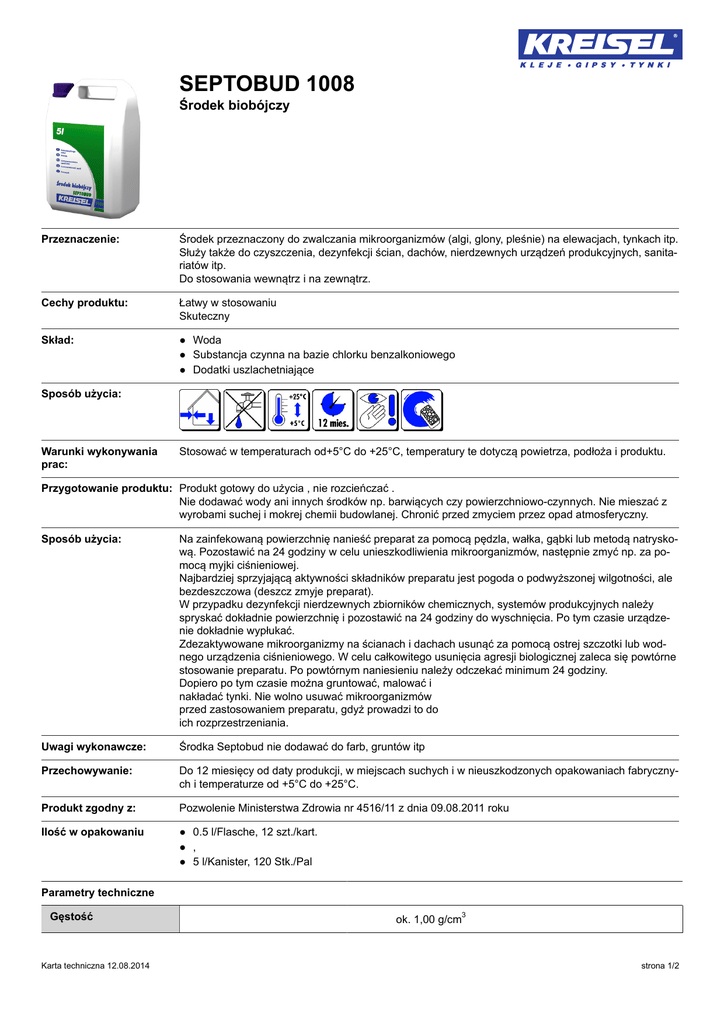 SEPTOBUD 1008 Środek biobójczy Przeznaczenie: Środek przeznaczony do zwalczania mikroorganizmów (algi, glony, pleśnie) na elewacjach, tynkach itp. Służy także do czyszczenia, dezynfekcji ścian, dachów, nierdzewnych urządzeń produkcyjnych, sanitariatów itp. Do stosowania wewnątrz i na zewnątrz. Cechy produktu: Łatwy w stosowaniu Skuteczny Skład: ● Woda ● Substancja czynna na bazie chlorku benzalkoniowego ● Dodatki uszlachetniające Sposób użycia: Warunki wykonywania prac: Stosować w temperaturach od+5°C do +25°C, temperatury te dotyczą powietrza, podłoża i produktu. Przygotowanie produktu: Produkt gotowy do użycia , nie rozcieńczać . Nie dodawać wody ani innych środków np. barwiących czy powierzchniowo-czynnych. Nie mieszać z wyrobami suchej i mokrej chemii budowlanej. Chronić przed zmyciem przez opad atmosferyczny. Sposób użycia: Na zainfekowaną powierzchnię nanieść preparat za pomocą pędzla, wałka, gąbki lub metodą natryskową. Pozostawić na 24 godziny w celu unieszkodliwienia mikroorganizmów, następnie zmyć np. za pomocą myjki ciśnieniowej. Najbardziej sprzyjającą aktywności składników preparatu jest pogoda o podwyższonej wilgotności, ale bezdeszczowa (deszcz zmyje preparat). W przypadku dezynfekcji nierdzewnych zbiorników chemicznych, systemów produkcyjnych należy spryskać dokładnie powierzchnię i pozostawić na 24 godziny do wyschnięcia. Po tym czasie urządzenie dokładnie wypłukać. Zdezaktywowane mikroorganizmy na ścianach i dachach usunąć za pomocą ostrej szczotki lub wodnego urządzenia ciśnieniowego. W celu całkowitego usunięcia agresji biologicznej zaleca się powtórne stosowanie preparatu. Po powtórnym naniesieniu należy odczekać minimum 24 godziny. Dopiero po tym czasie można gruntować, malować i nakładać tynki. Nie wolno usuwać mikroorganizmów przed zastosowaniem preparatu, gdyż prowadzi to do ich rozprzestrzeniania. Uwagi wykonawcze: Środka Septobud nie dodawać do farb, gruntów itp Przechowywanie: Do 12 miesięcy od daty produkcji, w miejscach suchych i w nieuszkodzonych opakowaniach fabrycznych i temperaturze od +5°C do +25°C. Produkt zgodny z: Pozwolenie Ministerstwa Zdrowia nr 4516/11 z dnia 09.08.2011 roku Ilość w opakowaniu ● 0.5 l/Flasche, 12 szt./kart. ● , ● 5 l/Kanister, 120 Stk./Pal Parametry techniczne Gęstość Karta techniczna 12.08.2014 3 ok. 1,00 g/cm strona 1/2 SEPTOBUD 1008 Środek biobójczy Parametry techniczne pH 3,5 Temperatura krzepnięcia 0°C Unieszkodliwienie mikroorganizmów po nałożeniu na podłoże: Zużycie Wskazówki ogólne: Karta techniczna 12.08.2014 po ok. 24h od 0,15 do 0,25 l/m² Preparat do zwalczania grzybów pleśniowych jest szkodliwy dla zdrowia. Używając go należy chronić oczy i skórę. Nie dopuścić, aby produkt znalazł się w zasięgu dzieci. Przestrzegać wskazówek bezpieczeństwa zawartych na opakowaniu i karcie charakterystyki preparatu. strona 2/2
