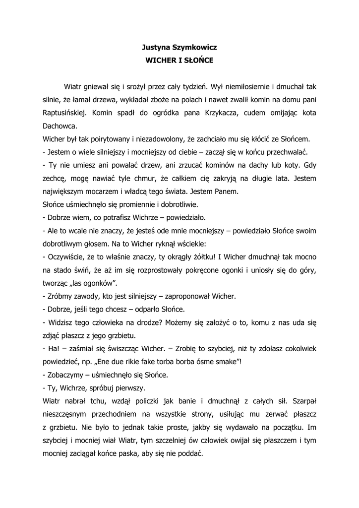 Justyna Szymkowicz WICHER I SŁOŃCE Wiatr gniewał się i srożył przez cały tydzień. Wył niemiłosiernie i dmuchał tak silnie, że łamał drzewa, wykładał zboże na polach i nawet zwalił komin na domu pani Raptusińskiej. Komin spadł do ogródka pana Krzykacza, cudem omijając kota Dachowca. Wicher był tak poirytowany i niezadowolony, że zachciało mu się kłócić ze Słońcem. - Jestem o wiele silniejszy i mocniejszy od ciebie – zaczął się w końcu przechwalać. - Ty nie umiesz ani powalać drzew, ani zrzucać kominów na dachy lub koty. Gdy zechcę, mogę nawiać tyle chmur, że całkiem cię zakryją na długie lata. Jestem największym mocarzem i władcą tego świata. Jestem Panem. Słońce uśmiechnęło się promiennie i dobrotliwie. - Dobrze wiem, co potrafisz Wichrze – powiedziało. - Ale to wcale nie znaczy, że jesteś ode mnie mocniejszy – powiedziało Słońce swoim dobrotliwym głosem. Na to Wicher ryknął wściekle: - Oczywiście, że to właśnie znaczy, ty okrągły żółtku! I Wicher dmuchnął tak mocno na stado świń, że aż im się rozprostowały pokręcone ogonki i uniosły się do góry, tworząc „las ogonków”. - Zróbmy zawody, kto jest silniejszy – zaproponował Wicher. - Dobrze, jeśli tego chcesz – odparło Słońce. - Widzisz tego człowieka na drodze? Możemy się założyć o to, komu z nas uda się zdjąć płaszcz z jego grzbietu. - Ha! – zaśmiał się świszcząc Wicher. – Zrobię to szybciej, niż ty zdołasz cokolwiek powiedzieć, np. „Ene due rikie fake torba borba ósme smake”! - Zobaczymy – uśmiechnęło się Słońce. - Ty, Wichrze, spróbuj pierwszy. Wiatr nabrał tchu, wzdął policzki jak banie i dmuchnął z całych sił. Szarpał nieszczęsnym przechodniem na wszystkie strony, usiłując mu zerwać płaszcz z grzbietu. Nie było to jednak takie proste, jakby się wydawało na początku. Im szybciej i mocniej wiał Wiatr, tym szczelniej ów człowiek owijał się płaszczem i tym mocniej zaciągał końce paska, aby się nie poddać. Tymczasem Wiatr szalał z wściekłości. Ryczał i wył z całej mocy, aż zupełnie posiniał na twarzy. W pewnej chwili prawie udało mu się zbić z nóg swoją ofiarę. Osłabł jednak i w końcu zabrakło mu sił tak, że musiał się poddać. - Twoja kolej – zrezygnowany Wiatr szepnął słabiutkim głosem do Słońca. A Słońce uśmiechnęło się od ucha do ucha i oblało przechodnia całym blaskiem swoich złocistych promieni. W niedługim czasie człowiek spocił się tak, że musiał przystanąć, ażeby otrzeć pot z czoła. - A teraz patrz – powiedziało Słońce, świecąc jeszcze mocniej. Człowiek uszedł może trzydzieści kroków i zaczął dyszeć z gorąca. Wkrótce potem przystanął i zdjął płaszcz. - Hurrra! – krzyknęło Słońce. – Udało mi się! Wiatr musiał przyznać z niesmakiem, że Słońcu się udało i został pokonany. - A niech to dunder świśnie! – zagwizdał ze złości Wiatr. – A jednak nie jestem najsilniejszy na świecie. Słońce mnie pokonało. Może też swoim sprytem?