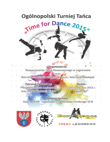 Stowarzyszenie Tańca Nowoczesnego w Legionowie oraz Born2Dance Studio Małgorzaty Szulc i Mariusza Mikołajek zapraszają na II Ogólnopolski Turniej Tańca „Time for Dance 2015” 10 stycznia 2015 (sobota) Disco Dance, Inne Formy Tańca, Performing Art Improvisation 11 stycznia 2015 (niedziela) Hip Hop, Hip Hop Battles Team Start w sobotę i niedzielę godz. 10.00 Hala „Arena” Legionowo ul. Bolesława Chrobrego 50 b Patronat Honorowy: Prezydent Miasta Legionowo Polska Federacja Tańca Cele turnieju: Konfrontacja dorobku artystycznego solistów duetów i zespołów amatorskiego ruchu tanecznego zrzeszonych w domach kultury oraz szkołach tańca, Popularyzacja tańca, jako aktywnej formy spędzania czasu wolnego i rozwoju fizycznego wśród dzieci i młodzieży. Integracja tancerzy i trenerów z całego kraju w duchu fair play w gościnnych progach przepięknego obiektu sportowego, jakim jest „ARENA Legionowo” Warunki uczestnictwa : 1. Przesłanie pisemnego zgłoszenia tylko w formie elektronicznej na adres: [email protected] oryginalnych kartach zgłoszenia (do pobrania na www.born2dance.pl) do dnia 21 grudnia 2014 r. 2. Wniesienie opłaty startowej w wysokości: solo 20 zł; duet 40 zł; mini formacja 140 zł; formacja 300 zł; Team HH 200 zł na rachunek bankowy Stowarzyszenia Tańca Nowoczesnego 05-120 Legionowo ul. Warszawska 60 bnr konta: 85 9511 0000 2001 0000 0547 0001 w treści przelewu należy wpisać, za co została dokonana opłata startowa np. Klub XYZ… opłata startowa 5XS, 7XD, 2XMF, 1XF, 1XT 3. Wpłat należy dokonać na konto w nieprzekraczalnym terminie do dnia 21 grudnia 2014 r. W przypadku braku wpłaty w podanym terminie organizator zastrzega sobie prawo do odmowy przyjęcia zgłoszenia. Nie ma możliwości wpłacania startowego na miejscu. Opłaty w dniu zawodów nie będą przyjmowane!!! 4. Przedstawiciel klubu jest zobowiązany do potwierdzenia uczestnictwa zawodników w dniu turnieju w godzinach trwania rejestracji tj. 8.00 – 9.30 Uwaga!!! W przypadku jakichkolwiek zmian na listach startowych prosimy o zgłaszanie poprawek mailem na bieżąco, co pozwoli uniknąć niepotrzebnego bałaganu i spokojnie przeprowadzić rejestrację w dniu zawodów. Jury: Turniej oceniany będzie przez 5 osobowe Jury złożone z sędziów Polskiej Federacji Tańca oraz osób niezrzeszonych z wieloletnim doświadczeniem, aktywnie działających w amatorskim i zawodowym ruchu tanecznym. Zawody oceniane będą w systemie „skating system”. Nagrody OTT „Time for Dance 2015”: W kategoriach solo i duety dyplomy dla finalistów, medale dla zdobywców miejsc I-III a także nagrody rzeczowe dla zwycięzców. W kategoriach mini formacje i formacje dyplomy dla finalistów, puchary dla zdobywców miejsc I-III oraz nagrody rzeczowe dla zwycięskich grup. Organizatorzy przewidują również NAGRODĘ GRAND PRIX dla najlepszej mini formacji lub formacji sobotniego i niedzielnego turnieju wybranej przez JURY oraz nagrodę finansową dla zwycięzcy Hip Hop Battles Team w wysokości do 40 % wpisowego grup, które startują w tej konkurencji i w tej kategorii. Formuła turnieju w dniu 10.01.2015r Uwaga!!! Kategorie solowe w konkurencjach DISCO DANCE zostaną rozegrane w specjalnym podziale wiekowym oraz trzech poziomach zaawansowania, aby umożliwić tancerzom możliwość rywalizacji w jak najbardziej sprawiedliwej formie. DISCO DANCE solo Czas prezentacji Sposób kwalifikacji Tancerze, dla których „Time for Dance 2015” POCZĄTKUJĄCY będzie pierwszym turniejem oraz te osoby, (czas prezentacji które startowały w najniższych klasach w 30-40 sek.) innych turniejach klasowych w 2014 r; Tancerze, którzy w 2014 roku startowali w ŚREDNIO Ogólnopolskich Turniejach Tanecznych nie ZAAWANSOWANI kwalifikując się do finałów lub uczestnicy KM (czas prezentacji IDO,którym nie udało się zakwalifikować 40 - 50 sek.) dalej niż do ćwierćfinału; ZAAWANSOWANI Finaliści Ogólnopolskich Turniejów (czas prezentacji Tanecznych, półfinaliści i finaliści KM IDO lub do 1 min.) innych turniejów rangi Mistrzowskiej; Rocznik Maluszki 2008 i młodsi Dzieci I 2006-2007 Dzieci II 2004-2005 Juniorzy I 2002-2003 Juniorzy II 2000-2001 Dorośli 1999 i starsi Uwagi końcowe do konkurencji solo disco dance: 1. Tancerze początkujący startują w kostiumach treningowych, bez makijażu, bez ozdób. Nie szyjemy strojów i nie używamy kostiumów tanecznych!!! Liczy się tylko taniec!!! 2. O wyborze poziomu zaawansowania danego zawodnika decyduje trener klubu na podstawie dotychczasowych wyników i wiedzy na temat swojego tancerza. Aby uniknąć dyskwalifikacji i wypaczania wyników prosimy o prawidłowe przyporządkowanie tancerzy do poziomu zaawansowania w danej kategorii a w szczególności grupy początkującej. 3. Każdy poziom zaawansowania rozegrany zostanie w sześciu podanych w tabeli kategoriach wiekowych. O przydziale do kategorii wiekowej decyduje rok urodzenia danego zawodnika. Kategorie taneczne: DISCO DANCE Duety Mini formacje (3-7 osób) Formacje (8-24 osób) INNE FORMY TAŃCA* Mini formacje (3-7 osób) Formacje (8-24 osób) PERFORMING ART IMPROVISATION* Solo (nie ma podziału na poziom zaawansowania) Czas prezentacji : Duety 1 min. (muzyka organizatora) Mini Formacje: - Dzieci – 1 min. 30 sek. - Juniorzy – 2 min. - Dorośli – 2 min. (muzyka organizatora) Formacje 2 min. 30 sek. - 3 min. (muzyka własna) Mini Formacje 2 min. 30 sek. – 3 min. (muzyka własna) Formacje 2 min.30 sek. - 4 min. (muzyka własna) Eliminacje – 1 min. (muzyka organizatora wybrana losowo) Finał– 1min. ( muzyka organizatora wybrana losowo ) Kategorie wiekowe: DZIECI - 2003 i młodsi JUNIORZY - 2002-1999 DOROŚLI - 1998 i starsi Biorąc pod uwagę, że „Time for Dance 2015” jest pierwszym turniejem w 2015 roku w kategorii duety, mini formacje i formacje obowiązuje podział na roczniki, które obowiązywały w 2014 roku DZIECI - 2004 i młodsi JUNIORZY - 2003-2000 DOROŚLI - 1999 i starsi *