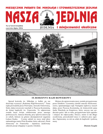 MIESIĘCZNIK PARAFII ŚW. MIKOŁAJA I STOWARZYSZENIA JEDLNIA NASZA JEDLNIA Nr 6-7(113/114)2016 czerwiec-lipiec 2016 i miejscowości okoliczne IX Rodzinny Rajd Rowerowy Sprzed kościoła św. Mikołaja w Jedlni, po raz dziewiąty wyruszył „Rodzinny Rajd Rowerowy”. Trasa rajdu prowadziła przez Poświętne, Jaroszki-Ostrownicę, Stoki, dalej rowerzyści wjechali w Puszczę Kozienicką, do leśnej kapliczki św. Franciszka. Tu odprawiona została msza święta celebrowana przez naszego proboszcza ks. Janusza Smerdę, przy śpiewie dziewcząt ze scholi, którym na gitarze akompaniował organista Łukasz Kęska. Czynny udział we mszy miał aktor radomskiego teatru Piotr Kondrat, który odczytał „Pieśń słoneczną” św. Franciszka - najstarszy zachowany zabytek poezji religijnej w języku włoskim. Miejsce do sprawowania mszy zostało przygotowane przez leśników. Uczestnicy dostali znaczki okolicznościowe, upamiętniające rajd. Następnie rajdowcy ruszyli dalej, przez Puszczę Kozienicką, do leśniczówki pana Jacka Warchoła na Karpówce, który zawsze nas serdecznie gości. Jak co roku, przygotowane było ognisko i miejsce do odpoczynku. Deszcz, mimo iż tak długo oczekiwany, przeszkodził nieco w zabawie przy ognisku. Zapraszamy za rok na szlak do kapliczki i polową mszę. NASZA JEDLNIA Danuta Szegda 1 2 NASZA JEDLNIA Literat i dziennikarz W dniu 02.06.2016 r. w Lublinie podczas otwarcia Międzynarodowej Sesji Historyczno-Literackiej „Nasi Sąsiedzi” organizowanej przy współudziale Oddziału Lubelskiego Stowarzyszenia Pisarzy Polskich, Konsul Generalny Ukrainy Wasyl Pawluk i Konsul Witalij Biłyj wręczyli pisarzowi i tłumaczowi Wojciechowi Pestce odznaczenia: „Za Wierność Przesłaniu Poety” Ukraińskiej Fundacji Kultury oraz krzyż „Za Męstwo i Honor” Stowarzyszenia Weteranów Afganistanu. Z prawej Konsul Generalny Ukrainy Wasyl Pawluk, z lewej kansul Witalij Biłyj Wojciech Pestka jest znany w Ukrainie, jako poeta i autor reportaży – powiedział Konsul Generalny Ukrainy Wasyl Pawluk cytując uzasadnienie nadania tych odznaczeń – „Za książkę Do zobaczenia w piekle ((До побачення в пеклі), która została przełożona na język ukraiński, został odznaczony Międzynarodową NagroZ gośćmi z Ukrainy Vitą Grytsiuk i Oleksandrem Zajczukiem Od lewej Zbigniew Fronczek, Iwona Matusiak, Wojciech Pestka dą Literacką im. Mikołaja Gogola – to tylko jeden z przykładów współpracy na polu kultury. […] Tłumaczenia i osiągnięcia twórcze Wojciecha Pestki nie pozostały niezauważone w Ukrainie, o czym świadczy odznaczenie Ukraińskiej Fundacji Kultury – medal ustanowiony w 200. rocznicę śmierci Tarasa Szewczenki „Za Wierność Przesłaniu Poety”. „Ale Wojciech Pestka jest nie tylko literatem i tłumaczem – mówił Konsul - Jest też dziennikarzem, autorem znakomitych reportaży. Chcąc zachować obiektywizm kilkakrotnie odwiedzał nasz kraj, zbierając informacje dla polskiej prasy w czasie, kiedy Federacja Rosyjska rozpoczęła agresję przeciw Ukrainie. Nie poprzestając na spotkaniach z uczestnikami ATO (Operacji Antyterrorystycznej), zdecydował się na bezpośredni pobyt w strefie walk, wykazując się wysokim poziomem profesjonalizmu i odwagą. Za to został odznaczony medalem, o który wnioskowała Wołyńska Obwodowa Organizacja Ukraińskiego Stowarzyszenia Weteranów Afganistanu – krzyżem „Za Męstwo i Honor”. […]Jeśli nie wszyscy Ukraińcy, to przynajmniej duża ich część chciałaby w ten sposób okazać wdzięczność za stanowisko, jakie zajęła Polska, wspierając Ukrainę w jej konflikcie z Rosją”. NASZA JEDLNIA przygotował Przewodniczący Lubelskiego Oddziału Stowarzyszenia Pisarzy Polskich Zbigniew Fronczek 3 U STÓP MARYI 22 maja b.r. grupa dzieci, która przyjęła I Komunię Świętą wraz z ks. Marcinem Pietrasem, rodzicami i opiekunami wczesnym rankiem wyruszyła na pielgrzymkę autokarową do Częstochowy. Dzieci pragnęły podziękować Bogu za dar I Komunii Świętej i prosić Maryję o Jej opiekę. Na Jasnej Górze, w Kaplicy Cudownego Obrazu o godz. 14: 30 wszyscy uczestniczyli we Mszy świętej którą celebrował ks. Marcin, który powierzył nasze dzieci opiece Królowej Polski. Cieszymy się, że nasze dzieci miały okazję być u Tronu Jasnogórskiej Królowej Polski i przed samym cudownym obrazem Matki Bożej uczestniczyć w sprawowanej w ich intencji Mszy Świętej. Mamy nadzieję, że zapamiętają ten dzień, a ich przyjaźń z Jezusem Eucharystycznym będzie trwać przez całe życie. W trakcie pobytu na Jasnej Górze mieliśmy okazję do zwiedzania licznych zabytków i skarbów zgromadzonych w murach klasztoru. Pełni duchowej radości i ciepła w sercach pielgrzymi szczęśliwie wróciliśmy do domu. Słowa podziękowania kierujemy dla ks. Marcina Pietrasa za przygotowanie pielgrzymki, i inspirujące przewodniczenie modlitwie. Ten niezwykły dzień na długo pozostanie w naszej pamięci. Aneta Wojdat AMEN Pod tym hasłem odbyło się tegoroczne Spotkanie Młodych nad Jeziorem Lednickim, czwartego czerwca 2016 r. W czasie modlitewnego czuwania świętowaliśmy 3 bardzo ważne wydarzenia: 1050 rocznicę chrztu Polski, 800-lecie dominikanów, XX Spotkanie nad Lednicą. Była to również pierwsza Lednica bez o. Jana Góry, inicjatora tych spotkań. W tym roku nad jeziorem Lednickim zgromadziło się ok. 80 tys. osób. Wśród nich, uczestniczyli nasi młodzi parafianie. W czasie spotkania, konferencję wygłosił dominikanin, ojciec Adam Szustak. O. Adam zadał zadanie 4 obecnym na Lednicy, by zapytali Jezusa, co mają robić w swoim życiu. Jeśli Jezus powie dokładnie „to i to masz robić”, my mamy się zgodzić i powiedzieć: „Amen - niech tak się stanie”. Kluczowym momentem była Eucharystia, podczas której słowo Boże wygłosił ks. bp Edward Dajczak. W swojej homilii zachęcał młodych słowami Sługi Bożego Wilhelma Pluty: „Bierz Pismo