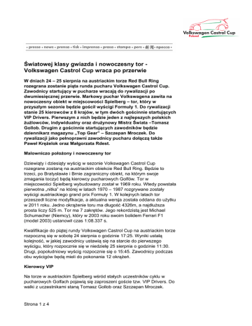 Światowej klasy gwiazda i nowoczesny tor Volkswagen Castrol Cup wraca po przerwie W dniach 24 – 25 sierpnia na austriackim torze Red Bull Ring rozegrana zostanie piąta runda pucharu Volkswagen Castrol Cup. Zawodnicy startujący w pucharze wracają do rywalizacji po dwumiesięcznej przerwie. Markowy puchar Volkswagena zawita na nowoczesny obiekt w miejscowości Spielberg – tor, który w przyszłym sezonie będzie gościł wyścigi Formuły 1. Do rywalizacji stanie 25 kierowców z 8 krajów, w tym dwóch gościnnie startujących VIP Drivers. Pierwszym z nich będzie jeden z najlepszych polskich żużlowców, indywidualny oraz drużynowy Mistrz Świata –Tomasz Gollob. Drugim z gościnnie startujących zawodników będzie dziennikarz magazynu „Top Gear” – Szczepan Mroczek. Do rywalizacji jako pełnoprawni zawodnicy pucharu dołączą także Paweł Krężelok oraz Małgorzata Rdest. Malowniczo położony i nowoczesny tor Dziewiąty i dziesiąty wyścig w sezonie Volkswagen Castrol Cup rozegrane zostaną na austriackim obiekcie Red Bull Ring. Będzie to trzeci, po Bratysławie i Brnie zagraniczny obiekt, na którym swoje zmagania toczyć będą kierowcy pucharowych Golfów. Tor w miejscowości Spielberg wybudowany został w 1969 roku. Wtedy powstała pierwotna „nitka” na której w latach 1970 – 1987 rozgrywane zostały wyścigi austriackiego grand prix Formuły 1. W kolejnych latach tor przeszedł liczne modyfikacje, a aktualna wersja została oddana do użytku w 2011 roku. Jedno okrążenie toru ma długość 4326m, a najdłuższa prosta liczy 525 m. Tor ma 7 zakrętów. Jego rekordzistą jest Michael Schumacher (Niemcy), który w 2003 roku swoim bolidem Ferrari F1 (model 2003) ustanowił czas 1:08.337 s. Kwalifikacje do piątej rundy Volkswagen Castrol Cup na austriackim torze rozpoczną się w sobotę 24 sierpnia o godzinie 17:25. Wyniki ustalą kolejność, w jakiej zawodnicy ustawią się na starcie do pierwszego wyścigu, który rozpocznie się w niedzielę 25 sierpnia o godzinie 11:30. Drugi, popołudniowy wyścig rozpocznie się o 15:45. Zawodnicy podczas obu wyścigów będą mieli do pokonania 12 okrążeń. Kierowcy VIP Na torze w austriackim Spielberg wśród stałych uczestników cyklu w pucharowych Golfach pojawią się zaproszeni goście tzw. VIP Drivers. Do walki z uczestnikami staną Tomasz Gollob oraz Szczepan Mroczek. Strona 1 z 4 Pierwszy z nich to najbardziej utytułowany polski żużlowiec. Pochodzący z Bydgoszczy, aktualny zawodnik Unibaxu Toruń, zwany profesorem speedwaya posiada w swoim dorobku tytuły Indywidualnego Mistrza Świata (2010), Drużynowego Mistrza Świata (1996, 2005, 2007, 20092011), a także Indywidualnego Mistrza Polski (8 tytułów). Jako jeden z najbardziej znanych i utytułowanych żużlowców na świecie ma także w swoim dorobku rekordy torów na wielu europejskich arenach żużlowych. Jego pasją jest także motocross, w którym startuje w wolnych chwilach. Drugim zawodnikiem startującym gościnnie będzie Szczepan Mroczek, dziennikarz redakcji magazynu „Top Gear”. Push – to – Pass Podczas zawodów na Red Bull Ring zawodnicy będą mogli zwiększyć moc wyścigowego Golfa o dodatkowe 50 KM (do 310 KM) 19 razy podczas jednego wyścigu. System ten nie raz decydował o przebiegu rywalizacji i końcowej klasyfikacji na mecie poprzednich rund. Za każdym razem zwiększy on moc auta na 10 sekund, z tym że po raz kolejny będzie można wykorzystać system dopiero po 10 sekundach. Nowi zawodnicy w stawce Liderem cyklu po 4 rundach z dorobkiem 266 punktów jest kierowca z Wieliczki Mateusz Lisowski. Wyprzedza on w klasyfikacji generalnej o 10 punktów szczecinianina Jakuba Litwina. Na trzecim miejscu z 251 punktami, znajduje się najlepszy z obcokrajowców Szwed Rasmus Marthen. Do czołowej trójki na pewno będzie chciał powrócić Jan Kisiel, który po pechowych zawodach na torze w Poznaniu spadł z pozycji lidera na czwarte miejsce klasyfikacji generalnej. Runda na Red Bull Ring będzie także miejscem debiutu dwóch nowych zawodników. Do stawki uczestników Volkswagen Castrol Cup dołączy najmłodszy zawodnik cyklu – Paweł Krężelok, który przekroczył już wiek uprawniający do startu. Ten młody i ambitny zawodnik swoją formę szlifował podczas startów w innych seriach wyścigowych, a także zawodach kartingowych gdzie w tym roku zdobył tytuł halowego wicemistrza świata. Stawkę zawodników uzupełni też kolejna kobieta w cyklu – Małgorzata Rdest. Ta młoda zawodniczka z Żyrardowa ma za sobą starty w serii Formula BMW Talent Trophy, a także wyścigach Formuły 4 w Wielkiej Brytanii. Wypowiedzi przed rundą w Austrii Krystian Korzeniowski, 5. miejsce w klasyfikacji generalnej – Red Bull Ring jak każdy tor w pucharze VWCC jest dla mnie nowy. Podczas treningu będę musiał poświęcić sporo uwagi na analizę oraz dostosowanie swojej jazdy pod ten tor, tak by w wyścigu zaatakować jak najskuteczniej. Różnica punktowa między mną a pierwszym zawodnikiem wynosi zaledwie 34 punkty, a poprzednie rundy pokazały jak szybko wszystko potrafi się zmienić w klasyfikacji generalnej, więc walka o tytuł wciąż trwa, a ja na pewno nie pozostanę bierny w tej walce. Jednocześnie cały czas muszę walczyć o sponsorów, których zachęcam do współpracy. Strona 2 z 4 Sebastian Ramirez, 11. miejsce w klasyfikacji generalnej – Ostatnia runda nie ułożyła się po mojej myśli. Obrałem złą strategię na kwalifikacje, co spowodowało, że oba wyścigi nie skończyły się dla mnie najlepiej, mimo że czasy pokazywały, że mogłem zając miejsce w pierwszej ósemce. Tor Red Bull Ring to niesamowita arena, na której jak najdłużej trzeba utrzymywać maksymalną możliwą prędkość. Bardzo ciekawa jest także różnica wzniesień na torze, co sprawia, że jazda po nim sprawi mi dużo frajdy. Mam nadzieję, że przełamię podczas tej rundy złą passę! Aleksandra Bursiak, 23. miejsce w klasyfika