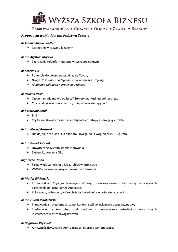 Propozycja wykładów dla Państwa Szkoły: dr Joanna Kurowska-Pysz Marketing w rozwoju lokalnym dr inż. Krystian Mączka Zagrożenia teleinformatyczne w życiu codziennym dr Marcin Lis Podejście do jakości na przykładzie Toyoty Droga do jakości młodego naukowca poprzez projekty Akademia Młodego Kierownika Projektu dr Paulina Polko Czego nam nie mówią politycy? Sekrety marketingu politycznego. Co chciałbyś wiedzieć o terroryzmie, a boisz się zapytać? dr Katarzyna Reclik Bikini Czy tylko człowiek może być inteligentny? – stopy z pamięcią kształtu dr inż. Maciej Rostański Nie daj się zjeść Sieci. Od ekonomii uwagi, do IT wagi ciężkiej – Big Data dr inż. Paweł Sobczak Nowoczesne systemy komis jonowania System kodowania GS1 mgr Jacek Uroda Firma w globalnej sieci. Jak zarabiać w Internecie WWW – wykreuj własny wizerunek w Internecie dr Maciej Witkowski Idź na całość! Czyli jak telewizja z dobrego człowieka może zrobić bestię i o korzyściach z patrzenia na usta Pameli Anderson. Kilka rzeczy o Romach, które chciałbyś wiedzieć ale boisz się zapytać? dr inż. Łukasz Wróblewski Planowanie strategiczne a rozwój kariery, czyli jak osiągnąć sukces zawodowy Średniowieczny komputer, czyli budowa i zastosowanie astrolabium oraz innych instrumentów astronawigacyjnych dr Bogusław Wyleciał Aktywność fizyczna źródłem zdrowia i dobrego samopoczucia