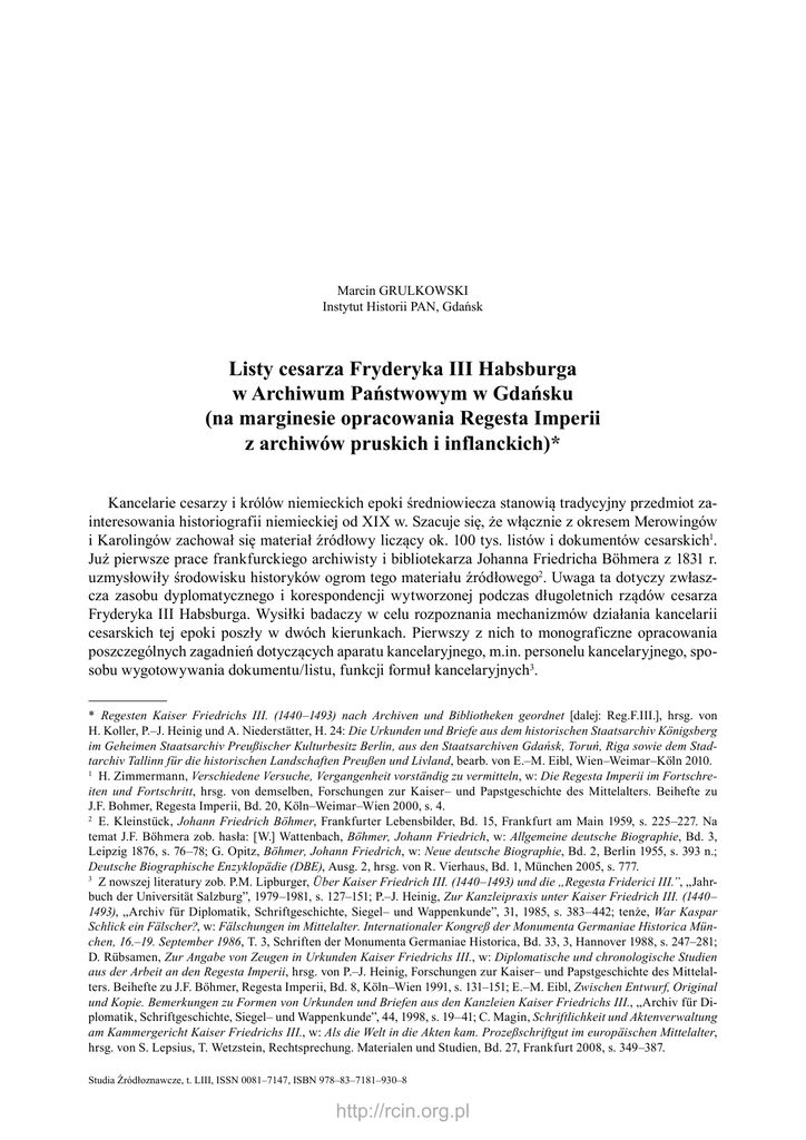 Marcin GRULKOWSKI Instytut Historii PAN, Gdańsk Listy cesarza Fryderyka III Habsburga w Archiwum Państwowym w Gdańsku (na marginesie opracowania Regesta Imperii z archiwów pruskich i inflanckich)* Kancelarie cesarzy i królów niemieckich epoki średniowiecza stanowią tradycyjny przedmiot zainteresowania historiografii niemieckiej od XIX w. Szacuje się, że włącznie z okresem Merowingów i Karolingów zachował się materiał źródłowy liczący ok. 100 tys. listów i dokumentów cesarskich1. Już pierwsze prace frankfurckiego archiwisty i bibliotekarza Johanna Friedricha Böhmera z 1831 r. uzmysłowiły środowisku historyków ogrom tego materiału źródłowego2. Uwaga ta dotyczy zwłaszcza zasobu dyplomatycznego i korespondencji wytworzonej podczas długoletnich rządów cesarza Fryderyka III Habsburga. Wysiłki badaczy w celu rozpoznania mechanizmów działania kancelarii cesarskich tej epoki poszły w dwóch kierunkach. Pierwszy z nich to monograficzne opracowania poszczególnych zagadnień dotyczących aparatu kancelaryjnego, m.in. personelu kancelaryjnego, sposobu wygotowywania dokumentu/listu, funkcji formuł kancelaryjnych3. * Regesten Kaiser Friedrichs III. (1440–1493) nach Archiven und Bibliotheken geordnet [dalej: Reg.F.III.], hrsg. von H. Koller, P.–J. Heinig und A. Niederstätter, H. 24: Die Urkunden und Briefe aus dem historischen Staatsarchiv Königsberg im Geheimen Staatsarchiv Preußischer Kulturbesitz Berlin, aus den Staatsarchiven Gdańsk, Toruń, Riga sowie dem Stadtarchiv Tallinn für die historischen Landschaften Preußen und Livland, bearb. von E.–M. Eibl, Wien–Weimar–Köln 2010. 1 H. Zimmermann, Verschiedene Versuche, Vergangenheit vorständig zu vermitteln, w: Die Regesta Imperii im Fortschreiten und Fortschritt, hrsg. von demselben, Forschungen zur Kaiser– und Papstgeschichte des Mittelalters. Beihefte zu J.F. Bohmer, Regesta Imperii, Bd. 20, Köln–Weimar–Wien 2000, s. 4. 2 E. Kleinstück, Johann Friedrich Böhmer, Frankfurter Lebensbilder, Bd. 15, Frankfurt am Main 1959, s. 225–227. Na temat J.F. Böhmera zob. hasła: [W.] Wattenbach, Böhmer, Johann Friedrich, w: Allgemeine deutsche Biographie, Bd. 3, Leipzig 1876, s. 76–78; G. Opitz, Böhmer, Johann Friedrich, w: Neue deutsche Biographie, Bd. 2, Berlin 1955, s. 393 n.; Deutsche Biographische Enzyklopädie (DBE), Ausg. 2, hrsg. von R. Vierhaus, Bd. 1, München 2005, s. 777. 3 Z nowszej literatury zob. P.M. Lipburger, Über Kaiser Friedrich III. (1440–1493) und die „Regesta Friderici III.”, „Jahrbuch der Universität Salzburg”, 1979–1981, s. 127–151; P.–J. Heinig, Zur Kanzleipraxis unter Kaiser Friedrich III. (1440– 1493), „Archiv für Diplomatik, Schriftgeschichte, Siegel– und Wappenkunde”, 31, 1985, s. 383–442; tenże, War Kaspar Schlick ein Fälscher?, w: Fälschungen im Mittelalter. Internationaler Kongreß der Monumenta Germaniae Historica München, 16.–19. September 1986, T. 3, Schriften der Monumenta Germaniae Historica, Bd. 33, 3, Hannover 1988, s. 247–281; D. Rübsamen, Zur Angabe von Zeugen in Urkunden Kaiser Friedrichs III., w: Diplomatische und chronologische Studien aus der Arbeit an den Regesta Imperii, hrsg. von P.–J. Heinig, Forschungen zur Kaiser– und Papstgeschichte des Mittelalters. Beihefte zu J.F. Böhmer, Regesta Imperii, Bd. 8, Köln–Wien 1991, s. 131–151; E.–M. Eibl, Zwischen Entwurf, Original und Kopie. Bemerkungen zu Formen von Urkunden und Briefen aus den Kanzleien Kaiser Friedrichs III., „Archiv für Diplomatik, Schriftgeschichte, Siegel– und Wappenkunde”, 44, 1998, s. 19–41; C. Magin, Schriftlichkeit und Aktenverwaltung am Kammergericht Kaiser Friedrichs III., w: Als die Welt in die Akten kam. Prozeßschriftgut im europäischen Mittelalter, hrsg. von S. Lepsius, T. Wetzstein, Rechtsprechung. Materialen und Studien, Bd. 27, Frankfurt 2008, s. 349–387. Studia Źródłoznawcze, t. LIII, ISSN 0081–7147, ISBN 978–83–7181–930–8 http://rcin.org.pl 136 Marcin Grulkowski Ten pokaźny dorobek nie byłby możliwy bez rozwoju drugiego kierunku badań, tj. szeroko zakrojonych prac pozwalających usystematyzować i zinwentaryzować materiał źródłowy. Poszczególne dokumenty i listy postanowiono publikować w formie regestów w do dziś kontynuowanej serii wydawniczej „Regesta Imperii”. Jest to jedno z największych przedsięwzięć źródłoznawczych współczesnej historiografii niemieckiej. Największy dotąd wysiłek historyków skupił się na okresie rządów cesarza Fryderyka III Habsburga, dla czasów którego — ze względu na długi okres jego panowania i znaczny wzrost znaczenia pisma w funkcjonowaniu piętnastowiecznych instytucji państwowych, kościelnych, miejskich itp. — zachowało się ok. 40–50 tys. listów i dokumentów4. W serii wydawniczej dotyczącej rządów Fryderyka III przyjęto zasadę publikowania regestów według terytorium ich przechowywania, a więc przede wszystkim według regionów, z którymi związani byli odbiorcy korespondencji królewskiej/cesarskiej. Wydawanie wytworów kancelarii cesarskiej za panowania tego władcy zapoczątkował w latach 1838–1840 Joseph Chmel5. Do realizacji programu powrócono — już w ramach „Regesta Imperii” — dopiero pod koniec XX w. Badania archiwalne związane z okresem rządów cesarza Fryderyka III zaowocowały dotąd, rozpoczynając od 1982 r., publikacją 28 tomów regestów oraz trzech tomów uzupełniających. Trzy z nich dotyczą archiwów znajdujących się w Polsce6. Wśród nich jeden, opracowany przez Elfie–Maritę Eibl, obejmuje korespondencję przechowywaną niegdyś w archiwach miast pruskich i inflanckich oraz archiwum państwa krzyżackiego7. Tom ten stał się już przedmiotem dyskusji i omówień wśród historyków niemieckich i polskich8. Wśród dokumentów, które wyszły z kancelarii Fryderyka III, ogromna część nie zachowała się w jakiejkolwiek formie, a ich treść została ustalona na po