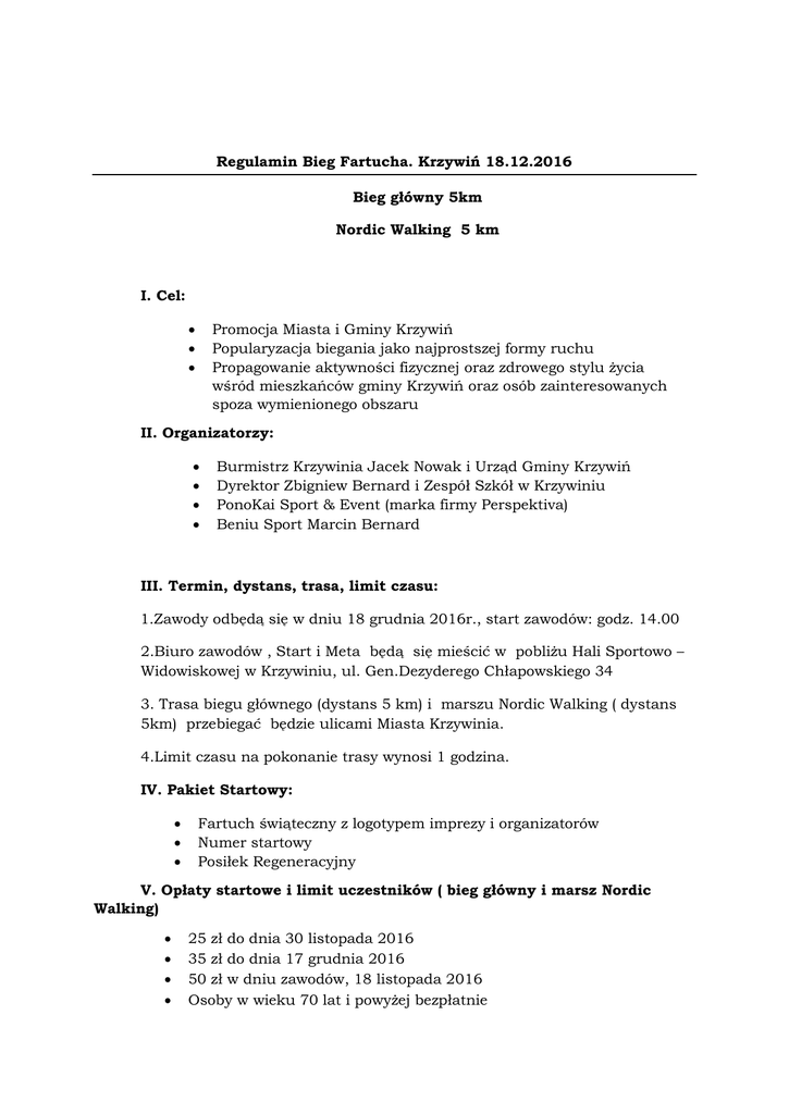Regulamin Bieg Fartucha. Krzywiń 18.12.2016 Bieg główny 5km Nordic Walking 5 km I. Cel: Promocja Miasta i Gminy Krzywiń Popularyzacja biegania jako najprostszej formy ruchu Propagowanie aktywności fizycznej oraz zdrowego stylu życia wśród mieszkańców gminy Krzywiń oraz osób zainteresowanych spoza wymienionego obszaru II. Organizatorzy: Burmistrz Krzywinia Jacek Nowak i Urząd Gminy Krzywiń Dyrektor Zbigniew Bernard i Zespół Szkół w Krzywiniu PonoKai Sport & Event (marka firmy Perspektiva) Beniu Sport Marcin Bernard III. Termin, dystans, trasa, limit czasu: 1.Zawody odbędą się w dniu 18 grudnia 2016r., start zawodów: godz. 14.00 2.Biuro zawodów , Start i Meta będą się mieścić w pobliżu Hali Sportowo – Widowiskowej w Krzywiniu, ul. Gen.Dezyderego Chłapowskiego 34 3. Trasa biegu głównego (dystans 5 km) i marszu Nordic Walking ( dystans 5km) przebiegać będzie ulicami Miasta Krzywinia. 4.Limit czasu na pokonanie trasy wynosi 1 godzina. IV. Pakiet Startowy: Fartuch świąteczny z logotypem imprezy i organizatorów Numer startowy Posiłek Regeneracyjny V. Opłaty startowe i limit uczestników ( bieg główny i marsz Nordic Walking) 25 zł do dnia 30 listopada 2016 35 zł do dnia 17 grudnia 2016 50 zł w dniu zawodów, 18 listopada 2016 Osoby w wieku 70 lat i powyżej bezpłatnie Limit uczestników Biegu Fartucha (bieg główny) 250 osób Limit uczestników marszu Nordic Walking 50 osób VI .Klasyfikacje i kategorie Bieg główny 1.Zawodnicy klasyfikowani będą zgodnie z datą urodzenia Kobiety Mężczyźni Open 1-3 Open 1-3 K20 (16-29lat) M20 (16-29lat) K30 (30-39lat) M30 (30-39lat) K40 (40-49lat) M40 (40-49lat) K50 (50+) M50 (50-59lat) M60 (60-69) 70+ 2.Kategoria: Mistrz/Mistrzyni Gminy Krzywiń Marsz Nordic Walking: Kobiety Open 1-3 Mężczyźni Open 1-3 VII. Nagrody: 1.Każdy finalista biegu głównego i marszu Nordic Walking otrzyma na mecie pamiątkowy medal. 2.Zdobywcy miejsc I-III biegu głównego w klasyfikacji OPEN mężczyzn i OPEN kobiet otrzymają nagrody rzeczowe i pamiątkowe statuetki-niespodzianki 3.Zdobywcy miejsc I-III w kategoriach wiekowych kobiet i mężczyzn i kategorii Mistrz i Mistrzyni Gminy Krzywiń otrzymają pamiątkowe dyplomy i drobne nagrody rzeczowe. 4. Zdobywcy miejsc I-III marszu Nordic Walking w klasyfikacji OPEN mężczyzn i OPEN kobiet otrzymają nagrody rzeczowe i pamiątkowe dyplomy. 5.Osoby nagrodzone w klasyfikacji OPEN nie są nagradzane w ramach kategorii wiekowej – nagroda cedowana jest na kolejną osobę w danej kategorii wiekowej. 6.Odbiór nagród może nastąpić wyłącznie podczas kończącej zawody ceremonii wręczenia nagród. 7.Nie ma możliwości wymiany nagród rzeczowych. VIII. Zgłoszenia, Lista startowa, pomiar czasu, wyniki 1. Po wypełnieniu formularza zgłoszeniowego znajdującego się na stronie internetowej https://www.facebook.com/biegfartucha/ lub www.biegfartucha.pl i opłaceniu wpisowego zawodnik będzie umieszczony na liście startowej. O terminie zgłoszenia decyduje data dokonania wpłaty wpisowego, przez którą rozumie się datę wpływu kwoty wpisowego na rachunek bankowy Organizatora. 2. Zapisy elektroniczne można dokonywać do 13.12.2016r. godz: 23.59 (lub do osiągnięcia limitu zawodników) , po tym terminie, pod warunkiem nie wyczerpania limitów, zapisy będą przyjmowane na email [email protected] lub w biurze zawodów. 3. W przypadku rezygnacji z zawodów, po dokonaniu wpłaty-wpisowe nie podlega zwrotowi. Jednak jest możliwość przeniesienia tej opłaty na innego zawodnika w terminie do 09.18.2016 (opłata manipulacyjna 5zł). Wszelkie zmiany należy zgłaszać pisemnie na adres e-mail: [email protected]. Reklamacje dotyczące spraw związanych ze zgłoszeniami na Bieg Fartucha i marszu Nordic Walking , należy zgłaszać pisemnie na adres e-mail: [email protected]. Reklamacje będą rozpatrywane w terminie 7 dni od daty zgłoszenia reklamacji. 4. Pomiar czasu podczas biegu głównego Biegu Fartucha i marszu Nordic Walking wykona firma PLUS TIMING. Pomiar czasu i ustalenie kolejności odbywać się będzie za pomocą chipów aktywnych wbudowanych w numerze startowym lub chipów elektronicznych mocowanych na nogę. 5. Oficjalnym czasem zawodów będzie czas brutto. 6. Obowiązuje limit liczby uczestników: - Bieg Fartucha (bieg główny) 250 osób -Marsz Nordic Walking 50 osób 7. Oficjalne wyniki będą zamieszczone na stronie internetowej organizatora https://www.facebook.com/biegfartucha/ i www.biegfartucha.pl, oraz w formie papierowej w dniu zawodów 8. Wyniki zostaną ogłoszone najpóźniej na 15 minut przed ceremonią wręczenia nagród. IX. Warunki uczestnictwa: 1. W celu weryfikacji każdy zawodnik musi zgłosić się osobiście w biurze zawodów z dokumentem potwierdzającym tożsamość. 2.W biegu głównym i marszu nordic walking mogą brać udział wszyscy zawodnicy, którzy do dnia biegu. tj. 18.12.2016r. ukończyli 16 rok życia. Zawodnik niepełnoletni musi przedstawić pisemną zgodę rodziców lub opiekunów prawnych na udział w zawodach oraz zgodę na przetwarzane danych osobowych do celów weryfikacji. 3. Uczestnik staruje wyłącznie na własną odpowiedzialność i ponosi związane z tym ryzyko. Wszyscy uczestnicy przyjmują do wiadomości, że udział w imprezie sportowej wiąże się z wysiłkiem fizycznym i pociąga za sobą naturalne ryzyko i zagrożenie wypadkami, możliwość odniesienia obrażeń ciała, urazów fizycznych (w tym śmierci) a także szkód i strat o charakterze majątkowym 4.Każdy zawodnik musi wyrazić zgodę na przetwarzanie danych osobowych i jego wizerunku dla celów weryfikacji zawodnika oraz umieszczenia w komunikacie końcowym, a także dla celów marketingowych biegu. Zgodę potwierdza zgłoszeniem poprzez formularz zgłoszeniowy i własnoręcznym podpisem na karcie weryfikacji w biurze zawodów. 5.Każdy zawodnik ma obowiązek zapoznania się z regulaminem i zobowiązany jest do jego przestrzegania. 6. Zgłoszenie do bi
