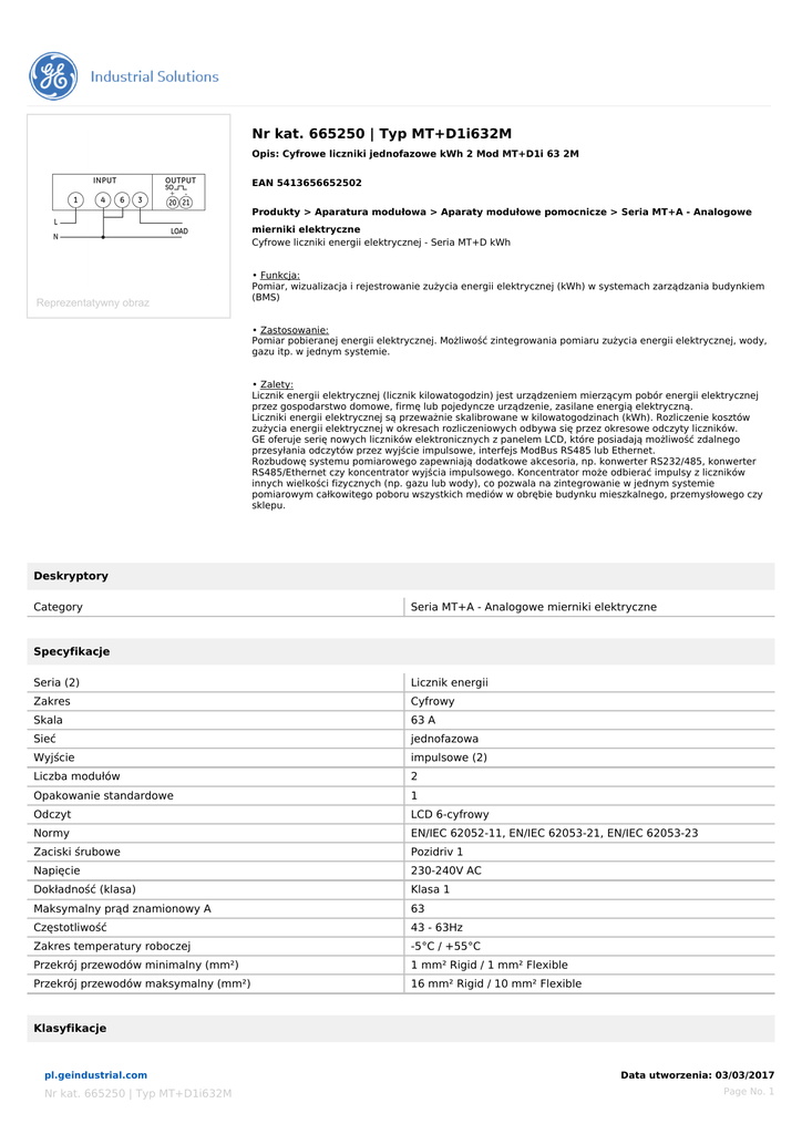 Nr kat. 665250 | Typ MT+D1i632M Opis: Cyfrowe liczniki jednofazowe kWh 2 Mod MT+D1i 63 2M EAN 5413656652502 Produkty > Aparatura modułowa > Aparaty modułowe pomocnicze > Seria MT+A - Analogowe mierniki elektryczne Cyfrowe liczniki energii elektrycznej - Seria MT+D kWh Reprezentatywny obraz • Funkcja: Pomiar, wizualizacja i rejestrowanie zużycia energii elektrycznej (kWh) w systemach zarządzania budynkiem (BMS) • Zastosowanie: Pomiar pobieranej energii elektrycznej. Możliwość zintegrowania pomiaru zużycia energii elektrycznej, wody, gazu itp. w jednym systemie. • Zalety: Licznik energii elektrycznej (licznik kilowatogodzin) jest urządzeniem mierzącym pobór energii elektrycznej przez gospodarstwo domowe, firmę lub pojedyncze urządzenie, zasilane energią elektryczną. Liczniki energii elektrycznej są przeważnie skalibrowane w kilowatogodzinach (kWh). Rozliczenie kosztów zużycia energii elektrycznej w okresach rozliczeniowych odbywa się przez okresowe odczyty liczników. GE oferuje serię nowych liczników elektronicznych z panelem LCD, które posiadają możliwość zdalnego przesyłania odczytów przez wyjście impulsowe, interfejs ModBus RS485 lub Ethernet. Rozbudowę systemu pomiarowego zapewniają dodatkowe akcesoria, np. konwerter RS232/485, konwerter RS485/Ethernet czy koncentrator wyjścia impulsowego. Koncentrator może odbierać impulsy z liczników innych wielkości fizycznych (np. gazu lub wody), co pozwala na zintegrowanie w jednym systemie pomiarowym całkowitego poboru wszystkich mediów w obrębie budynku mieszkalnego, przemysłowego czy sklepu. Deskryptory Category Seria MT+A - Analogowe mierniki elektryczne Specyfikacje Seria (2) Licznik energii Zakres Cyfrowy Skala 63 A Sieć jednofazowa Wyjście impulsowe (2) Liczba modułów 2 Opakowanie standardowe 1 Odczyt LCD 6-cyfrowy Normy EN/IEC 62052-11, EN/IEC 62053-21, EN/IEC 62053-23 Zaciski śrubowe Pozidriv 1 Napięcie 230-240V AC Dokładność (klasa) Klasa 1 Maksymalny prąd znamionowy A 63 Częstotliwość 43 - 63Hz Zakres temperatury roboczej -5°C / +55°C Przekrój przewodów minimalny (mm²) 1 mm² Rigid / 1 mm² Flexible Przekrój przewodów maksymalny (mm²) 16 mm² Rigid / 10 mm² Flexible Klasyfikacje pl.geindustrial.com Nr kat. 665250 | Typ MT+D1i632M Data utworzenia: 03/03/2017 Page No. 1 Klasyfikacje ETIM 5.0 EC001506 ETIM 6.0 EC001506 Wymiary Ciężar pl.geindustrial.com Nr kat. 665250 | Typ MT+D1i632M 0.230 kg Data utworzenia: 03/03/2017 Page No. 2 Publikacje Tytuł Numer publikacji Rodzaj publikacji 3D-01070 Drawings - CAD - 3D 3D-01070-PDF Drawings - CAD - 3D Series MT+D kWh - Digital monophase kWh 2 Mod (stp) 3D Drawing: Modular DIN-rail device - Comfort functions - Series MT+D kWh - Digital monophase kWh 2 Mod (STEP format) Series MT+D kWh - Digital monophase kWh 2 Mod (pdf) 3D PDF Viewer: Modular DIN-rail device - Comfort functions - Series MT+D kWh - Digital monophase kWh 2 Mod (3DPDF format) Dodatkowe Dokumenty: Odwiedź naszą bibliotekę aby znaleźć dokumenty techniczne, specyfikacje, katalogi produktów, rysunki 3D oraz materiały promocyjne… pl.geindustrial.com Nr kat. 665250 | Typ MT+D1i632M Data utworzenia: 03/03/2017 Page No. 3