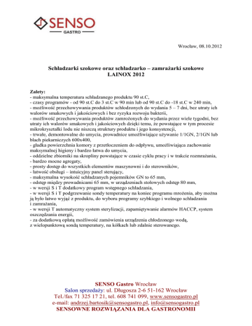 Wrocław, 08.10.2012 Schładzarki szokowe oraz schładzarko – zamrażarki szokowe LAINOX 2012 Zalety: - maksymalna temperatura schładzanego produktu 90 st.C, - czasy programów - od 90 st.C do 3 st.C w 90 min lub od 90 st.C do -18 st.C w 240 min, - możliwość przechowywania produktów schłodzonych do wydania 5 – 7 dni, bez utraty ich walorów smakowych i jakościowych i bez ryzyka rozwoju bakterii, - możliwość przechowywania produktów zamrożonych do wydania przez wiele tygodni, bez utraty ich walorów smakowych i jakościowych dzięki temu, że powstające w tym procesie mikrokryształki lodu nie niszczą struktury produktu i jego konsystencji, - trwałe, demontowalne do umycia, prowadnice umożliwiające używanie 1/1GN, 2/1GN lub blach piekarniczych 600x400, - gładka powierzchnia komory z przetłoczeniem do odpływu, umożliwiająca zachowanie maksymalnej higieny i bardzo łatwa do umycia, - oddzielne zbiorniki na skropliny powstające w czasie cyklu pracy i w trakcie rozmrażania, - bardzo mocne agregaty, - prosty dostęp do wszystkich elementów maszynowni i do sterowników, - łatwość obsługi – intuicyjny panel sterujący, - maksymalna wysokość schładzanych pojemników GN to 65 mm, - odstęp między prowadnicami 65 mm, w urządzeniach stołowych odstęp 80 mm, - w wersji S i T dodatkowy program wstępnego schładzania, - w wersji S i T podgrzewanie sondy temperatury na koniec programu mrożenia, aby można ją było łatwo wyjąć z produktu, do wyboru programy szybkiego i wolnego schładzania i zamrażania, - w wersji T automatyczny system sterylizacji, zapamiętywanie alarmów HACCP, system oszczędzania energii, - za dodatkową opłatą możliwość zamówienia urządzenia chłodzonego wodą, z wielopunktową sondą temperatury, na kółkach lub zdalnie sterowanego. SENSO Gastro Wrocław Salon sprzedaży: ul. Długosza 2-6 51-162 Wrocław Tel./fax 71 325 17 21, tel. 608 741 099, www.sensogastro.pl e-mail: [email protected], [email protected] SENSOWNE ROZWIĄZANIA DLA GASTRONOMII Urządzenia produkowane są w 3 wersjach sterowania: E - podstawowe sterowanie - szybkie chłodzenie - szybkie mrożenie - sonda temperatury - ręczne, czasowe rozmrażanie - sterilox - zewnętrzne urządzenie do sterylizacji - za dopłatą S – funkcje jak w E plus dodatkowe - możliwość wyboru programu szybkiego lub delikatnego schładzania lub mrożenia - kontrola ustawień czasowych i kontrola statystyk czasowych - manualne ustawienia czasu i kontroli temperatury w komorze - dodatkowy program wstępnego schłodzenia - podgrzewanie sondy na koniec programu mrożenia SENSO Gastro Wrocław Salon sprzedaży: ul. Długosza 2-6 51-162 Wrocław Tel./fax 71 325 17 21, tel. 608 741 099, www.sensogastro.pl e-mail: [email protected], [email protected] SENSOWNE ROZWIĄZANIA DLA GASTRONOMII T- funkcje jak w E i S plus dodatkowe - wielopunktowa sonda temperatury - za dopłatą - zapamiętywanie alarmów HACCP - wbudowany automatyczny system sterylizacji - wbudowany system oszczędzania energii Pierwsze litery w symbolu oznaczają: AB – urządzenia małe stołowe RD - urządzenie o mniejszej wydajności (mniejsza ilość kg schładzanej żywności) RC - urządzenie o większej wydajności (większa ilość kg schładzanej żywności) Trzecia litera w symbolu oznacza: R - schładzarka szokowa M - schładzarko - zamrażarka szokowa Cyfry w symbolu oznaczają pojemność GN: np.: 121 - 12 pojemników GN o wielkości 1/1 Ostatnia litera w symbolu oznacza rodzaj sterowania: E S T Np.: RC M 121 T schładzarko - zamrażarka szokowa (M), o podwyższonej wydajności (36 kg - schładzanie, 24 kg - mrożenie) (RC), o pojemności 12 x 1/1GN (121), sterowanie T SENSO Gastro Wrocław Salon sprzedaży: ul. Długosza 2-6 51-162 Wrocław Tel./fax 71 325 17 21, tel. 608 741 099, www.sensogastro.pl e-mail: [email protected], [email protected] SENSOWNE ROZWIĄZANIA DLA GASTRONOMII Pojemność 3x2/3GN z prowadnicami – urządzenie stołowe: schładzarko – zamrażarka szokowa, temp. od 90 do 3 – 8kg, temp. od 90 do -18 – 5kg 230 V / 0,96 kW 560/595/520 AB M 023 S – 12 470,00 - dopłata za podgrzewanie sondy temperatury – 946,00 Pojemność 3x1/1GN z prowadnicami – urządzenie stołowe: schładzarko – zamrażarka szokowa, temp. od 90 do 3 – 8kg, temp. od 90 do -18 – 5kg 230 V / 0,96 kW 560/700/520 AB M 031 S – 13 846,00 - dopłata za podgrzewanie sondy temperatury – 946,00 SENSO Gastro Wrocław Salon sprzedaży: ul. Długosza 2-6 51-162 Wrocław Tel./fax 71 325 17 21, tel. 608 741 099, www.sensogastro.pl e-mail: [email protected], [email protected] SENSOWNE ROZWIĄZANIA DLA GASTRONOMII Pojemność 5x1/1GN z prowadnicami - bez blatu roboczego: schładzarka szokowa, temp. od 90 do 3 – 10kg 230 V / 0,8 kW 790/700/800 RD R 050 E – 13 717,00 schładzarko – zamrażarka szokowa, temp. od 90 do 3 – 10kg, temp. od 90 do -18 – 7kg 230 V / 1 kW 790/700/800 RD M 050 E – 15 136,00 - dopłata za urządzenie na kółkach – 473,00 - dopłata za chłodzenie wodą – 3 225,00 - dopłata za zdalne sterowanie – 3 999,00 - dopłata za urządzenie sterilox – 4 687,00 Pojemność 5x1/1GN z prowadnicami – z blatem roboczym: schładzarka szokowa, temp. od 90 do 3 – 18kg 230 V / 1,2 kW 790/700/850 RC R 051 S – 19 006,00 schładzarka szokowa, temp. od 90 do 3 – 12kg 230 V / 1 kW 790/700/850 RD R 051 S – 17 544,00 schładzarko – zamrażarka szokowa, temp. od 90 do 3 – 18kg, temp. od 90 do -18 – 12kg 230 V / 1,4 kW 790/700/850 RC M 051 S – 20 597,00 schładzarko – zamrażarka szokowa, temp. od 90 do 3 – 12kg, temp. od 90 do -18 – 8kg 230 V / 1,2 kW 790/700/850 RD M 051 S – 18 705,00 - dopłata za urządzenie na kółkach – 473,00 - dopłata za chłodzenie wodą – 3 225,00 - dopłata za zdalne sterowanie (tylko D) – 3 999,00 - dopłata za zdalne sterowanie (tylko C) – 4 558,00 - dopłata za urządzenie sterilox – 4 687,00 SENSO Gastro Wrocław Salon sprzedaży: ul.