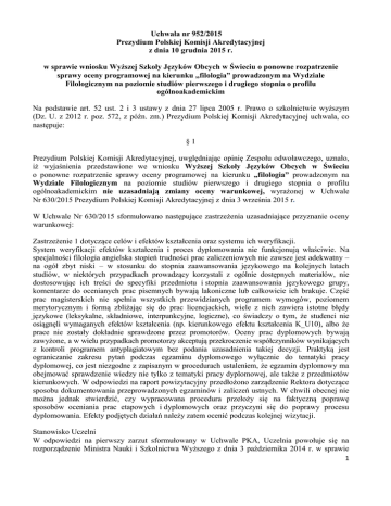 Uchwała nr 952/2015 Prezydium Polskiej Komisji Akredytacyjnej z
