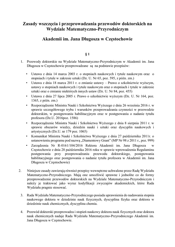 Zasady wszczęcia i przeprowadzania przewodów doktorskich na Wydziale Matematyczno-Przyrodniczym Akademii im. Jana Długosza w Częstochowie §1 1. Przewody doktorskie na Wydziale Matematyczno-Przyrodniczym w Akademii im. Jana Długosza w Częstochowie przeprowadzane są na podstawie przepisów: • • • • • • • 2. Ustawa z dnia 14 marca 2003 r. o stopniach naukowych i tytule naukowym oraz o stopniach i tytule w zakresie sztuki (Dz. U. Nr 65, poz. 595, z późn. zm.) Ustawa z dnia 18 marca 2011 r. o zmianie ustawy – Prawo o szkolnictwie wyższym, ustawy o stopniach naukowych i tytule naukowym oraz o stopniach i tytule w zakresie sztuki oraz o zmianie niektórych innych ustaw (Dz. U. Nr 84, poz. 455) Ustawa z dnia 27 lipca 2005 r. Prawo o szkolnictwie wyższym (Dz. U. Nr 164, poz. 1365, z późn. zm.) Rozporządzenie Ministra Nauki i Szkolnictwa Wyższego z dnia 26 września 2016 r. w sprawie szczegółowego trybu i warunków przeprowadzania czynności w przewodzie doktorskim, w postępowaniu habilitacyjnym oraz w postępowaniu o nadanie tytułu profesora (Dz.U. 2016poz. 1586) Rozporządzenie Ministra Nauki i Szkolnictwa Wyższego z dnia 8 sierpnia 2011 r. w sprawie obszarów wiedzy, dziedzin nauki i sztuki oraz dyscyplin naukowych i artystycznych (Dz.U. nr 179 poz. 1065) Komunikat Ministra Nauki i Szkolnictwa Wyższego z dnia 27 października 2011r. o ustanowieniu programu pod nazwą „Diamentowy Grant” (MP Nr 98 z 2011 r., poz. 999) Zarządzenia Nr R-0161/104/2016 Rektora Akademii im. Jana Długosza w Częstochowie z dnia 28 października 2016 roku w sprawie wprowadzenia Regulaminu postępowania przy przeprowadzaniu przewodu doktorskiego, postępowania habilitacyjnego oraz postępowania o nadanie tytułu profesora w Akademii im. Jana Długosza w Częstochowie) Niniejsze zasady zawierają również przepisy wewnętrzne uchwalone przez Radę Wydziału Matematyczno-Przyrodniczego. Mają one umożliwić sprawne i jednolite co do formy przeprowadzenie przewodów doktorskich na Wydziale Matematyczno-Przyrodniczym i należy je traktować jako wyraz kodyfikacji zwyczajów akademickich, które Rada Wydziału pragnie stosować. 3. Rada Wydziału Matematyczno-Przyrodniczego posiada uprawnienia do nadawania stopnia naukowego doktora w dziedzinie nauk fizycznych, dyscyplina fizyka oraz doktora w dziedzinie nauk chemicznych, dyscyplina chemia. 4. Przewód doktorski przeprowadza i stopień naukowy doktora nauk fizycznych oraz doktora nauk chemicznych nadaje Rada Wydziału Matematyczno-Przyrodniczego Akademii im. Jana Długosza w Częstochowie. 5. Rada Wydziału może przeprowadzić przewód doktorski wyłącznie w zakresie posiadanych uprawnień określonych w § 1, pkt. 4, jeżeli wśród członków Rady zatrudnionych na Wydziale Matematyczno-Przyrodniczym znajduje się co najmniej jeden pracownik z tytułem naukowym lub stopniem naukowym doktora habilitowanego reprezentujący specjalność odpowiadającą tematowi rozprawy doktorskiej. 6. W razie braku pracownika z tytułem naukowym lub stopniem naukowym doktora habilitowanego reprezentujący specjalność odpowiadającą tematowi rozprawy doktorskiej Centralna Komisja ds. Stopni i Tytułów, zwana dalej Centralną Komisją, działając na wniosek Rady Wydziału Matematyczno-Przyrodniczego może zarządzić uzupełnienie składu Rady Wydziału Matematyczno-Przyrodniczego o osoby nie będące członkami tej Rady. Osoby te mają uprawnienia członka Rady w sprawach danego przewodu doktorskiego. 7. Czynności przewodu doktorskiego kończą się uchwałami Rady Wydziału. Uchwały te są ważne, jeżeli zostały podjęte w głosowaniu tajnym w obecności co najmniej połowy liczby osób uprawnionych do głosowania, a za przyjęciem uchwały wypowiedziało się więcej niż połowa osób uczestniczących w głosowaniu. 8. Czynności przewodu doktorskiego wykonuje Komisja naukowa dla dyscypliny naukowej chemia oraz Komisja naukowa dla dyscypliny naukowej fizyka, zwana dalej Komisją. 9. W skład Komisji wchodzą: • Członkowie Rady naukowej dla dyscypliny naukowej chemia lub odpowiednio Członkowie Rady naukowej dla dyscypliny naukowej fizyka, • promotor lub promotorzy, promotor i kopromotor, promotor pomocniczy (bez prawa głosu) oraz recenzenci rozprawy doktorskiej W skład Komisji mogą również wchodzić osoby delegowane przez Instytuty, będące Członkami Rady Wydziału Matematyczno-Przyrodniczego - po jednym profesorze lub doktorze habilitowanym z każdego Instytutu. 10. Formalności związanych z prowadzeniem przewodów doktorskich przygotowuje przewodniczący Komisji a nadzoruje Prodziekan ds. Nauki. 11. Dokumentację postępowania dotyczącego nadania stopnia doktora gromadzi i przechowuje Wydział. §2 I. Etap: Przygotowanie do wszczęcia przewodu doktorskiego 1. Warunkiem otwarcia przewodu jest autorstwo lub współautorstwo co najmniej dwóch wydanych lub przyjętych do druku publikacji naukowych w formie książki, rozdziału w książce lub publikacji w recenzowanym czasopiśmie naukowym o zasięgu co najmniej krajowym lub w recenzowanym sprawozdaniu z międzynarodowej konferencji naukowej. 2. Osoba ubiegająca się o nadanie stopnia doktora, zwana dalej „kandydatem” składa do Dziekana Wydziału Matematyczno-Przyrodniczego wniosek o wszczęcie przewodu doktorskiego oraz następujące dokumenty: • kopię dokumentu stwierdzającego posiadanie tytułu zawodowego magistra, magistra inżyniera (o którym mowa w art. 12 ust. 1 pkt. 1 Ustawy z dnia 14 marca 2003 r. o stopniach i tytule naukowym oraz o stopniach i tytule w zakresie sztuki) lub dyplomu potwierdzającego ukończenie studiów wyższych za granicą dającego prawo do kontynuacji kształcenia lub otwarcia przewodu doktorskiego w państwie, w którego systemie szkolnictwa wyższego działa uczelnia, która ten dyplom wydała, bądź dyplomu potwierdzającego ukończenie studiów wyższych prowadzonych wspólnie przez uczelnie zagraniczne (art. 191a ust. 3 i 4