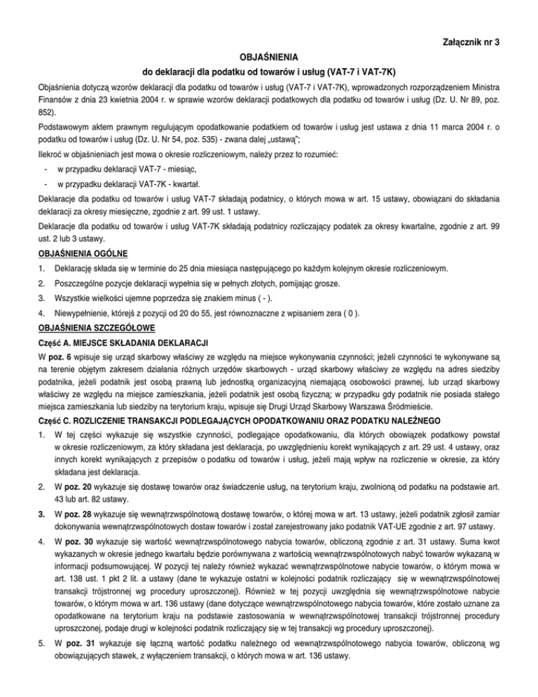 Zał cznik nr 3 OBJA NIENIA do deklaracji dla podatku od towarów i usług (VAT-7 i VAT-7K) Obja nienia dotycz wzorów deklaracji dla podatku od towarów i usług (VAT-7 i VAT-7K), wprowadzonych rozporz dzeniem Ministra Finansów z dnia 23 kwietnia 2004 r. w sprawie wzorów deklaracji podatkowych dla podatku od towarów i usług (Dz. U. Nr 89, poz. 852). Podstawowym aktem prawnym reguluj cym opodatkowanie podatkiem od towarów i usług jest ustawa z dnia 11 marca 2004 r. o podatku od towarów i usług (Dz. U. Nr 54, poz. 535) - zwana dalej „ustaw ”; Ilekro w obja nieniach jest mowa o okresie rozliczeniowym, nale y przez to rozumie : - w przypadku deklaracji VAT-7 - miesi c, - w przypadku deklaracji VAT-7K - kwartał. Deklaracje dla podatku od towarów i usług VAT-7 składaj podatnicy, o których mowa w art. 15 ustawy, obowi zani do składania deklaracji za okresy miesi czne, zgodnie z art. 99 ust. 1 ustawy. Deklaracje dla podatku od towarów i usług VAT-7K składaj podatnicy rozliczaj cy podatek za okresy kwartalne, zgodnie z art. 99 ust. 2 lub 3 ustawy. OBJA NIENIA OGÓLNE 1. Deklaracj składa si w terminie do 25 dnia miesi ca nast puj cego po ka dym kolejnym okresie rozliczeniowym. 2. Poszczególne pozycje deklaracji wypełnia si w pełnych złotych, pomijaj c grosze. 3. Wszystkie wielko ci ujemne poprzedza si znakiem minus ( - ). 4. Niewypełnienie, której z pozycji od 20 do 55, jest równoznaczne z wpisaniem zera ( 0 ). OBJA NIENIA SZCZEGÓŁOWE Cz A. MIEJSCE SKŁADANIA DEKLARACJI W poz. 6 wpisuje si urz d skarbowy wła ciwy ze wzgl du na miejsce wykonywania czynno ci; je eli czynno ci te wykonywane s na terenie obj tym zakresem działania ró nych urz dów skarbowych - urz d skarbowy wła ciwy ze wzgl du na adres siedziby podatnika, je eli podatnik jest osob prawn lub jednostk organizacyjn niemaj c osobowo ci prawnej, lub urz d skarbowy wła ciwy ze wzgl du na miejsce zamieszkania, je eli podatnik jest osob fizyczn ; w przypadku gdy podatnik nie posiada stałego miejsca zamieszkania lub siedziby na terytorium kraju, wpisuje si Drugi Urz d Skarbowy Warszawa ródmie cie. Cz C. ROZLICZENIE TRANSAKCJI PODLEGAJ CYCH OPODATKOWANIU ORAZ PODATKU NALE NEGO 1. W tej cz ci wykazuje si wszystkie czynno ci, podlegaj ce opodatkowaniu, dla których obowi zek podatkowy powstał w okresie rozliczeniowym, za który składana jest deklaracja, po uwzgl dnieniu korekt wynikaj cych z art. 29 ust. 4 ustawy, oraz innych korekt wynikaj cych z przepisów o podatku od towarów i usług, je eli maj wpływ na rozliczenie w okresie, za który składana jest deklaracja. 2. W poz. 20 wykazuje si dostaw towarów oraz wiadczenie usług, na terytorium kraju, zwolnion od podatku na podstawie art. 43 lub art. 82 ustawy. 3. W poz. 28 wykazuje si wewn trzwspólnotow dostaw towarów, o której mowa w art. 13 ustawy, je eli podatnik zgłosił zamiar dokonywania wewn trzwspólnotowych dostaw towarów i został zarejestrowany jako podatnik VAT-UE zgodnie z art. 97 ustawy. 4. W poz. 30 wykazuje si warto wewn trzwspólnotowego nabycia towarów, obliczon zgodnie z art. 31 ustawy. Suma kwot wykazanych w okresie jednego kwartału b dzie porównywana z warto ci wewn trzwspólnotowych naby towarów wykazan w informacji podsumowuj cej. W pozycji tej nale y równie wykaza wewn trzwspólnotowe nabycie towarów, o którym mowa w art. 138 ust. 1 pkt 2 lit. a ustawy (dane te wykazuje ostatni w kolejno ci podatnik rozliczaj cy si w wewn trzwspólnotowej transakcji trójstronnej wg procedury uproszczonej). Równie w tej pozycji uwzgl dnia si wewn trzwspólnotowe nabycie towarów, o którym mowa w art. 136 ustawy (dane dotycz ce wewn trzwspólnotowego nabycia towarów, które zostało uznane za opodatkowane na terytorium kraju na podstawie zastosowania w wewn trzwspólnotowej transakcji trójstronnej procedury uproszczonej, podaje drugi w kolejno ci podatnik rozliczaj cy si w tej transakcji wg procedury uproszczonej). 5. W poz. 31 wykazuje si ł czn warto podatku nale nego od wewn trzwspólnotowego nabycia towarów, obliczon wg obowi zuj cych stawek, z wył czeniem transakcji, o których mowa w art. 136 ustawy. 6. 7. 2 Poz. 34 i 35 wypełnia nabywca towarów, je eli dokonuj cym dostawy na terytorium kraju jest podatnik nieposiadaj cy siedziby, stałego miejsca prowadzenia działalno ci lub stałego miejsca zamieszkania na terytorium kraju, z wył czeniem dostaw dokonywanych w ramach procedury uproszczonej, o której mowa w art. 135 – 138 ustawy. W pozycjach tych nie uwzgl dnia si dostaw, od których podatek od towarów i usług rozliczył dostawca. W poz. 37 wykazuje si podatek nale ny od wewn trzwspólnotowego nabycia nowych rodków transportu, wpłacony w terminie, o którym mowa w art. 103 ust. 4 ustawy, wykazany w poz. 31, je eli wpłata ta została dokonana przed dniem zło enia deklaracji, w której nabycie to zostało wykazane. Cz D. ROZLICZENIE PODATKU NALICZONEGO W tej cz ci wykazuje si wył cznie warto towarów i usług oraz kwot podatku naliczonego (z uwzgl dnieniem korekt), w takiej wysoko ci w jakiej podatnikowi przysługuje prawo do odliczenia podatku naliczonego od nale nego lub zwrot podatku naliczonego, na zasadach okre lonych w przepisach art. 86 - 93 ustawy, z uwzgl dnieniem przepisów wykonawczych, w okresie rozliczeniowym za który składana jest deklaracja. Cz E. OBLICZENIE WYSOKO CI ZOBOWI ZANIA PODATKOWEGO LUB KWOTY ZWROTU 1. Odlicze z tytułu zakupu kas rejestruj cych dokonuje si w poz. 48 lub 51 w nast puj cy sposób: - 2. Cz w przypadku wyst pienia nadwy ki podatku nale nego nad naliczonym - w poz. 48 wpisuje si kwot wydatkowan na zakup kas rejestruj cych, w cz ci przysługuj cej do odliczenia w danym okresie rozliczeniowym, do wysoko ci tej nadwy ki; - w przypadku gdy kwota podatku naliczonego jest wi ksza lub równa kwocie podatku nale nego w danym okresie rozliczeniowym - w poz. 51 wpisuje si kwot przysługuj cego w tym okresie podatnikowi zwrotu z tytułu nabycia kas rejestruj cych. W poz. 49 wykazuje