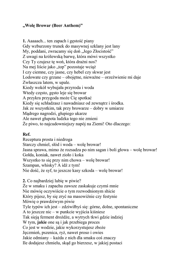„Wolę Browar (Beer Anthem)” 1. Aaaaach... ten zapach i gęstość piany Gdy wzburzony trunek do masywnej szklany jest lany My, poddani, zwracamy się doń „Jego Złocistość” Z uwagi na królewską barwę, która mówi wszystko Czy Ty czujesz tę woń, która drażni nos? Na mej liście jako „top” pozostaje wciąż I czy ciemne, czy jasne, czy hebel czy skwar jest Lodowate czy grzane – obojętne, nieważne – orzeźwienie mi daje Zwłaszcza latem, w upale. Kiedy wokół wybujała przyroda i woda Wtedy często, gęsto leje się browar A przykra przygoda może Cię spotkać Kiedy się schładzasz i nawadniasz od zewnątrz i środka. Jak ze wszystkim, tak przy browarze – dobry w umiarze Mądrego nagrodzi, głupiego ukarze Ale nawet głupota ludzka tego nie zmieni Że piwo, to najcudowniejszy napój na Ziemi! Oto dlaczego: Ref. Receptura prosta i niedroga Starczy chmiel, słód i woda – wolę browar! Jasna sprawa, mimo że rozsadza po nim sagan i boli głowa – wolę browar! Gołda, koniak, nawet zioło i koka Wszystko to się przy nim chowa – wolę browar! Szampan, whisky? A idź z tym! Nie dość, że syf, to jeszcze kasy szkoda – wolę browar! 2. Co najbardziej lubię w piwie? Że w smaku i zapachu zawsze zaskakuje czymś mnie Nie mówię oczywiście o tym rozwodnionym shicie Który pijesz, by się zryć na masowiźnie czy festynie Mówię o prawdziwym piwie Tyle typów ich jest – zdziwiłbyś się: górne, dolne, spontaniczne A to jeszcze nic – w punkcie wyjścia kiśniesz Tak sieją ferment drożdże, a wytrych tkwi gdzie indziej W tym, jakie one są i jak przebiega proces Co jest w wodzie, jakie wykorzystujesz zboże Jęczmień, pszenica, ryż, nawet proso i owies Jakie odmiany – każda z nich dla smaku coś znaczy Ile dodajesz chmielu, skąd go bierzesz, w jakiej postaci Dla zabawy – zioła, owoce, inne przyprawy O tym waży kunszt ludzi, którzy znają się na tym Piwowarzy, co tyle odmian, styli stworzyli Że nawet przy winie – jak widzisz – nie ma się czego wstydzić, proste! Ref. Receptura prosta i niedroga Starczy chmiel, słód i woda – wolę browar! Jasna sprawa, mimo że rozsadza po nim sagan i boli głowa – wolę browar! Gołda, koniak, nawet zioło i koka Wszystko to się przy nim chowa – wolę browar! Szampan, whisky? A idź z tym! Nie dość, że syf, to jeszcze kasy szkoda – wolę browar! 3. Latem – pils i lager, klasyczne pełne jasne Na jesień – ciemniejsze, o pełniejszym bukiecie Najlepiej wyspiarskie: ale’e wszelkiej maści i brown Zimą nie ma nic lepszego niż wytrawny stout Uwielbiam sączyć wtedy koźlaki i portery Za to kiedy wiosna idzie, przywitam ją lambic’iem By goryczą zniszczył mróz. Za to majem Kiedy świat do życia wstaje, piję moje ulubione – pszeniczne białe. Coś się znajdzie na każdą okazję. W Polsce mamy się czym chwalić, ale cały czas jest Skąd czerpać inspirację. W takiej Belgii Na co drugim rogu znajdziesz knajpę Z małym browarem, każda ma i dba o własną markę Co jest nie tak, że nie tak jest w naszym kraju także Może trzeba wprowadzić jakieś zmiany w prawodastwie? To innym razem. Na ten czas się bawmy, chwalmy nasze pyszne polskie piwo! Ref. Receptura prosta i niedroga Starczy chmiel, słód i woda – wolę browar! Jasna sprawa, mimo że rozsadza po nim sagan i boli głowa – wolę browar! Gołda, koniak, nawet zioło i koka Wszystko to się przy nim chowa – wolę browar! Szampan, whisky? A idź z tym! Nie dość, że syf, to jeszcze kasy szkoda – wolę browar!