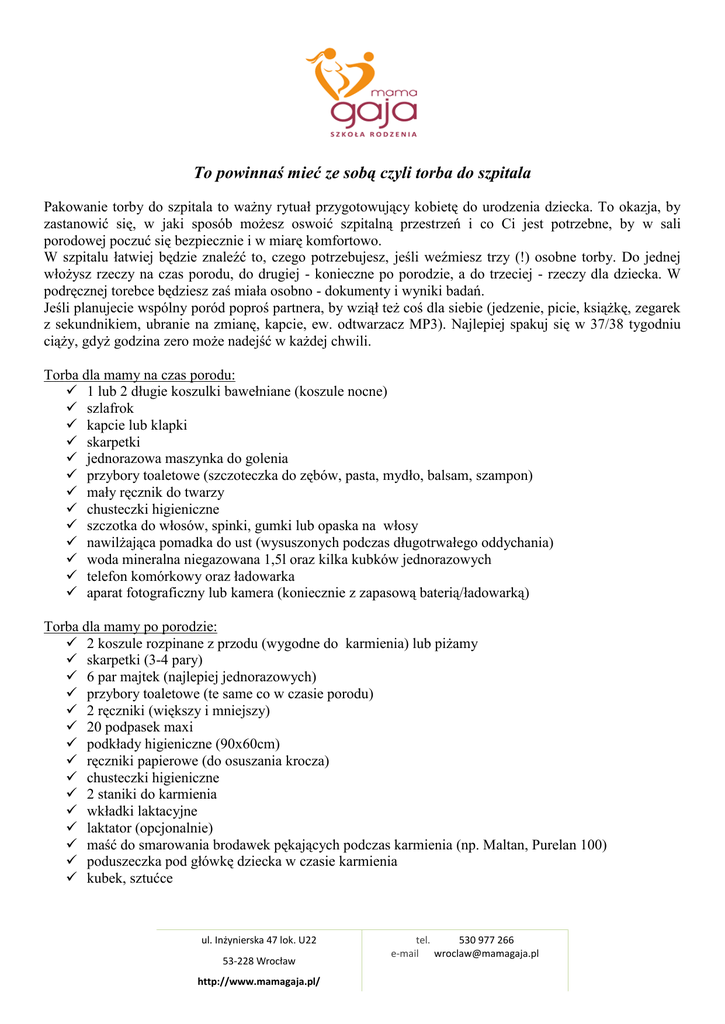To powinnaś mieć ze sobą czyli torba do szpitala Pakowanie torby do szpitala to ważny rytuał przygotowujący kobietę do urodzenia dziecka. To okazja, by zastanowić się, w jaki sposób możesz oswoić szpitalną przestrzeń i co Ci jest potrzebne, by w sali porodowej poczuć się bezpiecznie i w miarę komfortowo. W szpitalu łatwiej będzie znaleźć to, czego potrzebujesz, jeśli weźmiesz trzy (!) osobne torby. Do jednej włożysz rzeczy na czas porodu, do drugiej - konieczne po porodzie, a do trzeciej - rzeczy dla dziecka. W podręcznej torebce będziesz zaś miała osobno - dokumenty i wyniki badań. Jeśli planujecie wspólny poród poproś partnera, by wziął też coś dla siebie (jedzenie, picie, książkę, zegarek z sekundnikiem, ubranie na zmianę, kapcie, ew. odtwarzacz MP3). Najlepiej spakuj się w 37/38 tygodniu ciąży, gdyż godzina zero może nadejść w każdej chwili. Torba dla mamy na czas porodu: 1 lub 2 długie koszulki bawełniane (koszule nocne) szlafrok kapcie lub klapki skarpetki jednorazowa maszynka do golenia przybory toaletowe (szczoteczka do zębów, pasta, mydło, balsam, szampon) mały ręcznik do twarzy chusteczki higieniczne szczotka do włosów, spinki, gumki lub opaska na włosy nawilżająca pomadka do ust (wysuszonych podczas długotrwałego oddychania) woda mineralna niegazowana 1,5l oraz kilka kubków jednorazowych telefon komórkowy oraz ładowarka aparat fotograficzny lub kamera (koniecznie z zapasową baterią/ładowarką) Torba dla mamy po porodzie: 2 koszule rozpinane z przodu (wygodne do karmienia) lub piżamy skarpetki (3-4 pary) 6 par majtek (najlepiej jednorazowych) przybory toaletowe (te same co w czasie porodu) 2 ręczniki (większy i mniejszy) 20 podpasek maxi podkłady higieniczne (90x60cm) ręczniki papierowe (do osuszania krocza) chusteczki higieniczne 2 staniki do karmienia wkładki laktacyjne laktator (opcjonalnie) maść do smarowania brodawek pękających podczas karmienia (np. Maltan, Purelan 100) poduszeczka pod główkę dziecka w czasie karmienia kubek, sztućce ul. Inżynierska 47 lok. U22 53-228 Wrocław http://www.mamagaja.pl/ tel. 530 977 266 e-mail [email protected] Torba dla dziecka: kilka pieluch tetrowych małe opakowanie pieluch jednorazowych w najmniejszym rozmiarze, 15-20 sztuk typu "newborn" 2 bawełniane czapeczki skarpetki rękawiczki „niedrapki” ubranko na wyjście ze szpitala odpowiednie do pogody (dobrze chroniące przed wiatrem i chłodem) wilgotne chusteczki delikatny krem do pielęgnacji pupy (np. Bepanthen, Linomag zielony) szczoteczka do włosów Jeśli w szpitalu dziecko jest we własnych ciuszkach to: 3 koszulki bawełniane 3 śpioszki 2 bawełniane czapeczki 3 pajacyki kocyk/rożek Dokumenty: dowód osobisty karta przebiegu ciąży skierowanie do szpitala (nie jest wymagane) Wyniki badań: grupa krwi (wynik oryginalny) i czynnik Rh przy Rh(-) także wyniki badań na obecność przeciwciał anty Rh WR- robione w ciąży cytologia wykonywana w ciąży ostatnie USG (robione po 36 tygodniu ciąży) wraz z opisem ostatnia morfologia i badanie moczu Opracowała Agnieszka Rybarczyk-Ciunik ul. Inżynierska 47 lok. U22 53-228 Wrocław http://www.mamagaja.pl/ tel. 530 977 266 e-mail [email protected]