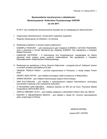 Poznań, 31 marca 2012 r. Sprawozdanie merytoryczne z działalności Stowarzyszenia Kulturalno-Turystycznego VIATOR za rok 2011 W 2011 roku działalność stowarzyszenia skupiała się na następujących aktywnościach: 1. Organizacja młodzieżowych i studenckich wyjazdów wyjazdów: • Wyjazdy trampingowy do Mołdawii i na Ukrainę. 2. Realizacja projektów w ramach zadań publicznych: • EXEMPLA TRAHUNT – cykl edukacyjnych gier miejskich EUREKA i SZTUKA POZNANIA, wraz z premierą w formie fabularnej gry miejskiej EUREKA. We współpracy z Urzędem Miasta Poznania, • ŁAMACZE SZYFRÓW – II Internetowa Gra Kryptologiczna, nawiązująca do historii złamania kodu enigmy przez polskich matematyków. We współpracy z Urzędem Marszałkowskim Województwa Wielkopolskiego. 3. Realizacja we współpracy z firmą „Szymon Dąbrowski – przygoda.edu.pl” kolejnych imprez w ramach projektu gramiejska.pl to jest: • ORSZAK TRZECH KRÓLI – pochód organizowany w Poznaniu, z okazji święta Trzach Króli, • ODKRYJ BIAŁYSTOK – gra miejska promująca szlaki turystyczne w Białymstoku, • ARENA DESIGN – gra miejska towarzysząca targom Arena Design, • GRA KULTURALNA – gra miejska z rozbudowanym etapem internetowym, promująca poznańskie instytucje oraz wydarzenia kulturalne, • II PIŁKARSKA GRA MIEJSKA – oficjalna impreza na 300 dni do Euro, Poznania Miasta Gospodarza UEFA EURO 2012, • URATUJ IMIENINY ULICY – gra miejska związana z obchodami Imienin Ulicy św. Marcin, • RAPORT Z OBLĘŻONEGO MIASTA – gra miejska z okazji 30. rocznicy wprowadzenia stanu wojennego w Polsce. MARCIN KROMA prezes SKT VIATOR