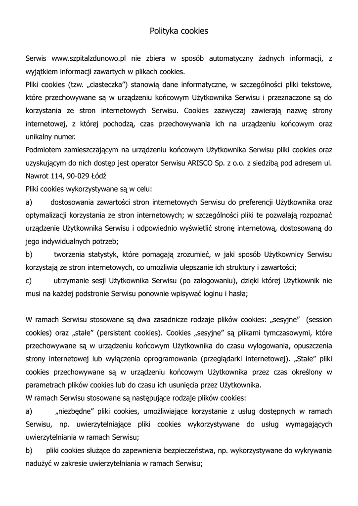 Polityka cookies Serwis www.szpitalzdunowo.pl nie zbiera w sposób automatyczny żadnych informacji, z wyjątkiem informacji zawartych w plikach cookies. Pliki cookies (tzw. „ciasteczka”) stanowią dane informatyczne, w szczególności pliki tekstowe, które przechowywane są w urządzeniu końcowym Użytkownika Serwisu i przeznaczone są do korzystania ze stron internetowych Serwisu. Cookies zazwyczaj zawierają nazwę strony internetowej, z której pochodzą, czas przechowywania ich na urządzeniu końcowym oraz unikalny numer. Podmiotem zamieszczającym na urządzeniu końcowym Użytkownika Serwisu pliki cookies oraz uzyskującym do nich dostęp jest operator Serwisu ARISCO Sp. z o.o. z siedzibą pod adresem ul. Nawrot 114, 90-029 Łódź Pliki cookies wykorzystywane są w celu: a) dostosowania zawartości stron internetowych Serwisu do preferencji Użytkownika oraz optymalizacji korzystania ze stron internetowych; w szczególności pliki te pozwalają rozpoznać urządzenie Użytkownika Serwisu i odpowiednio wyświetlić stronę internetową, dostosowaną do jego indywidualnych potrzeb; b) tworzenia statystyk, które pomagają zrozumieć, w jaki sposób Użytkownicy Serwisu korzystają ze stron internetowych, co umożliwia ulepszanie ich struktury i zawartości; c) utrzymanie sesji Użytkownika Serwisu (po zalogowaniu), dzięki której Użytkownik nie musi na każdej podstronie Serwisu ponownie wpisywać loginu i hasła; W ramach Serwisu stosowane są dwa zasadnicze rodzaje plików cookies: „sesyjne” (session cookies) oraz „stałe” (persistent cookies). Cookies „sesyjne” są plikami tymczasowymi, które przechowywane są w urządzeniu końcowym Użytkownika do czasu wylogowania, opuszczenia strony internetowej lub wyłączenia oprogramowania (przeglądarki internetowej). „Stałe” pliki cookies przechowywane są w urządzeniu końcowym Użytkownika przez czas określony w parametrach plików cookies lub do czasu ich usunięcia przez Użytkownika. W ramach Serwisu stosowane są następujące rodzaje plików cookies: a) „niezbędne” pliki cookies, umożliwiające korzystanie z usług dostępnych w ramach Serwisu, np. uwierzytelniające pliki cookies wykorzystywane do usług wymagających uwierzytelniania w ramach Serwisu; b) pliki cookies służące do zapewnienia bezpieczeństwa, np. wykorzystywane do wykrywania nadużyć w zakresie uwierzytelniania w ramach Serwisu; c) „wydajnościowe” pliki cookies, umożliwiające zbieranie informacji o sposobie korzystania ze stron internetowych Serwisu; d) „funkcjonalne” pliki cookies, umożliwiające „zapamiętanie” wybranych przez Użytkownika ustawień i personalizację interfejsu Użytkownika, np. w zakresie wybranego języka lub regionu, z którego pochodzi Użytkownik, rozmiaru czcionki, wyglądu strony internetowej itp.; e) „reklamowe” pliki cookies, umożliwiające dostarczanie Użytkownikom treści reklamowych bardziej dostosowanych do ich zainteresowań. W wielu przypadkach oprogramowanie służące do przeglądania stron internetowych (przeglądarka internetowa) domyślnie dopuszcza przechowywanie plików cookies w urządzeniu końcowym Użytkownika. Użytkownicy Serwisu mogą dokonać w każdym czasie zmiany ustawień dotyczących plików cookies. Ustawienia te mogą zostać zmienione w szczególności w taki sposób, aby blokować automatyczną obsługę plików cookies w ustawieniach przeglądarki internetowej bądź informować o ich każdorazowym zamieszczeniu w urządzeniu Użytkownika Serwisu. Szczegółowe informacje o możliwości i sposobach obsługi plików cookies dostępne są w ustawieniach oprogramowania (przeglądarki internetowej). Operator Serwisu informuje, że ograniczenia stosowania plików cookies mogą wpłynąć na niektóre funkcjonalności dostępne na stronach internetowych Serwisu. Pliki cookies zamieszczane w urządzeniu końcowym Użytkownika Serwisu i wykorzystywane mogą być również przez współpracujących z operatorem Serwisu reklamodawców oraz partnerów. Więcej informacji na temat plików cookies dostępnych jest pod adresem http://wszystkoociasteczkach.pl/ lub w sekcji „Pomoc” w menu przeglądarki internetowej.