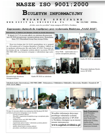 NASZE ISO 9001:2000 BIULETYN INFORMACYJNY W Y D A N I E W W W. S Z P I T S P E C J A L N E A L . S W I D N I C A . P L Nr II/ISO 2006r. „Krótko, tanio bez powikłań” misja zastępcza SP ZOZ w Świdnicy Zapraszamy chętnych do współpracy przy wydawaniu Biuletynu „NASZ ZOZ”. Informujemy, że biuletyn jest dostępny również na stronie internetowej W dniach 16,17,18 stycznia odbyły się szkolenia dla pracowników SP ZOZ przygotowane i przeprowadzone przez Konsultanta firmy TŰV Rheindland Group Pana Jerzego Pelika. Przez trzy kolejne dni (16-18.01) spotykaliśmy się w grupach ok. 150 osobowych w Urzędzie Miejskim w Świdnicy. Odbyły się tu spotkania informacyjne dla całej kadry SP ZOZ. Poruszano takie tematy jak np. wymagania systemu jakości wg normy PN-EN ISO 9001:2001 oraz korzyści związane z wdrożeniem tego systemu. Jerzy Pelik – wprowadza nas w system zarządzania jakością. Kadra SP ZOZ na szkoleniu Wręczanie dyplomu Dyrektorowi SP ZOZ. Przemówienie dyrektora Grzegorza Kloca. Kadra SP ZOZ na szkoleniu Szkolenia kadry kierowniczej z ISO 9001:2000 - Ordynatorzy i Oddziałowe Oddziałów, Kierownicy Działów i Komórek SP ZOZ (16.01.2006r) W dniu 16 stycznia odbyło się seminarium dla Dyrekcji SP ZOZ na którym poruszono następujące m.in. kwestie: rozwój systemów jakości filozofia i organizacja kompleksowego zarządzania jakością (TQM) struktura norm serii ISO 9001:2000 orientacja procesowa organizacja opracowania i wdrożenia systemu jakości kreatywność pracowników analiza skuteczności systemu jakości procedura certyfikacji systemu jakości Wszelkie informacje dotyczące przebiegu wdrażania systemu zarządzania jakością w SP ZOZ w Świdnicy dostępne są na naszej stronie interentowej: www.szpital.swidnica.pl Rada Programowa: Jacek Domejko, Grzegorz Kloc, Monika Bieżyńska, Anna Trelewska, Małgorzata Tomska, Danuta Kijek, Mieczysław Zielonka, Katarzyna Gromek. Przeszkoliliśmy auditorów – co to oznacza? Są to wybrane osoby, które będą przeprowadzały audity tj. sprawdzały jak ten system działa, czy jest realizowany we właściwy sposób. Celem auditów będzie wyeliminowanie różnych błędów lub nieprawidłowości oraz dostosowanie systemu. Lp. Nazwisko Imię Lp. Nazwisko Imię 1 Babiak Ireneusz Oddział Kardiologiczny 19 Kwinecka Daria Dział Kadrowo-Płacowy 2 Bartosińska Bożena Oddział AiIT 20 Lisowska Dorota Oddział Neurologiczny 3 Bieżyńska Anna Oddział Dziecięcy 21 Loret-Bortkiewicz Julita Mikrobiologia 22 Masełko Szymon Oddział Chor. Wewn. i Gastro. 4 Buczkowska Lidia Oddział Urazowo – Ortopedyczny 23 Niziołek Violetta Laboratorium 5 Ciążeńska Grażyna Dział Ekonomiczny 24 Prymuła Irena Oddział Kardiologiczny 6 Dziedzic Alicja Oddział Noworodkowy 25 Słowik Anna Izba Przyjęć „Latawiec” 7 Górka Katarzyna Oddział AiIT 26 Spilarewicz Arkadiusz Oddział Chirurgii Ogólnej 27 Szewczuk Bożena Dział Techniczny 8 Gromek Katarzyna Specjalista ds. Marketingu 28 Szczepaniak Helena Oddział Reumatologiczny 9 Jańczak Barbara Dział Sprzedaży 29 Szczerba Alicja Oddział Gin. – Poł. 10 Jawińska Beata Dział Ekonomiczny 30 Szyc Monika Oddział Okulistyczny Tomska Małgorzata Naczelna Pielęgniarka 11 Jurkowska Małgorzata Oddział Otolaryngologiczny 31 12 Karwala Agnieszka Blok Operacyjny 32 Trelewska Anna Dział Sprzedaży 13 Kijek Danuta Dział Kadrowo-Płacowy 33 Waśniewska Dorota Dział Organizacji i Nadzoru Kloc Krystyna Oddział Chor. Wewn. i Gastro. 34 Wilgos Ryszarda Dział Ekonomiczny 14 35 Wiśniewska Bożena Laboratorium 15 Kocon Irena Dział Administracyjno – Gospodar- 36 czy Wojtaszewski Arnold Oddział Dziecięcy 16 Konrad Katarzyna Pielęgniarka Epidemiologiczna 37 Zając Maria Oddział Dzienny Chemioterapii 17 Kowalska Ewa Oddział Otolaryngologiczny 38 Zielonka Mieczysław 18 Kusaj Artur RTG Dział Administracyjno – Gospodarczy Informujemy, że do dnia dzisiejszego zostały przeprowadzone audity wewnętrzne w działach: sprzedaży, ekonomicznym, kadrowo – płacowym, administracyjno gospodarczym oraz u specjalisty ds. marketingu. Podczas auditów, w obecności naszego konsultanta Pana Jerzego Pelika, nie stwierdzono krytycznych niegodności, które dyskwalifikowały by dalsze działania dot. wdrażania Systemu Zarządzania Jakością. Auditowi podlegały punkty normy EN ISO 9001:2000 takie jak: 1) 4.2.3 Nadzór nad dokumentami 2) 4.2.4 Nadzór nad zapisami 3) 5.4 Planowanie 4) 5.5.1 Odpowiedzialność i uprawnienia 5) 5.5.3 Komunikacja wewnętrzna 6) 6.1 Zapewnienie zasobów 7) 8 Pomiary, analiza i doskonalenie 8) 8.3 Nadzór nad wyrobem niezgodnym 9) 8.5.2 Działania korygujące 10) 8.5.3 Działania zapobiegawcze Kolejne audity planowane są w dniach 20 – 22 marca m.in. w Dziale Organizacji i Nadzoru, Zespole Informatyków, u Naczelnej Pielęgniarki i Pielęgniarki Epidemiologicznej. Audity w oddział, poradniach i pracowniach są planowane na miesiąc kwiecień i maj. Przeprowadzone szkolenia dla auditorów wewnętrznych obejmowało : wymagania norm ISO serii 9001:2000 cele auditów definicje stosowanych określeń wymagania wobec auditów zasady organizacji i planowania auditów, odpowiedzialność i kompetencje pracowników uczestniczących w audicie wewnętrznym ustalanie niezgodności z wymaganiami zapisy dotyczące auditów i dokumentowania auditu możliwe działania pozaauditowe, MAPA PROCESÓW