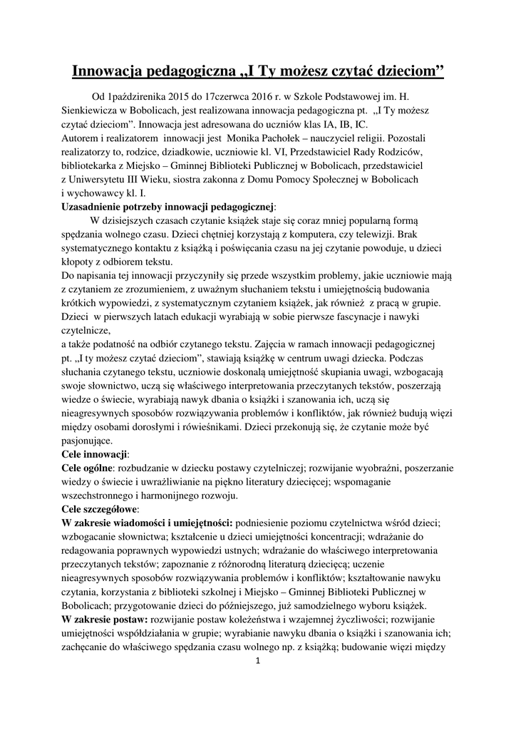 Innowacja pedagogiczna „I Ty możesz czytać dzieciom” Od 1paździrenika 2015 do 17czerwca 2016 r. w Szkole Podstawowej im. H. Sienkiewicza w Bobolicach, jest realizowana innowacja pedagogiczna pt. „I Ty możesz czytać dzieciom”. Innowacja jest adresowana do uczniów klas IA, IB, IC. Autorem i realizatorem innowacji jest Monika Pachołek – nauczyciel religii. Pozostali realizatorzy to, rodzice, dziadkowie, uczniowie kl. VI, Przedstawiciel Rady Rodziców, bibliotekarka z Miejsko – Gminnej Biblioteki Publicznej w Bobolicach, przedstawiciel z Uniwersytetu III Wieku, siostra zakonna z Domu Pomocy Społecznej w Bobolicach i wychowawcy kl. I. Uzasadnienie potrzeby innowacji pedagogicznej: W dzisiejszych czasach czytanie książek staje się coraz mniej popularną formą spędzania wolnego czasu. Dzieci chętniej korzystają z komputera, czy telewizji. Brak systematycznego kontaktu z książką i poświęcania czasu na jej czytanie powoduje, u dzieci kłopoty z odbiorem tekstu. Do napisania tej innowacji przyczyniły się przede wszystkim problemy, jakie uczniowie mają z czytaniem ze zrozumieniem, z uważnym słuchaniem tekstu i umiejętnością budowania krótkich wypowiedzi, z systematycznym czytaniem książek, jak również z pracą w grupie. Dzieci w pierwszych latach edukacji wyrabiają w sobie pierwsze fascynacje i nawyki czytelnicze, a także podatność na odbiór czytanego tekstu. Zajęcia w ramach innowacji pedagogicznej pt. „I ty możesz czytać dzieciom”, stawiają książkę w centrum uwagi dziecka. Podczas słuchania czytanego tekstu, uczniowie doskonalą umiejętność skupiania uwagi, wzbogacają swoje słownictwo, uczą się właściwego interpretowania przeczytanych tekstów, poszerzają wiedze o świecie, wyrabiają nawyk dbania o książki i szanowania ich, uczą się nieagresywnych sposobów rozwiązywania problemów i konfliktów, jak również budują więzi między osobami dorosłymi i rówieśnikami. Dzieci przekonują się, że czytanie może być pasjonujące. Cele innowacji: Cele ogólne: rozbudzanie w dziecku postawy czytelniczej; rozwijanie wyobraźni, poszerzanie wiedzy o świecie i uwrażliwianie na piękno literatury dziecięcej; wspomaganie wszechstronnego i harmonijnego rozwoju. Cele szczegółowe: W zakresie wiadomości i umiejętności: podniesienie poziomu czytelnictwa wśród dzieci; wzbogacanie słownictwa; kształcenie u dzieci umiejętności koncentracji; wdrażanie do redagowania poprawnych wypowiedzi ustnych; wdrażanie do właściwego interpretowania przeczytanych tekstów; zapoznanie z różnorodną literaturą dziecięcą; uczenie nieagresywnych sposobów rozwiązywania problemów i konfliktów; kształtowanie nawyku czytania, korzystania z biblioteki szkolnej i Miejsko – Gminnej Biblioteki Publicznej w Bobolicach; przygotowanie dzieci do późniejszego, już samodzielnego wyboru książek. W zakresie postaw: rozwijanie postaw koleżeństwa i wzajemnej życzliwości; rozwijanie umiejętności współdziałania w grupie; wyrabianie nawyku dbania o książki i szanowania ich; zachęcanie do właściwego spędzania czasu wolnego np. z książką; budowanie więzi między 1 rodzicem, dorosłymi i dzieckiem; włączenie rodziców w życie szkoły; zachęcanie dorosłych do głośnego czytania dzieciom- uświadomienie roli czytania w życiu dziecka. Metody i formy pracy: praca z książką – oglądanie obrazków; praca z tekstem – głośne czytanie; interpretacja tekstów – recytacja wierszy; zabawa w teatr – małe formy teatralne z wykorzystaniem pacynek, kukiełek i rekwizytów; zajęcia biblioteczne w Miejsko - Gminnej Bibliotece Publicznej w Bobolicach; stosowanie różnorodnych technik plastycznych w celu ilustrowania poznanych tekstów; włączanie wyznaczonych osób do czynnego udziału w realizacji innowacji. Zaplanowane działania: utworzenie „Szkolnego Klubu Czytających Rodzin”; akcja ulotkowa dla rodziców; zorganizowanie i zaplanowanie głośnego czytania dzieciom kl. I przez wyznaczone osoby; gazetka ścienna; prace plastyczne adresatów innowacji; zbiórka książek z przeznaczeniem dla dzieci uczęszczających do Ośrodka Rehabilitacyjno – Edukacyjno -Wychowawczego w Bobolicach. Sposób realizacji: nabór uczniów do realizacji innowacji odbywa się na zasadzie powszechnej dostępności; zorganizowanie głośnego czytania przez wyznaczone osoby; pedagogizacja rodziców podczas wrześniowego spotkania z rodzicami – przekazanie ulotek pt. „Czytaj dziecku 20 minut dziennie. Codziennie”; zbiórka książek dla dzieci uczęszczających do Ośrodka Rehabilitacyjno -Edukacyjno-Wychowawczego w Bobolicach. Szczegółowy opis podejmowanych działań: Działania całoroczne: 1 raz w tygodniu po 15 minut, czytanie dzieciom przez nauczycieli; 2 razy w roku wycieczka do Miejsko – Gminnej Biblioteki Publicznej w Bobolicach lub szkolnej biblioteki poznanie przez dzieci pracy bibliotekarza oraz pomieszczeń bibliotecznych- czytelni i wypożyczalni, zachęcenie dzieci do korzystania z księgozbioru, wypożyczenie książek; • na każdym zebraniu z rodzicami, zachęcanie rodziców do codziennego głośnego czytania dzieciom w domu; • zapraszanie: rodziców, dziadków, uczniów kl. VI, Przedstawiciela Rady Rodziców, bibliotekarki Miejsko – Gminnej Biblioteki Publicznej w Bobolicach, przedstawiciela Uniwersytetu III Wieku, siostry zakonna z Domu Pomocy Społecznej w Bobolicach. do czytania dzieciom w kl. I według harmonogramu; Działania comiesięczne: Wrzesień 1. Przekazanie informacji rodzicom uczniom kl. I o utworzeniu „Szkolnego Klubu Czytających Rodzin”; 2. Pedagogizacja rodziców podczas zebrania z rodzicami – rozdanie ulotek, pt. „Czytaj dziecku 20 minut dziennie. Codziennie”; 3. Utworzenie gazetki ściennej pt.„Czytaj dziecku 20 minut dziennie. Codziennie”. • • Październik 1. Rozpoczęcie w kl. I innowacji pedagogicznej pt. „I Ty możesz czytać dzieciom”. 2. Utworzenie „Szk