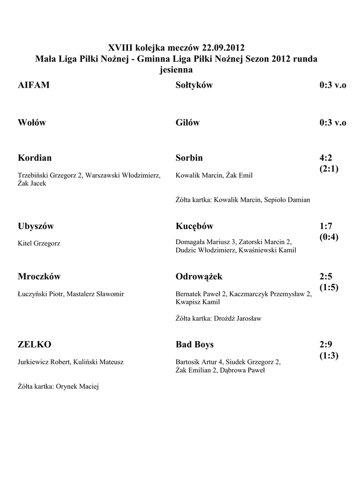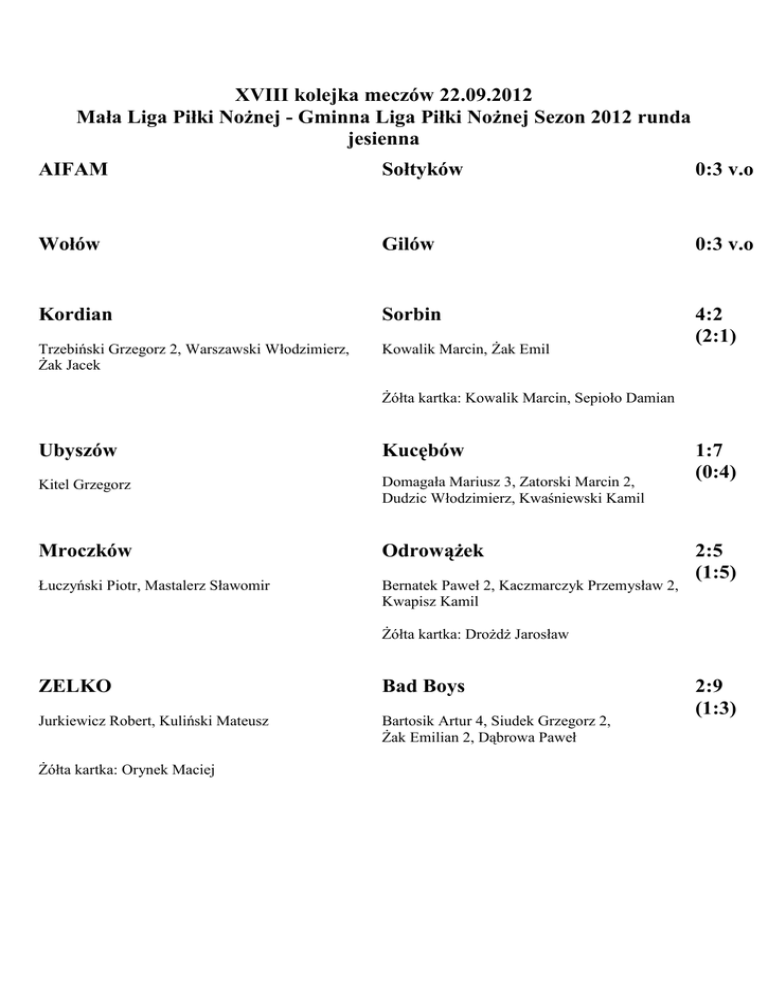 XVIII kolejka meczów 22.09.2012 Mała Liga Piłki Nożnej - Gminna Liga Piłki Nożnej Sezon 2012 runda jesienna AIFAM Sołtyków 0:3 v.o Wołów Gilów 0:3 v.o Kordian Sorbin Trzebiński Grzegorz 2, Warszawski Włodzimierz, Żak Jacek Kowalik Marcin, Żak Emil 4:2 (2:1) Żółta kartka: Kowalik Marcin, Sepioło Damian Ubyszów Kucębów Kitel Grzegorz Domagała Mariusz 3, Zatorski Marcin 2, Dudzic Włodzimierz, Kwaśniewski Kamil Mroczków Odrowążek Łuczyński Piotr, Mastalerz Sławomir Bernatek Paweł 2, Kaczmarczyk Przemysław 2, Kwapisz Kamil 1:7 (0:4) 2:5 (1:5) Żółta kartka: Drożdż Jarosław ZELKO Bad Boys Jurkiewicz Robert, Kuliński Mateusz Bartosik Artur 4, Siudek Grzegorz 2, Żak Emilian 2, Dąbrowa Paweł Żółta kartka: Orynek Maciej 2:9 (1:3)
