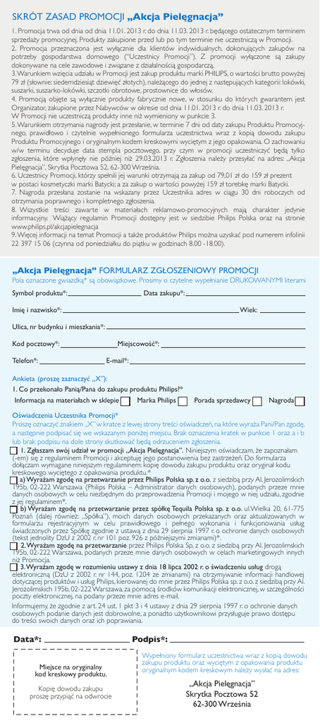 SKRÓT ZASAD PROMOCJI „Akcja Pielęgnacja” 1. Promocja trwa od dnia od dnia 11.01. 2013 r. do dnia 11.03. 2013 r. będącego ostatecznym terminem sprzedaży promocyjnej. Produkty zakupione przed lub po tym terminie nie uczestniczą w Promocji. 2. Promocja przeznaczona jest wyłącznie dla klientów indywidualnych, dokonujących zakupów na potrzeby gospodarstwa domowego (“Uczestnicy Promocji”). Z promocji wyłączone są zakupy dokonywane na cele zawodowe i związane z działalnością gospodarczą. 3. Warunkiem wzięcia udziału w Promocji jest zakup produktu marki PHILIPS, o wartości brutto powyżej 79 zł (słownie: siedemdziesiąt dziewięć złotych), należącego do jednej z następujących kategorii: lokówki, suszarki, suszarko-lokówki, szczotki obrotowe, prostownice do włosów. 4. Promocją objęte są wyłącznie produkty fabrycznie nowe, w stosunku do których gwarantem jest Organizator, zakupione przez Nabywców w okresie od dnia 11.01. 2013 r. do dnia 11.03. 2013 r. W Promocji nie uczestniczą produkty inne niż wymieniony w punkcie 3. 5. Warunkiem otrzymania nagrody jest przesłanie, w terminie 7 dni od daty zakupu Produktu Promocyjnego, prawidłowo i czytelnie wypełnionego formularza uczestnictwa wraz z kopią dowodu zakupu Produktu Promocyjnego i oryginalnym kodem kreskowymi wyciętym z jego opakowania. O zachowaniu w/w terminu decyduje data stempla pocztowego, przy czym w promocji uczestniczyć będą tylko zgłoszenia, które wpłynęły nie później niż 29.03.2013 r. Zgłoszenia należy przesyłać na adres: „Akcja Pielęgnacja”, Skrytka Pocztowa 52, 62-300 Września. 6. Uczestnicy Promocji, którzy spełnili jej warunki otrzymają za zakup od 79,01 zł do 159 zł prezent w postaci kosmetyczki marki Batycki; a za zakup o wartości powyżej 159 zł torebkę marki Batycki. 7. Nagroda przesłana zostanie na wskazany przez Uczestnika adres w ciągu 30 dni roboczych od otrzymania poprawnego i kompletnego zgłoszenia. 8. Wszystkie treści zawarte w materiałach reklamowo-promocyjnych mają charakter jedynie informacyjny. Wiążący regulamin Promocji dostępny jest w siedzibie Philips Polska oraz na stronie www.philips.pl/akcjapielegnacja 9. Więcej informacji na temat Promocji a także produktów Philips można uzyskać pod numerem infolinii 22 397 15 06 (czynna od poniedziałku do piątku w godzinach 8.00 -18.00). „Akcja Pielęgnacja” FORMULARZ ZGŁOSZENIOWY PROMOCJI Pola oznaczone gwiazdką* są obowiązkowe. Prosimy o czytelne wypełnianie DRUKOWANYMI literami Symbol produktu*: Data zakupu*: Imię i nazwisko*: Wiek: Ulica, nr budynku i mieszkania*: Kod pocztowy*: Telefon*: Miejscowość*: E-mail*: Ankieta (proszę zaznaczyć „X”): 1. Co przekonało Panią/Pana do zakupu produktu Philips?* Informacja na materiałach w sklepie Marka Philips Porada sprzedawcy Nagroda Oświadczenia Uczestnika Promocji* Proszę oznaczyć znakiem „X” w kratce z lewej strony treści oświadczeń, na które wyraża Pani/Pan zgodę, a następnie podpisać się we wskazanym poniżej miejscu. Brak oznaczenia kratek w punkcie 1 oraz a i b lub brak podpisu na dole strony skutkować będą odrzuceniem zgłoszenia. 1. Zgłaszam swój udział w promocji „Akcja Pielęgnacja”. Niniejszym oświadczam, że zapoznałam (-em) się z regulaminem Promocji i akceptuję jego postanowienia bez zastrzeżeń. Do formularza dołączam wymagane niniejszym regulaminem: kopię dowodu zakupu produktu oraz oryginał kodu kreskowego wyciętego z opakowania produktu.* a) Wyrażam zgodę na przetwarzanie przez Philips Polska sp. z o.o. z siedzibą przy Al. Jerozolimskich 195b, 02-222 Warszawa (Philips Polska – Administrator danych osobowych), podanych przeze mnie danych osobowych w celu niezbędnym do przeprowadzenia Promocji i mojego w niej udziału, zgodnie z jej regulaminem*. b) Wyrażam zgodę na przetwarzanie przez spółkę Tequila Polska sp. z o.o. ul.Wielka 20, 61-775 Poznań (dalej również: „Spółka”), moich danych osobowych przekazanych oraz aktualizowanych w formularzu rejestracyjnym w celu prawidłowego i pełnego wykonania i funkcjonowania usług świadczonych przez Spółkę zgodnie z ustawą z dnia 29 sierpnia 1997 r. o ochronie danych osobowych (tekst jednolity DzU z 2002 r. nr 101 poz. 926 z późniejszymi zmianami)*. 2. Wyrażam zgodę na przetwarzanie przez Philips Polska Sp. z o.o. z siedzibą przy Al. Jerozolimskich 195b, 02-222 Warszawa, podanych przeze mnie danych osobowych w celach marketingowych innych niż Promocja. 3. Wyrażam zgodę w rozumieniu ustawy z dnia 18 lipca 2002 r. o świadczeniu usług drogą elektroniczną (DzU z 2002 r. nr 144, poz. 1204 ze zmianami) na otrzymywanie informacji handlowej dotyczącej produktów i usług Philips, kierowanej do mnie przez Philips Polska sp. z o.o. z siedzibą przy Al. Jerozolimskich 195b, 02-222 Warszawa, za pomocą środków komunikacji elektronicznej, w szczególności poczty elektronicznej, na podany przeze mnie adres e-mail. Informujemy, że zgodnie z art. 24 ust. 1 pkt 3 i 4 ustawy z dnia 29 sierpnia 1997 r. o ochronie danych osobowych podanie danych jest dobrowolne, a ponadto użytkownikowi przysługuje prawo dostępu do treści swoich danych oraz ich poprawiania. Data*: Miejsce na oryginalny kod kreskowy produktu. Kopię dowodu zakupu proszę przypiąć na odwrocie Podpis*: Wypełniony formularz uczestnictwa wraz z kopią dowodu zakupu produktu oraz wyciętym z opakowania produktu oryginalnym kodem kreskowym należy wysłać na adres: „Akcja Pielęgnacja” Skrytka Pocztowa 52 62-300 Września
