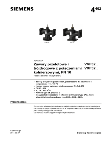 4 VVF32.. 402 VXF32.. ACVATIX™ VVF32.. Zawory przelotowe i trójdrogowe z połączeniami VXF32.. kołnierzowymi, PN 10 Rodzina zaworów o dużym skoku Zawory o wysokich parametrach, przeznaczone dla czynników o temperaturze -10…150 °C Korpus zaworu wykonany z żeliwa szarego EN-GJL-250 DN 15…150 3 kvs 1,6…400 m /h Kołnierz typu 21, projektu B Mogą zostać wyposażone w siłowniki elektryczne typu SAX.. lub w siłowniki elektrohydrauliczne typu SKD.., SKB.., SKC.. Przeznaczenie Do montażu w instalacjach kotłowych, miejskich sieciach ciepłowniczych, instalacjach chłodniczych, grupach grzewczych oraz w zespołach wentylacji i uzdatniania powietrza jako zawory sterujące lub odcinające. Do montażu w zamkniętych obiegach hydraulicznych. CE1N4402pl 2014-03-27 Building Technologies Lista typów Zawory Siłowniki Skok nominalny Siła nominalna Karta katalogowa DN kvs SV PN 10 -10…150 °C VVF32.15-1.6 VVF32.15-2.5 VVF32.15-4 VVF32.25-6.3 VVF32.25-10 VVF32.40-16 VVF32.40-25 VVF32.50-40 VVF32.65-63 2) VVF32.80-100 2) VVF32.100-160 VVF32.125-250 2) VVF32.150-400 Numer magazynowy S55202-V100 S55202-V101 S55202-V102 S55202-V103 S55202-V104 S55202-V105 S55202-V106 S55202-V107 S55202-V108 S55202-V109 S55202-V110 S55202-V111 S55202-V112 Zawory -10…150 °C VXF32.15-1.6 VXF32.15-2.5 VXF32.15-4 VXF32.25-6.3 VXF32.25-10 VXF32.40-16 VXF32.40-25 VXF32.50-40 VXF32.65-63 2) VXF32.80-100 2) VXF32.100-160 VXF32.125-250 2) VXF32.150-400 Numer magazynowy S55202-V113 S55202-V114 S55202-V115 S55202-V116 S55202-V117 S55202-V118 S55202-V119 S55202-V120 S55202-V121 S55202-V122 S55202-V123 S55202-V124 S55202-V125 1) 800 N N4501 Δps Δpmax SKD.. 20 mm 1000 N N4561 Δps Δpmax 3 15 15 15 25 25 40 40 50 65 80 100 125 150 [m /h] 1,6 2,5 4 >50 6,3 10 16 25 40 63 >100 100 160 250 400 SKB.. 2800 N N4564 Δps Δpmax SKC.. 40 mm 2800 N N4566 Δps Δpmax [kPa] 1000 1000 400 550 400 1000 400 - - - 300 190 125 250 160 100 750 350 200 125 300 150 75 450 250 175 200 125 700 450 - - - - - 1) Przeznaczone dla czynników o temperaturze do 130 °C. 2) Charakterystyka zaworu dla wartości kvs wynoszącej 100 m /h począwszy od skoku 70%, 3 3 wartości kvs wynoszącej 160 m /h od 85% skoku i wartości kvs wynoszącej 400 m /h od 90% skoku jest optymalizowana w celu zapewnienia maksymalnego strumienia objętości. 3 Siłowniki Skok nominalny Siła nominalna Karta katalogowa DN kvs SV PN 10 SAX.. SAX.. 1) SKD.. 20 mm 1000 N N4561 800 N N4501 SKB.. SKC.. 40 mm 2800 N N4566 2800 N N4564 Δpmax [kPa] 3 15 15 15 25 25 40 40 50 65 80 100 125 150 [m /h] 1,6 2,5 4 >50 6,3 10 16 25 40 63 >100 100 160 250 400 400 300 150 75 - 100 400 100 50 200 125 80 50 - - - 400 100 - - - - 250 160 100 50 1) Przeznaczone do czynników o temperaturze do 130 °C. 2) Charakterystyka zaworu dla wartości kvs wynoszącej 100 m /h począwszy od skoku 70%, wartości 3 3 kvs wynoszącej 160 m /h od 85% skoku i wartości kvs wynoszącej 400 m /h od 90% skoku jest optymalizowana w celu zapewnienia maksymalnego strumienia objętości. DN kvs Sv ∆ps ∆pmax 3 = średnica nominalna = nominalne natężenie przepływu zimnej wody (5…30°C) przez całkowicie otwarty zawór (H100), przy różnicy ciśnienia wynoszącej 100 kPa (1 bar). = iloraz szerokości zakresów = maksymalna dopuszczalna różnica ciśnienia, przy której zawór sterowany siłownikiem zamknie się bezpiecznie pokonując ciśnienie = maksymalna dopuszczalna różnica ciśnienia na przelocie zaworu (drodze regulacji), dla całego zakresu pozycjonowania zaworu sterowanego siłownikiem 2 / 11 Siemens Building Technologies 2- and 3-port valves with flanged connections, PN 10 CE1N4402pl 2014-03-27 Sposób zamawiania Przykład Oznaczenie typu Numer magazynowy Opis VXF32.15-1.6 S55202-V113 Zawór trójdrogowy z kołnierzem, PN 10 SKD32.50 SKD32.50 Siłownik elektrohydrauliczny Dostawa Zawory, siłowniki oraz wyposażenie dodatkowe są pakowane i dostarczane jako oddzielne elementy. Uwaga Na miejscu należy zapewnić przeciwkołnierze, śruby oraz uszczelki. Części zamienne, numery wersji Patrz strona 11 Urządzenia współpracujące Oznaczenie typu Opis SAX31.00 S55150-A105 SAX31.03 S55150-A106 SAX61.03 SAX61.03U S55150-A100 S55150-A100-A100 SAX81.00 S55150-A102 SAX81.03 SAX81.03U S55150-A103 S55150-A103-A100 SKD32.21 SKD32.21 SKD32.50 SKD32.50 SKD32.51 SKD32.51 SKD60 SKD60 SKD62 SKD62U SKD62 SKD62U SKD62UA SKD62UA SKD82.50 SKD82.50U SKD82.50 SKD82.50U SKD82.51 SKD82.51U SKD82.51 SKD82.51U SKB32.50 SKB32.50 SKB32.51 SKB32.51 SKB60 SKB60 SKB62 SKB62U SKB62 SKB62U SKB62UA SKB62UA SKB82.50 SKB82.50U SKB82.50 SKB82.50U SKB82.51 SKB82.51U SKB82.51 SKB82.51U SKC32.60 SKC32.60 SKC32.61 SKC32.61 SKC60 SKC60 SKC62 SKC62U SKC62 SKC62U SKC62UA SKC62UA SKC82.60 SKC82.60U SKC82.60 SKC82.60U SKC82.61 SKC82.61U SKC82.61 SKC82.61U Skok Siła nominal nominalna ny 20 mm Napięcie robocze Sygnał sterujący 230 V AC 3-stawny 800 N 24 V AC 24 V DC Czas powrot u Czas przebiegu spręży ny 120 s 0…10 V 4…20 mA 0…1000 Ω - 3-stawny - - 3-stawny 30 s Naciśnij i ustaw 2) 3) - 1) - - 1) 120 s 0…10 V 4…20 mA 0…1000 Ω 1000 N Funkcje dodatkowe 1) Otwieranie: 30 s Zamykanie: 10 s 8s 20 mm Pokrętło ręcznego sterowania 120 s 8s 230 V AC 30 s LED 15 s Otwieranie: 30 s Zamykanie: 15 s Przekręcić, położenie zostaje zachowane 2) 4) 24 V AC 3-stawny 120 s - 1) 120 s - 1) Otwieranie: 120 s Zamykanie: 10 s 8s 230 V AC 3-stawny 10 s - 20 mm 0…10 V 4…20 mA 0…1000 Ω 2800 N 10 s 24 V AC Przekręcić, położenie zostaje zachowane 2) 4) 3-stawny 120 s - 1) 120 s - 1) Otwieranie: 120 s Zamykanie: 20 s 10 s 230 V AC 3-stawny 18 s - 40 mm 0…10 V 4…20 mA 0…1000 Ω 2800 N 20 s 24 V AC Przekręcić, położenie zostaje zachowane 2) 4) 3-stawny 120 s - 1) 18 s 1) 2) 3) 4) Przełącznik pomocniczy, potencjometr. Sygnał zwrotny położenia, sterowanie wymuszone, zmiana charakterystyki zaworu. Opcjonalnie: sterowanie sekwencyjne, wybór kierunku pracy. Plus sterowanie sekwencyjne, ograniczenie skoku i wybór k