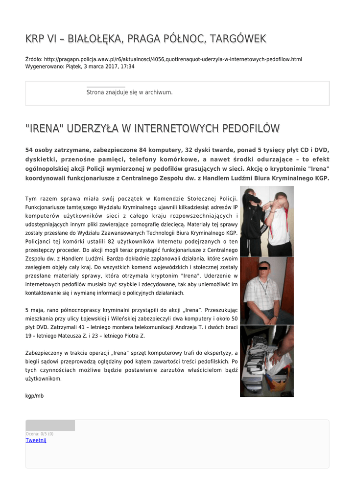 KRP VI – BIAŁOŁĘKA, PRAGA PÓŁNOC, TARGÓWEK Źródło: http://pragapn.policja.waw.pl/r6/aktualnosci/4056,quotIrenaquot-uderzyla-w-internetowych-pedofilow.html Wygenerowano: Piątek, 3 marca 2017, 17:34 Strona znajduje się w archiwum. "IRENA" UDERZYŁA W INTERNETOWYCH PEDOFILÓW 54 osoby zatrzymane, zabezpieczone 84 komputery, 32 dyski twarde, ponad 5 tysięcy płyt CD i DVD, dyskietki, przenośne pamięci, telefony komórkowe, a nawet środki odurzające – to efekt ogólnopolskiej akcji Policji wymierzonej w pedofilów grasujących w sieci. Akcję o kryptonimie "Irena" koordynowali funkcjonariusze z Centralnego Zespołu dw. z Handlem Ludźmi Biura Kryminalnego KGP. Tym razem sprawa miała swój początek w Komendzie Stołecznej Policji. Funkcjonariusze tamtejszego Wydziału Kryminalnego ujawnili kilkadziesiąt adresów IP komputerów użytkowników sieci z całego kraju rozpowszechniających i udostępniających innym pliki zawierające pornografię dziecięcą. Materiały tej sprawy zostały przesłane do Wydziału Zaawansowanych Technologii Biura Kryminalnego KGP. Policjanci tej komórki ustalili 82 użytkowników Internetu podejrzanych o ten przestępczy proceder. Do akcji mogli teraz przystąpić funkcjonariusze z Centralnego Zespołu dw. z Handlem Ludźmi. Bardzo dokładnie zaplanowali działania, które swoim zasięgiem objęły cały kraj. Do wszystkich komend wojewódzkich i stołecznej zostały przesłane materiały sprawy, która otrzymała kryptonim "Irena". Uderzenie w internetowych pedofilów musiało być szybkie i zdecydowane, tak aby uniemożliwić im kontaktowanie się i wymianę informacji o policyjnych działaniach. 5 maja, rano północnoprascy kryminalni przystąpili do akcji „Irena”. Przeszukując mieszkania przy ulicy Łojewskiej i Wileńskiej zabezpieczyli dwa komputery i około 50 płyt DVD. Zatrzymali 41 – letniego montera telekomunikacji Andrzeja T. i dwóch braci 19 – letniego Mateusza Z. i 23 – letniego Piotra Z. Zabezpieczony w trakcie operacji „Irena” sprzęt komputerowy trafi do ekspertyzy, a biegli sądowi przeprowadzą oględziny pod kątem zawartości treści pedofilskich. Po tych czynnościach możliwe będzie postawienie zarzutów właścicielom bądź użytkownikom. kgp/mb Ocena: 0/5 (0) Tweetnij