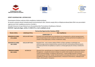 OFERTY KOOPERACYJNE- LISTOPAD 2013 Prezentujemy Państwu wybrane oferty współpracy międzynarodowej. W sprawie uzyskania danych teleadresowych prezentowanych ofert, złożenia swojej oferty w Międzynarodowej Bazie Ofert oraz pozostałych zagranicznych ofert współpracy prosimy o kontakt z: Ośrodek Enterprise Europe Network przy Staropolskiej Izbie Przemysłowo-Handlowej w Kielcach, KONTAKT: Agnieszka Bygar, tel/fax: 41 368 02 78, e-mail: [email protected] Partnership Opportunities Database (POD) Opis współpracy KOMPUTERY I IT Numer oferty Lokalizacja firmy BOUK20131112001 27.11.2013 WIELKA BRYTANIA Brytyjska firma specjalizująca się w doradztwie oraz rozwiązaniach w zakresie oprogramowań, które przyspieszają procesy zarządzania dokumentami, poszukuje partnerów do wspólpracy na zasadzie umowy agencyjnej i umowy o świadczeniu usług. BOUK20131113002 18.11.2013 WIELKA BRYTANIA Brytyjska firma - autor zestawu aplkacji HTML5 na iPada, opartego na subskrybcji oraz elektronicznego systemu bezpieczeństwa żywności dla kuchni przemysłowych/komercyjnych, poszukuje partnerów do współpracy w oparciu o umowę agencyjną lub umowę o świadczeniu usług. TRSK20131106001 06.11.2013 SŁOWACJA Słowacka firma, specjalizująca się w integracji niezależnych technologii bezpieczeństwa (Identity Management - zarządzanie prawami dostępu do zasobów informacyjnych; wykrywanie pożaru; systemy kontroli dostępu i zarządzania zdarzeniami), w pełni konfigurowalnych rozwiązań wykorzystujących interfejs i zasady interoperacyjności; poszukuje partnerów w celu zaspokojenia szczególnych potrzeb w zakresie bezpieczeństwa, w obszarach infrastruktury, niebezpiecznych miejsc, ochrony granic i transportu. BOES20131031003 04.12.2013 BOES20131030002 04.12.2013 HISZPANIA Hiszpański wiodący producent atramentu poszukuje agentów i dystrybutorów. HISZPANIA Młoda hiszpańska firma technologiczna specjalizująca się w rozwoju, implementacji i integracji projektów inżynieryjnych związanych z zarządzaniem aktywami, poszukuje pośredników handlowych. TOHR20130730001 05.12.2013 CHORWACJA Chorwacka firma z sektora IT specjalizująca się w aplikacjach webowych i zaawansowanych technologiach Java do rozwoju aplikacji, oferuje know-how i narzędzia wizualne do systemów IT pozyskiwania strategicznych długów. Firma szuka współpracy technicznej w adaptacji do specjalnych potrzeb oraz współpracy handlowej ze wsparciem technicznym. MATERIAŁY I USŁUGI BUDOWLANE BRUK20131101001 19.11.2013 WIELKA BRYTANIA 20130528026 BO 05.11.2013 CHORWACJA Brytyjska firma - menadżer rządowego projektu dotyczącego infrastruktury drogowej w Afryce, poszukuje do współpracy firm specjalizujących się w utrzymaniu i rehabilitacji nawierzchni dróg. Poszukiwani będą partnerzy mogący konkurować cenowo z oferentami z Południowo-wschodniej Azji. Chorwacka filia niemieckiej firmy specjalizująca się w urządzeniach do recyklingu, oferuje dystrybucję i podwykonawstwo oraz współpracę joint venture. BRANŻA SPOŻYWCZA Chorwacki producent cukru, melasy i pulpy buraczanej poszukuje dystrybutorów. BOHR20131103002 02.12.2013 BOES20131011002 21.11.2013 CHORWACJA HISZPANIA Hiszpańska firma specjalizująca się w produkcji dodatków funkcjonalnych dla przemysłu spożywczego, w szczególności dla przemysłu mięsnego poszukuje dystrybutorów i importerów. BOES20131009002 20.11.2013 HISZPANIA Hiszpańska firma zajmuje się przetwarzaniem produktów ze świni iberyjskiej (szynka, łopatka i polędwica)oraz produkcją kiełbas i wędzonek. Firma poszukuje partnerów handlowych z krajów europejskich w celu dystrybucji swoich produktów. BOPT20131008001 15.11.2013 PORTUGALIA Portugalski producent Azorskich dyni, miodu, szafranu i chili (całe, miazga, proszek, itp.) poszukuje pośredników handlowych (najlepiej hurtowników). DORADZTWO I KONSULTACJE 20080910035 BO 14.11.2013 HISZPANIA Hiszpańska firma specjalizująca się w następujących obszarach: badania i rekrutacja, zarządzanie talentami / ocena, szkolenia i doradztwo HR, oferuje joint venture i / lub outsourcing. BRPT20131017001 03.12.2013 PORTUGALIA Portugalska firma zlokalizowana w Regionie Centrum, specjalizująca się w międzynarodowym pośrednictwie pomiędzy firmami oraz Uniwersytetami a firmami, szczególnie w sektorze ICT oraz rolno-spożywczym, poszukuje innych firm w UE i Afryce zajmujących się międzynarodowymi pośrednictwem w biznesie w celu podpisania umowy o świadczeniu usług. BOUK20130729001 02.12.2013 WIELKA BRYTANIA Wielokrotnie nagradzana firma z Wielkiej Brytanii, specjalizująca się w projektowaniu i produkcji oświetlenia LED dla wymagających klientów na całym świecie, poszukuje doświadczonych dystrybutorów. BOUK20131120001 27.11.2013 WIELKA BRYTANIA Brytyjska firma, projektująca i produkująca wysokiej jakości plastikowe pojemniki na śmieci, produkty rolne oraz meble zewnętrzne/uliczne (ławki, kosze, latarnie, bilbordy...), poszukuje przedstawicieli handlowych lub dystrybutorów. Od partnerów wymagana będzie specjalistyczna wiedza nt. odpadów, rynku ochrony środowiska i oczyszczania. BONO20131007001 31.10.2013 NORWEGIA Norweska firma z branży opakowań zaprojektowała składaną miskę wykonaną z kartonu. Jest to prosty, ale elegancki talerz, używany do serwowania małych porocji podczas kampanii marketingowych lub promocji nowych produktów na targach / w sklepach. Firma poszukuje agentów i dystrybutorów. BOES20131010002 31.10.2013 HISZPANIA Hiszpańska firma specjalizująca się w produkcji sof i foteli poszukuje agentów, przedstawicieli i dystrybutorów. BRES20131106001 HISZPANIA Hiszpańska firma działająca w branży ochrony środowiska specjalizuje się w dziedzinie gospodarki odpadami i oczyszczania ścieków. Firma jest zainteresowana zakupem lekkich materiałów, INNE BRANŻE stosowanych w ekstremalnych warunkach, które nie ulegają deformacji, w celu produkcji koszy na śmieci. Firma poszu