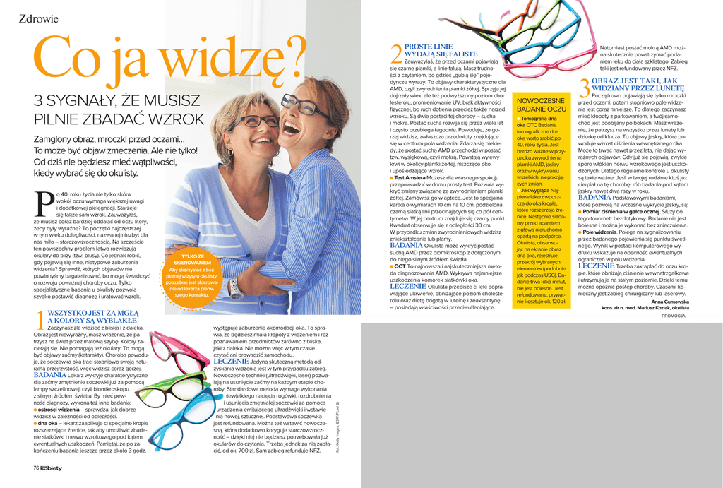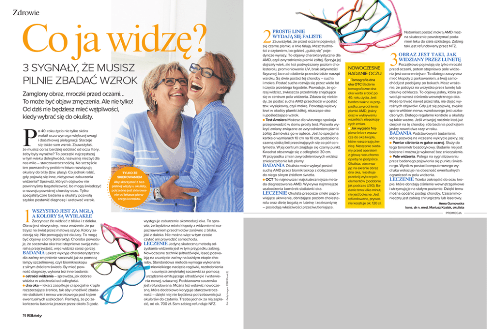 Zdrowie Co ja widzę? 2 Zauważyłaś, że przed oczami pojawiają się czarne plamki, a linie falują. Masz trudności z czytaniem, bo gdzieś „gubią się” pojedyncze wyrazy. To objawy charakterystyczne dla AMD, czyli zwyrodnienia plamki żółtej. Sprzyja jej dojrzały wiek, ale też podwyższony poziom cholesterolu, promieniowanie UV, brak aktywności fizycznej, bo ruch dotlenia przecież także narząd wzroku. Są dwie postaci tej choroby – sucha i mokra. Postać sucha rozwija się przez wiele lat i często przebiega łagodnie. Powoduje, że gorzej widzisz, zwłaszcza przedmioty znajdujące się w centrum pola widzenia. Zdarza się niekiedy, że postać sucha AMD przechodzi w postać tzw. wysiękową, czyli mokrą. Powstają wylewy krwi w okolicy plamki żółtej, niszczące oko i upośledzające wzrok. D Test Amslera Możesz dla własnego spokoju przeprowadzić w domu prosty test. Pozwala wykryć zmiany związane ze zwyrodnieniem plamki żółtej. Zamówisz go w aptece. Jest to specjalna kartka o wymiarach 10 cm na 10 cm, podzielona czarną siatką linii przecinających się co pół centymetra. W jej centrum znajduje się czarny punkt. Kwadrat obserwuje się z odległości 30 cm. W przypadku zmian zwyrodnieniowych widzisz zniekształcenia lub plamy. BADANIA Okulista może wykryć postać suchą AMD przez biomikroskop z dołączonym do niego silnym źródłem światła. D OCT To najnowsza i najskuteczniejsza metoda diagnozowania AMD. Wykrywa najmniejsze uszkodzenia komórek siatkówki oka. LECZENIE Okulista przepisze ci leki poprawiające ukrwienie, obniżające poziom cholesterolu oraz dietę bogatą w luteinę i zeaksantynę – posiadają właściwości przeciwutleniające. 3 SYGNAŁY, ŻE MUSISZ PILNIE ZBADAĆ WZROK Zamglony obraz, mroczki przed oczami… To może być objaw zmęczenia. Ale nie tylko! Od dziś nie będziesz mieć wątpliwości, kiedy wybrać się do okulisty. P Zaczynasz źle widzieć z bliska i z daleka. Obraz jest niewyraźny, masz wrażenie, że patrzysz na świat przez matową szybę. Kolory zacierają się. Nie pomagają też okulary. To mogą być objawy zaćmy (katarakty). Choroba powoduje, że soczewka oka traci stopniowo swoją naturalną przejrzystość, więc widzisz coraz gorzej. BADANIA Lekarz wykryje charakterystyczne dla zaćmy zmętnienie soczewki już za pomocą lampy szczelinowej, czyli biomikroskopu z silnym źródłem światła. By mieć pewność diagnozy, wykona też inne badania: D ostrości widzenia – sprawdza, jak dobrze widzisz w zależności od odległości. D dna oka – lekarz zaaplikuje ci specjalne krople rozszerzające źrenice, tak aby umożliwić zbadanie siatkówki i nerwu wzrokowego pod kątem ewentualnych uszkodzeń. Pamiętaj, że po zakończeniu badania jeszcze przez około 3 godz. 76 podawa- 3 OBRAZ JEST TAKI, JAK WIDZIANY PRZEZ LUNETĘ NOWOCZESNE BADANIE OCZU D Tomografia dna oka OTC Badanie tomograficzne dna oka warto zrobić po 40. roku życia. Jest bardzo ważne w przypadku zwyrodnienia plamki AMD, jaskry oraz w wykrywaniu wszelkich, niepokojących zmian. D Jak wygląda Najpierw lekarz wpuszcza do oka krople, które rozszerzają źrenicę. Następnie siadamy przed aparatem z głową nieruchomo opartą na podpórce. Okulista, obserwując na ekranie obraz dna oka, rejestruje przekrój wybranych elementów (podobnie jak podczas USG). Badanie trwa kilka minut, nie jest bolesne. Jest refundowane, prywatnie kosztuje ok. 120 zł. Początkowo pojawiają się tylko mroczki przed oczami, potem stopniowo pole widzenia jest coraz mniejsze. To dlatego zaczynasz mieć kłopoty z parkowaniem, a twój samochód jest poobijany po bokach. Masz wrażenie, że patrzysz na wszystko przez lunetę lub dziurkę od klucza. To objawy jaskry, która powoduje wzrost ciśnienia wewnętrznego oka. Może to trwać nawet przez lata, nie dając wyraźnych objawów. Gdy już się pojawią, zwykle sporo włókien nerwu wzrokowego jest uszkodzonych. Dlatego regularne kontrole u okulisty są takie ważne. Jeśli w twojej rodzinie ktoś już cierpiał na tę chorobę, rób badania pod kątem jaskry nawet dwa razy w roku. BADANIA Podstawowymi badaniami, które pozwolą na wczesne wykrycie jaskry, są: D Pomiar ciśnienia w gałce ocznej. Służy do tego tonometr bezdotykowy. Badanie nie jest bolesne i można je wykonać bez znieczulenia. D Pole widzenia. Polega na sygnalizowaniu przez badanego pojawienia się punktu świetlnego. Wynik w postaci komputerowego wydruku wskazuje na obecność ewentualnych ograniczeń w polu widzenia. LECZENIE Trzeba zakraplać do oczu krople, które obniżają ciśnienie wewnątrzgałkowe i utrzymują je na stałym poziomie. Dzięki temu można opóźnić postęp choroby. Czasami konieczny jest zabieg chirurgiczny lub laserowy. Anna Gumowska kons. dr n. med. Mariusz Koziak, okulista PROMOCJA występuje zaburzenie akomodacji oka. To sprawia, że będziesz miała kłopoty z widzeniem i rozpoznawaniem przedmiotów zarówno z bliska, jaki z daleka. Nie można więc w tym czasie czytać ani prowadzić samochodu. LECZENIE Jedyną skuteczną metodą odzyskania widzenia jest w tym przypadku zabieg. Nowoczesne techniki (ultradźwięki, laser) pozwalają na usunięcie zaćmy na każdym etapie choroby. Standardowa metoda wymaga wykonania niewielkiego nacięcia rogówki, rozdrobnienia i usunięcia zmętniałej soczewki za pomocą urządzenia emitującego ultradźwięki i wstawienia nowej, sztucznej. Podstawowa soczewka jest refundowana. Można też wstawić nowoczesną, która dodatkowo koryguje starczowzroczność – dzięki niej nie będziesz potrzebowała już okularów do czytania. Trzeba jednak za nią zapłacić, od ok. 700 zł. Sam zabieg refunduje NFZ. Fot.: Getty Images, mat. prasowe 1 WSZYSTKO JEST ZA MGŁĄ A KOLORY SĄ WYBLAKŁE TYLKO TrzebaZE SKIEROWANIEM fdfdffdff fdfdfdf Aby skorzystać z bezkoniecznie przyjąć płatnej wizyty u okulisty, środki przeciwbólowe i potrzebne jest skierowarozkurczowe. Bywa, nie od le