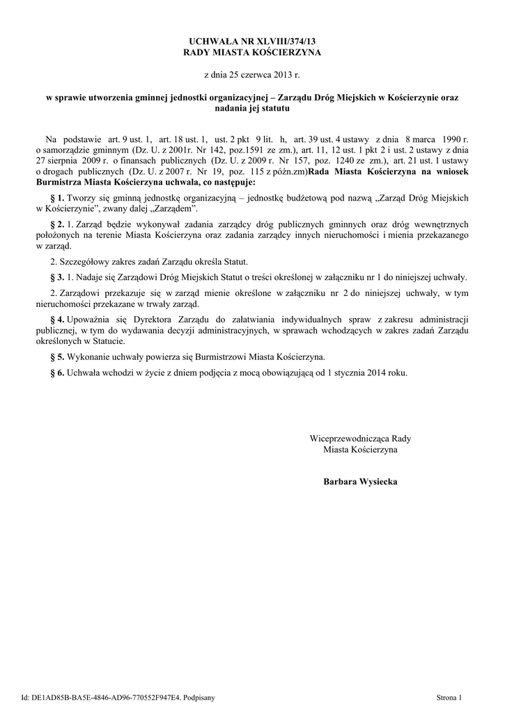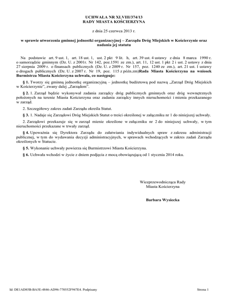 UCHWAŁA NR XLVIII/374/13 RADY MIASTA KOŚCIERZYNA z dnia 25 czerwca 2013 r. w sprawie utworzenia gminnej jednostki organizacyjnej – Zarządu Dróg Miejskich w Kościerzynie oraz nadania jej statutu Na podstawie art. 9 ust. 1, art. 18 ust. 1, ust. 2 pkt 9 lit. h, art. 39 ust. 4 ustawy z dnia 8 marca 1990 r. o samorządzie gminnym (Dz. U. z 2001r. Nr 142, poz.1591 ze zm.), art. 11, 12 ust. 1 pkt 2 i ust. 2 ustawy z dnia 27 sierpnia 2009 r. o finansach publicznych (Dz. U. z 2009 r. Nr 157, poz. 1240 ze zm.), art. 21 ust. 1 ustawy o drogach publicznych (Dz. U. z 2007 r. Nr 19, poz. 115 z późn.zm)Rada Miasta Kościerzyna na wniosek Burmistrza Miasta Kościerzyna uchwala, co następuje: § 1. Tworzy się gminną jednostkę organizacyjną – jednostkę budżetową pod nazwą „Zarząd Dróg Miejskich w Kościerzynie”, zwany dalej „Zarządem”. § 2. 1. Zarząd będzie wykonywał zadania zarządcy dróg publicznych gminnych oraz dróg wewnętrznych położonych na terenie Miasta Kościerzyna oraz zadania zarządcy innych nieruchomości i mienia przekazanego w zarząd. 2. Szczegółowy zakres zadań Zarządu określa Statut. § 3. 1. Nadaje się Zarządowi Dróg Miejskich Statut o treści określonej w załączniku nr 1 do niniejszej uchwały. 2. Zarządowi przekazuje się w zarząd mienie określone w załączniku nr 2 do niniejszej uchwały, w tym nieruchomości przekazane w trwały zarząd. § 4. Upoważnia się Dyrektora Zarządu do załatwiania indywidualnych spraw z zakresu administracji publicznej, w tym do wydawania decyzji administracyjnych, w sprawach wchodzących w zakres zadań Zarządu określonych w Statucie. § 5. Wykonanie uchwały powierza się Burmistrzowi Miasta Kościerzyna. § 6. Uchwała wchodzi w życie z dniem podjęcia z mocą obowiązującą od 1 stycznia 2014 roku. Wiceprzewodnicząca Rady Miasta Kościerzyna Barbara Wysiecka Id: DE1AD85B-BA5E-4846-AD96-770552F947E4. Podpisany Strona 1 Załącznik Nr 1 do Uchwały Nr .................... Rady Miasta Kościerzyna z dnia 25 czerwca 2013 r. STATUT ZARZĄDU DRÓG MIEJSKICH W KOŚCIERZYNIE Rozdział 1. POSTANOWIENIA OGÓLNE I ZAKRES DZIAŁANIA ZARZĄDU § 1. 1. Jednostka o nazwie „Zarząd Dróg Miejskich w Kościerzynie”, zwany w dalszej części statutu „Zarządem”, jest jednostką organizacyjną Gminy Miejskiej Kościerzyna. 2. Zarząd ma siedzibę w Kościerzynie. 3. Zarząd używa pieczęci o treści „Zarząd Dróg Miejskich w Kościerzynie”. 4. Przedmiotem działalności Zarządu jest: 1) wykonywanie zadań zarządcy gminnych dróg publicznych oraz dróg wewnętrznych w granicach administracyjnych miasta Kościerzyny; 2) wykonywanie zadań zarządcy innych nieruchomości i mienia przekazanego w zarząd na podstawie uchwały Rady Miasta Kościerzyna; 3) opracowywanie projektów planów rozwoju sieci drogowej oraz bieżące informowanie o tych planach organów właściwych do sporządzania miejscowych planów zagospodarowania przestrzennego; 4) opracowywanie projektów planów finansowania budowy, przebudowy, remontu, utrzymania i ochrony dróg oraz drogowych obiektów inżynierskich; 5) pełnienie funkcji inwestora; 6) utrzymanie nawierzchni dróg, chodników, drogowych obiektów inżynierskich, urządzeń zabezpieczających ruch i innych urządzeń związanych z drogami; 7) realizacja zadań w zakresie inżynierii ruchu; 8) koordynacja robót w pasie drogowym; 9) wydawanie zezwoleń na zajęcie pasa drogowego i zjazdy z dróg oraz pobieranie opłat i kar pieniężnych; 10) prowadzenie ewidencji dróg, obiektów mostowych, tuneli, przepustów oraz udostępnianie ich na żądanie uprawnionym organom; 11) sporządzanie informacji o drogach publicznych oraz przekazywanie ich Generalnemu Dyrektorowi Dróg Krajowych i Autostrad; 12) przeprowadzanie okresowych kontroli stanu dróg i drogowych obiektów inżynierskich, ze szczególnym uwzględnieniem ich wpływu na stan bezpieczeństwa ruchu drogowego; 13) wykonywanie robót interwencyjnych, robót utrzymaniowych i zabezpieczających; 14) przeciwdziałanie niszczeniu dróg przez ich użytkowników; 15) przeciwdziałanie niekorzystnym przeobrażeniom środowiska mogącym powstać lub powstającym w następstwie budowy lub utrzymania dróg; 16) wprowadzanie ograniczeń lub zamykanie dróg i drogowych obiektów inżynierskich dla ruchu oraz wyznaczanie objazdów drogami różnej kategorii, gdy występuje bezpośrednie zagrożenie bezpieczeństwa osób lub mienia; 17) dokonywanie okresowych pomiarów ruchu drogowego; 18) utrzymywanie zieleni przydrożnej, w tym sadzenie i usuwanie drzew oraz krzewów; Id: DE1AD85B-BA5E-4846-AD96-770552F947E4. Podpisany Strona 1 19) prowadzenie płatnej strefy parkowania; 20) rozpatrywanie roszczeń użytkowników dróg i innych zarządzanych nieruchomości związanych z ich nienależytym utrzymaniem (w tym zapewnienie obsługi prawnej postępowań toczących się w tym zakresie przed sądami powszechnymi oraz ubezpieczycielami); 21) zadania z zakresu ochrony środowiska; 22) uzgadnianie i opiniowanie, w zakresie swojej właściwości, dokumentacji projektowej, a w szczególności sieci infrastruktury (w tym kanalizacji deszczowej, kanalizacji sanitarnej, oświetlenia ulic, sieci wodociągowych, ciepłowniczych, energetycznych, gazowych, teletechnicznych); 23) budowa i utrzymanie kanalizacji deszczowej oraz wydawanie warunków przyłączenia do miejskiej sieci kanalizacji deszczowej; 24) utrzymanie cieków naturalnych, rowów odwadniających i zbiorników retencyjnych; 25) budowa i utrzymanie oświetlenia ulicznego; 26) organizowanie i nadzorowanie komunikacji miejskiej; 27) utrzymywanie grobów wojennych; 28) okolicznościowe dekorowanie ulic miasta; 29) prowadzenie inwestycji związanych z zarządzanymi nieruchomościami oraz mieniem i w zakresie zadań określonych w niniejszym paragrafie; 30) pełnienie funkcji inwestora zastępczego dla Gminy Miejskiej Kościerzyna oraz innych jej jednostek organizacyjnych. § 2. Zarząd